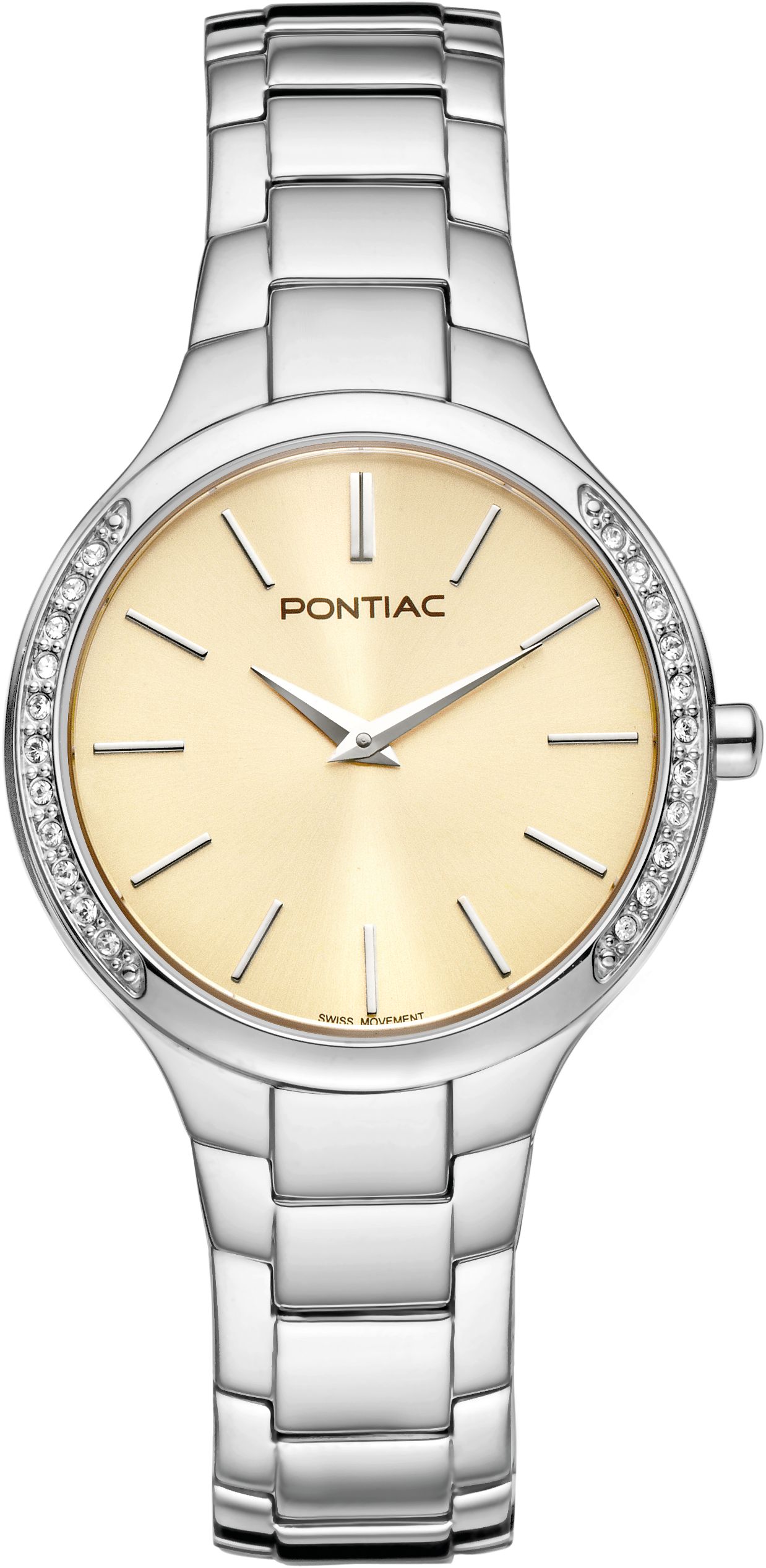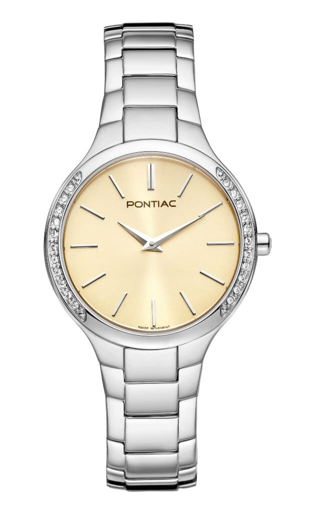 Dit Pontiac horloge met de referentie P10090 is een model uit de Lyra collection. Het horloge is vervaardigd uit een 32 mm staal kast gezet met zirconium steentjes. De parkement, beige wijzerplaat wordt beschermd door een saffier glas. Deze Pontiac wordt voorgesteld op een stalen band.