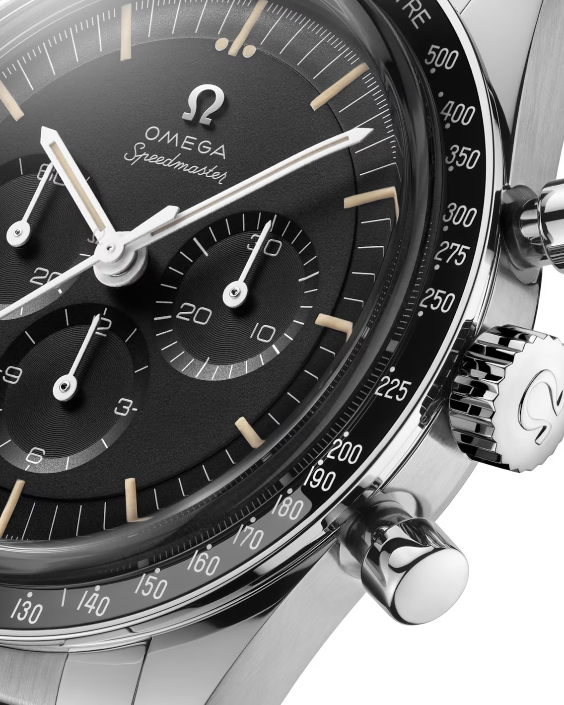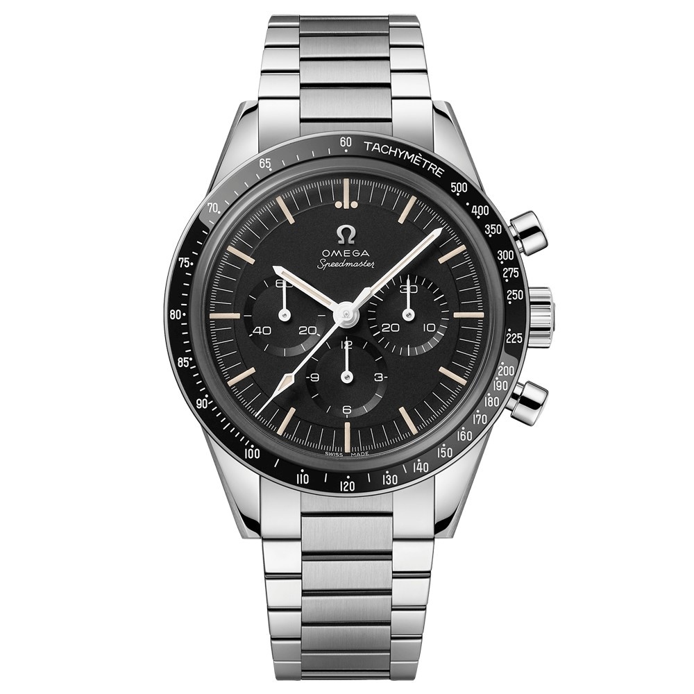 De kast, met een diameter van 39,7 mm, is vervaardigd uit hoogwaardig roestvrij staal en geïnspireerd op het ontwerp van de derde generatie Speedmaster – gedragen tijdens de eerste Amerikaanse ruimtewandeling in 1965. De lunette is vervaardigd uit gepolijst zwart keramiek (ZrO₂) en afgewerkt met een witte emaille tachymeterschaal, wat een perfecte balans biedt tussen duurzaamheid en elegantie.