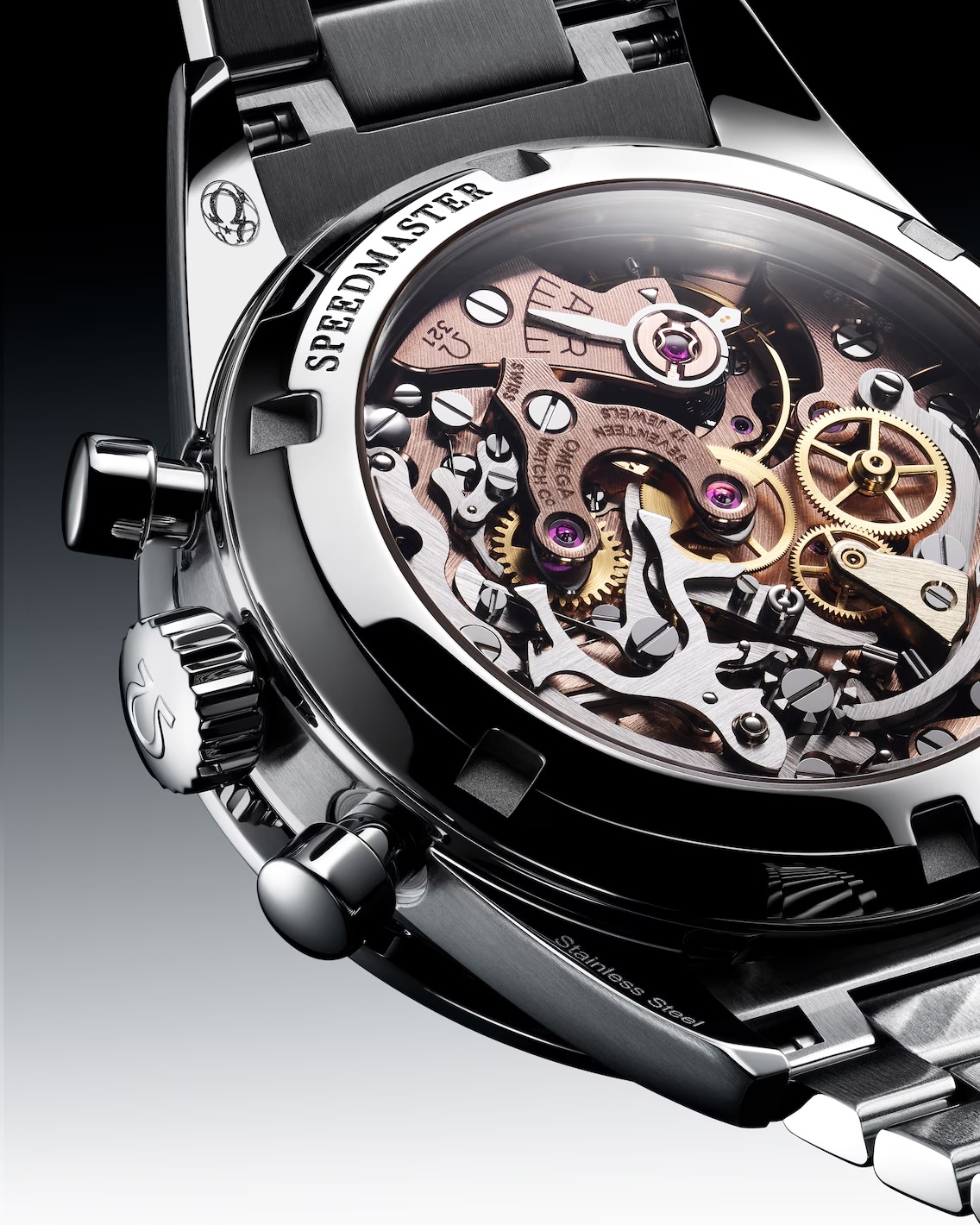De zwarte wijzerplaat bevat de klassieke Moonwatch-wijzers, een vintage OMEGA-logo, en drie subdials: een kleine secondewijzerplaat, een 30-minuten- en een 12-uursregistratie, aangevuld met een centrale chronograafwijzer. De achterkant van het horloge is uitgerust met saffierglas, waardoor het prestigieuze kaliber 321 zichtbaar is – een technisch meesterwerk dat opnieuw tot leven is gebracht door OMEGA’s vakmanschap.