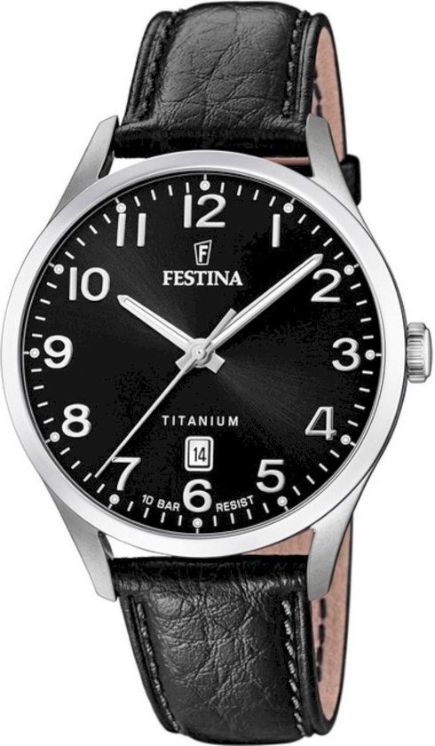 Dit Festina horloge met referentie F20467/3 is een herenhorloge met een zwarte wijzerplaat. Het heren Festina horloge heeft een titanium kast en een lederen armband. Het Festina horloge is een quartz horloge.