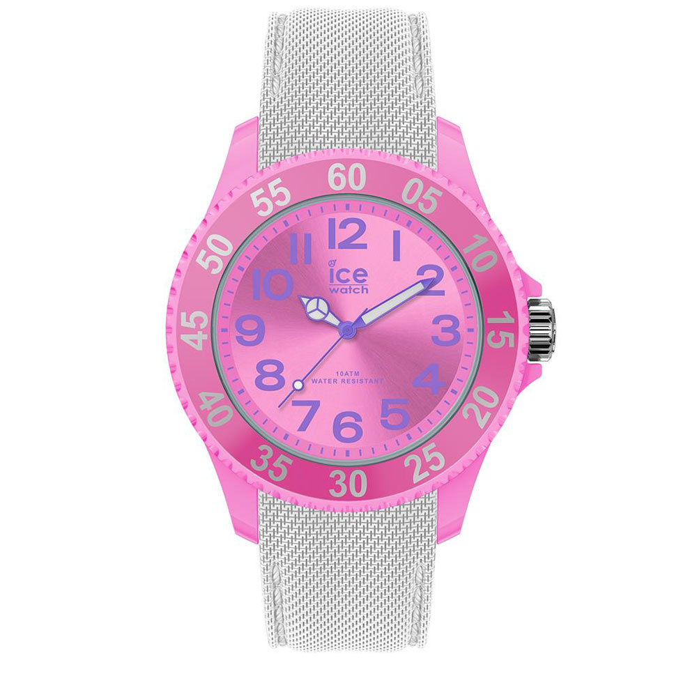Dit ICE Cartoon horloge 017728 heeft een witte kleur met een roze kast. De roze wijzerplaat is versierd met paarse wijzers en cijfers. De getextureerde rubber siliconen band heeft ook een witte kleur.