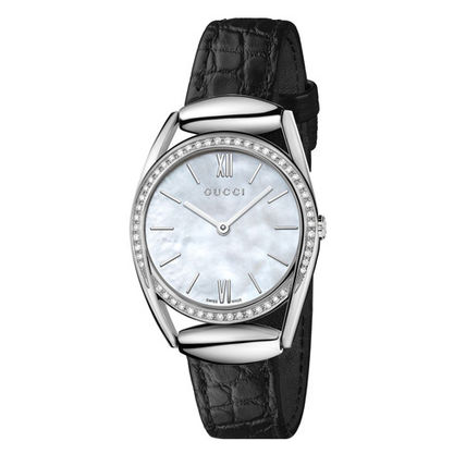 Dit dames Gucci horloge met de referentie YA140506 uit de Gucci HORSEBIT collectie is een quartz uurwerk met Zwitsers binnenwerk. Dit horloge heeft een 30mm stalen kast. De parelmoer wijzerplaat wordt beschermd door saffier glas. Het horloge is afgewerkt met een zwarte lederen band en diamanten op de kast.