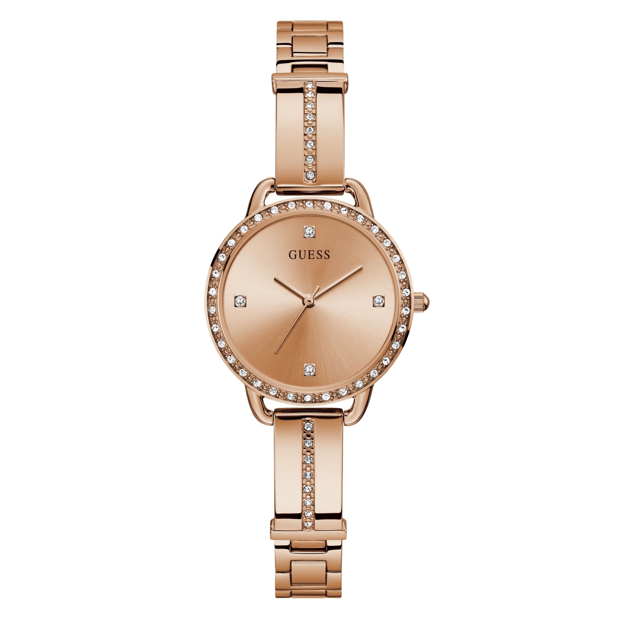 Dit pleetgouden dameshorloge GW0022L2 uit de Bellini collectie van Guess is strak en trendy. De goudkleurige wijzerplaat, kast en armband zijn gezet met steentjes.