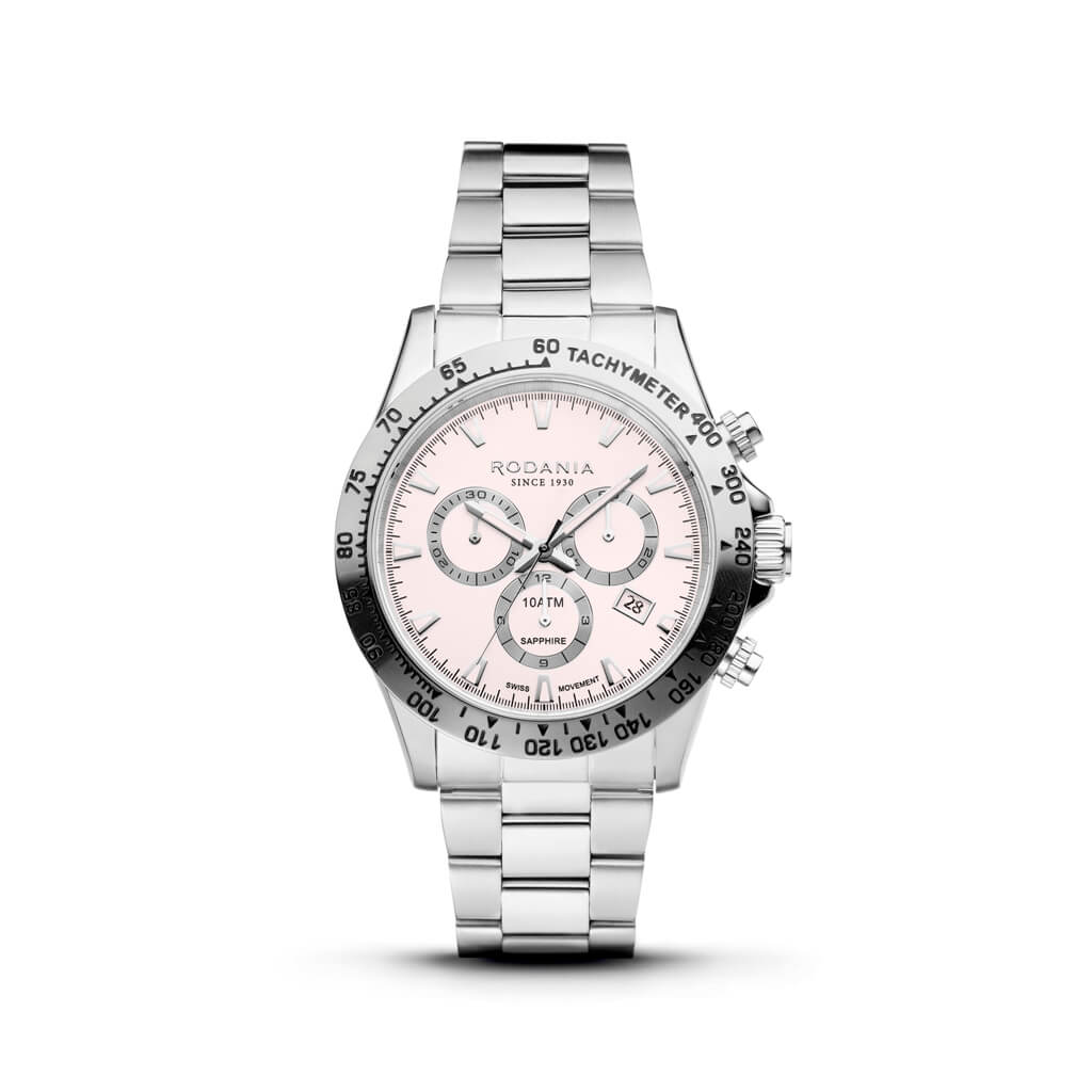 Dit Rodania herenhorloge met referentie R21001 maakt deel uit van de Davos collectie. Dit horloge heeft een horlogekast en band uit staal. De wijzerplaat heeft een roze kleur. Dit quartz horloge beschikt over een chronografische functie en datum aanduiding. Dit Rodania horloge wordt geleverd in een mooie Rodania Box met fabrieksgarantie.