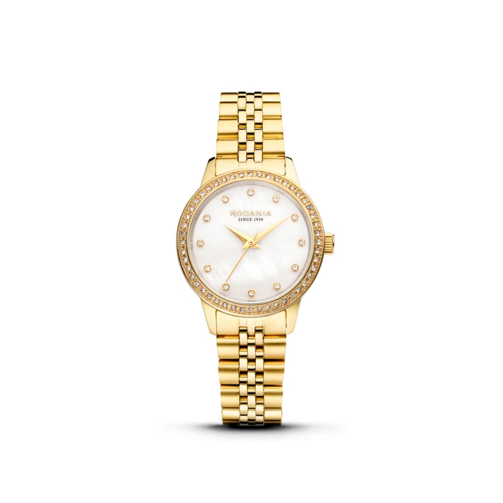 Dit Rodania dameshorloge met referentie R10004 maakt deel uit van de Montreux collectie. Dit horloge heeft een horlogekast en band uit pleetgoud staal. De wit parelmoeren wijzerplaat is versierd met steentjes op de indexen en rond de wijzerplaat. Dit Rodania horloge wordt geleverd in een mooie Rodania Box met fabrieksgarantie.