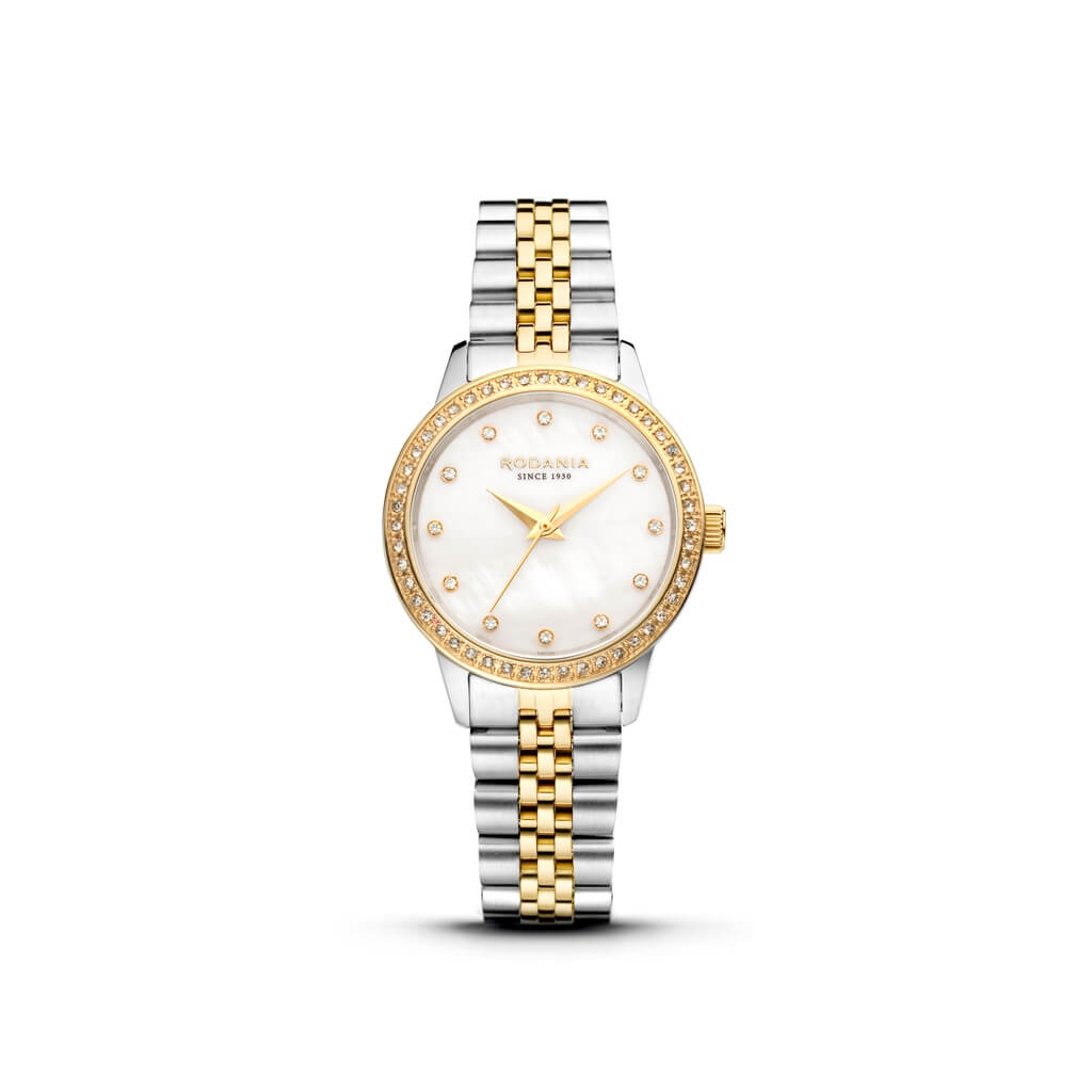 Dit Rodania dameshorloge met referentie R10002 maakt deel uit van de Montreux collectie. Dit horloge heeft een horlogekast en band uit bicolor, zilver en pleetgoud, staal. De wit parelmoeren wijzerplaat is versierd met steentjes op de indexen en rond de wijzerplaat. Dit Rodania horloge wordt geleverd in een mooie Rodania Box met fabrieksgarantie.