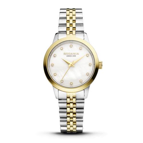 Dit bicolor Rodania dames horloge met referentie R10007 maakt deel uit van de Montreux collectie. Dit horloge heeft bicolor een horlogekast en band uit roestvrin staal staal. De wijzerplaat is vervaardigd uit parelmoer.