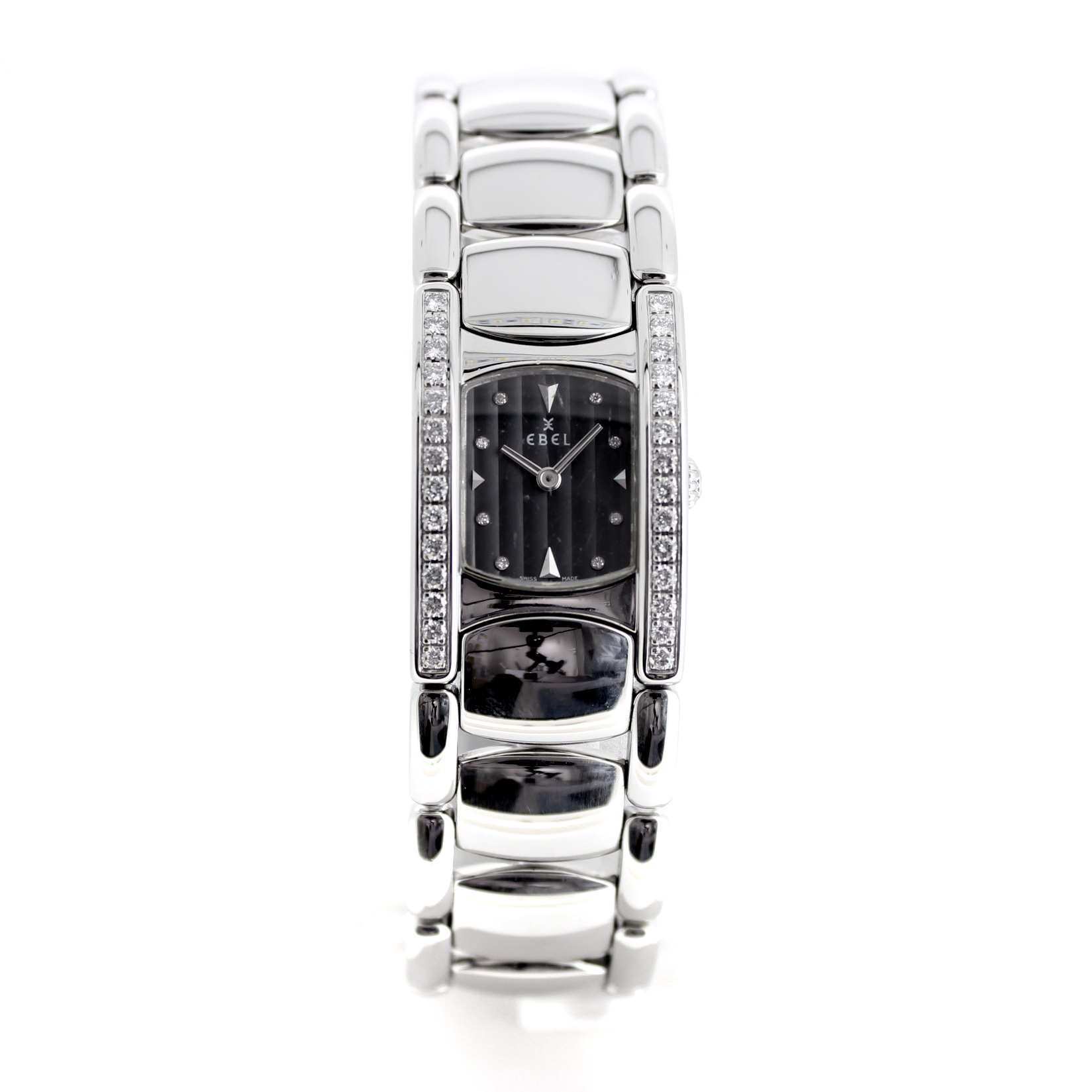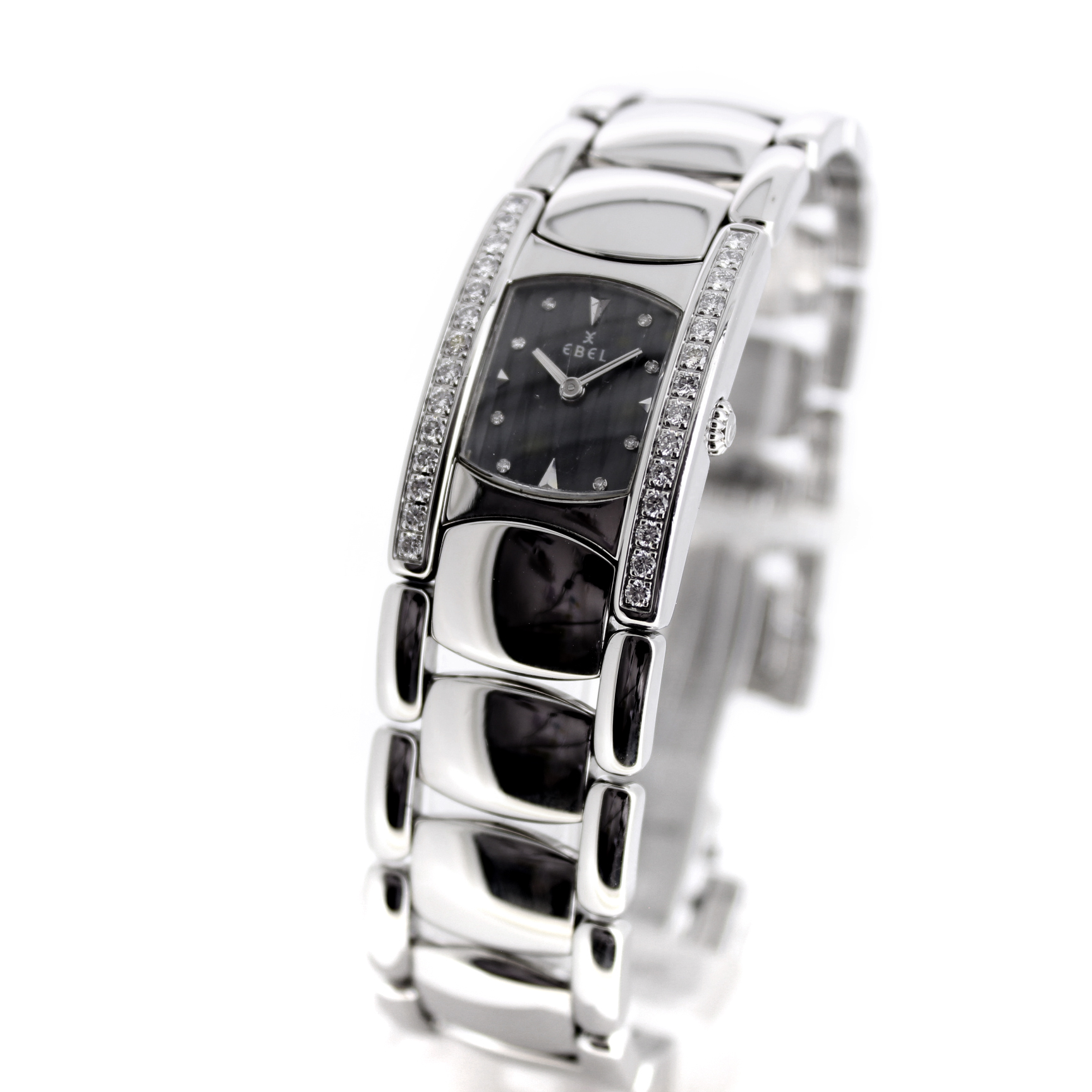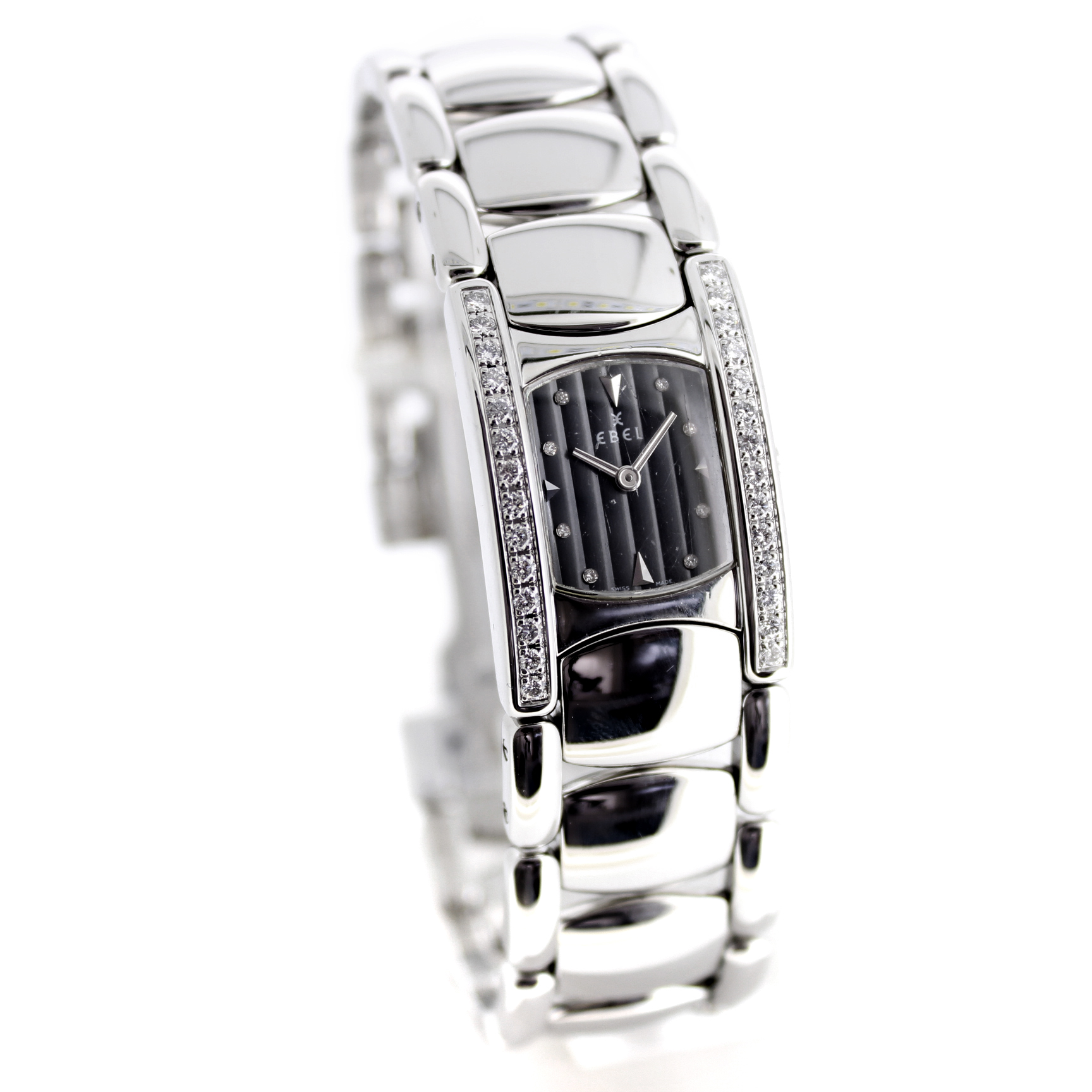 Dit dames Ebel Brasilia Manchette Diamonds horloge met de referentie 9057A28 is een quartz dames staal horloge met een donker grijze wijzerplaat en diamanten indexen.