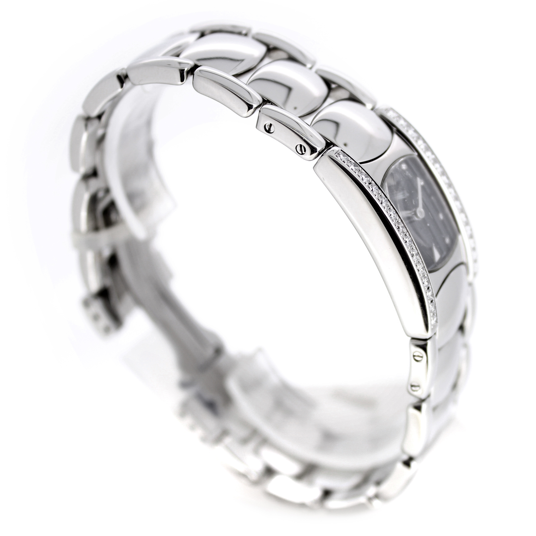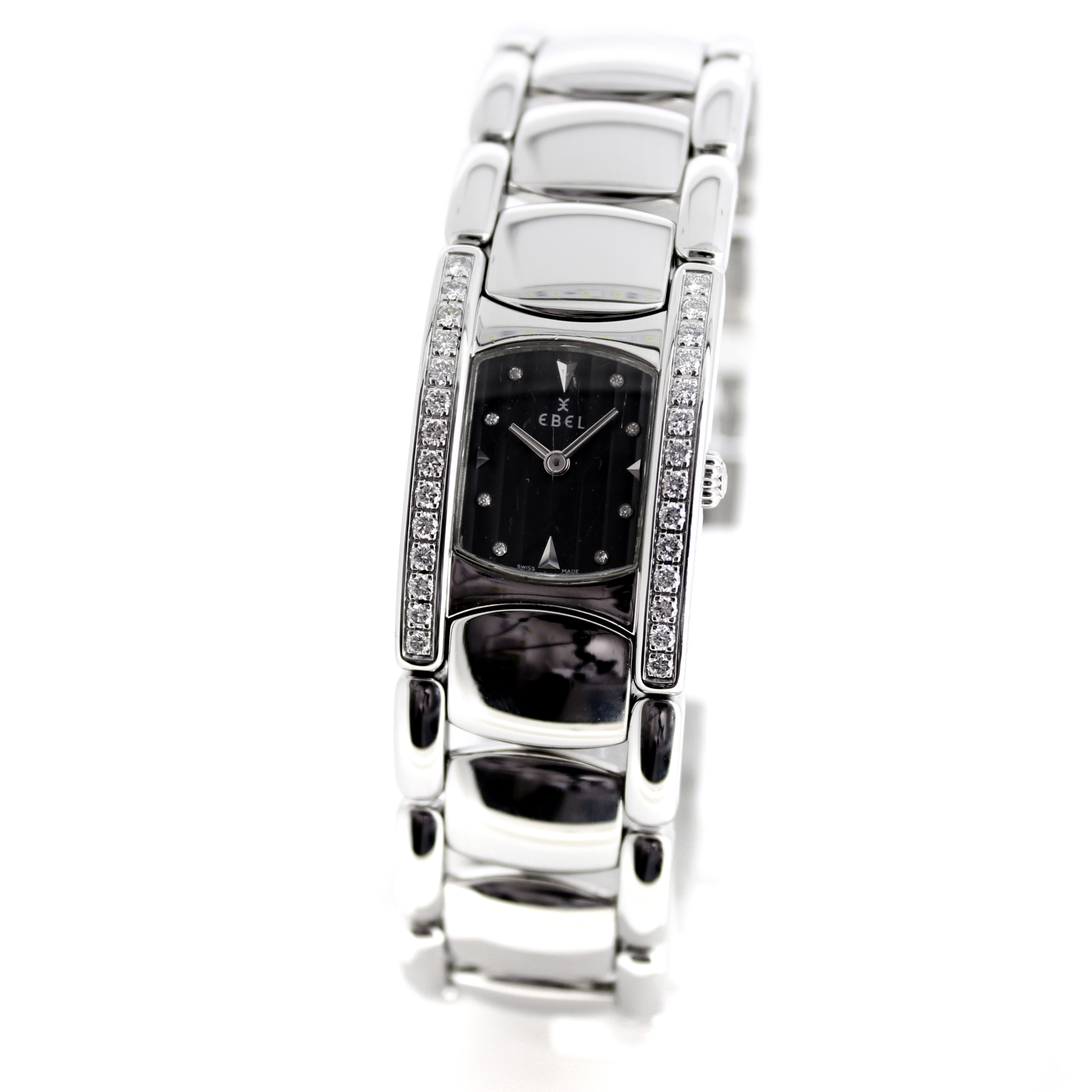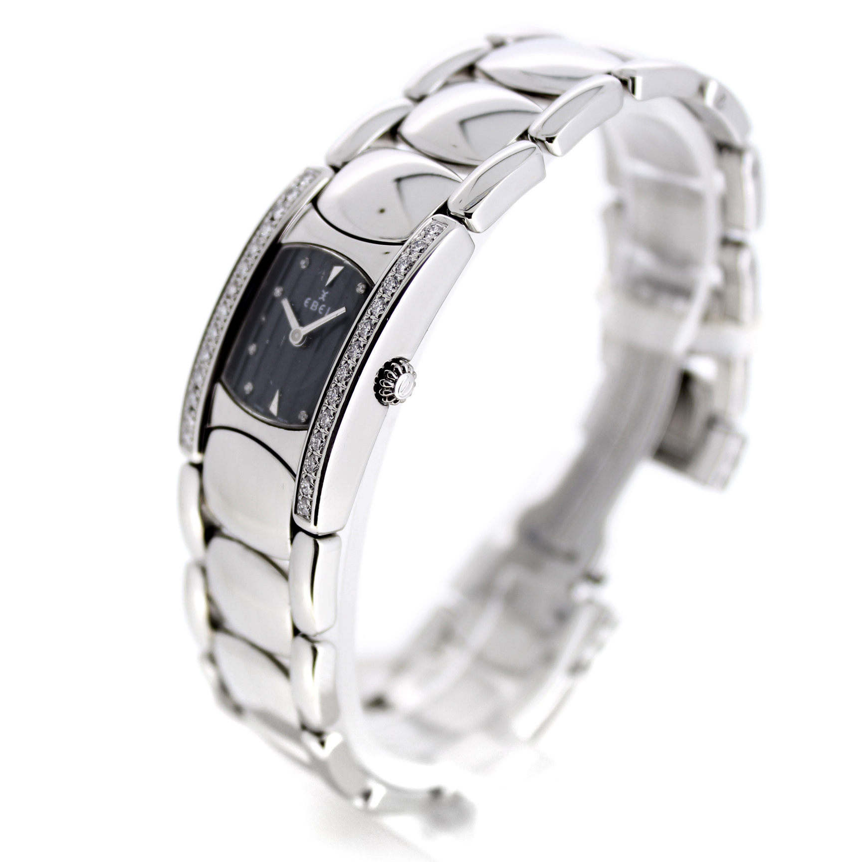 Dit dames Ebel Brasilia Manchette Diamonds horloge met de referentie 9057A28 is een quartz dames staal horloge met een donker grijze wijzerplaat en diamanten indexen.