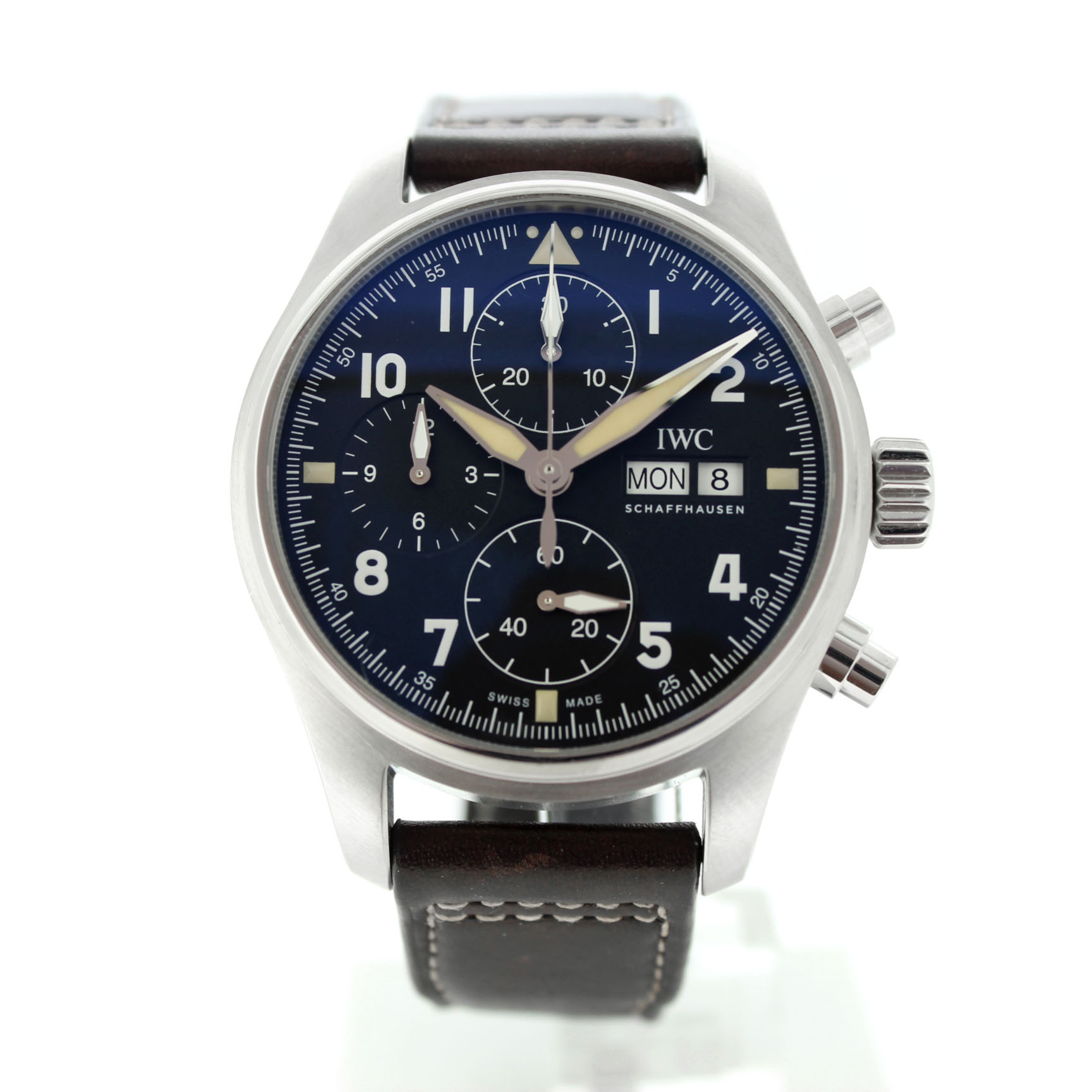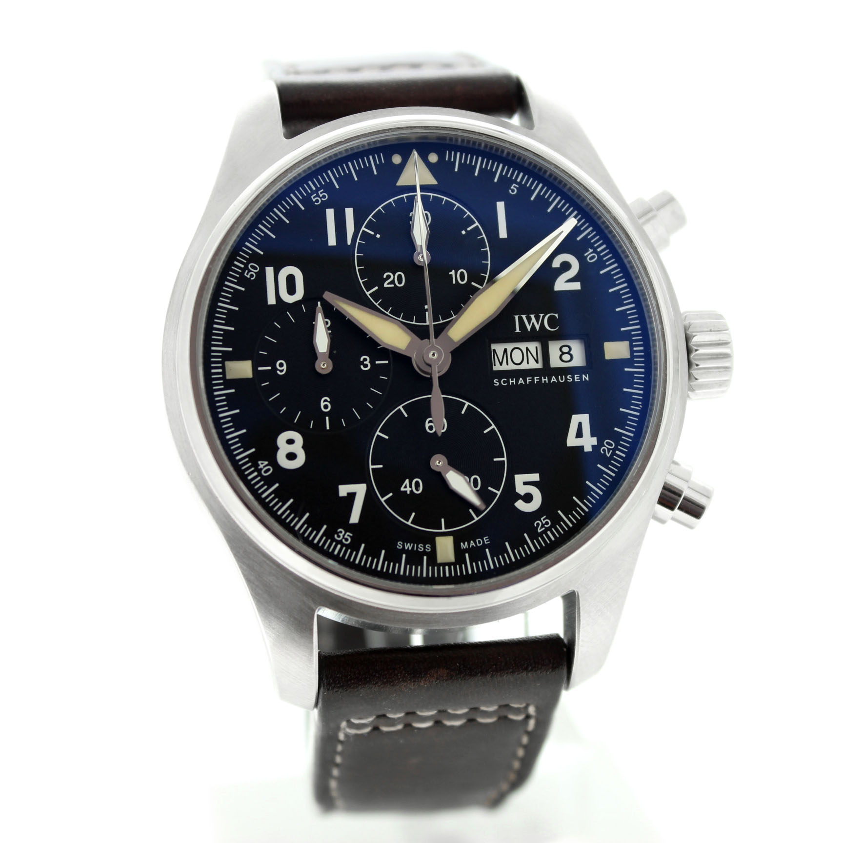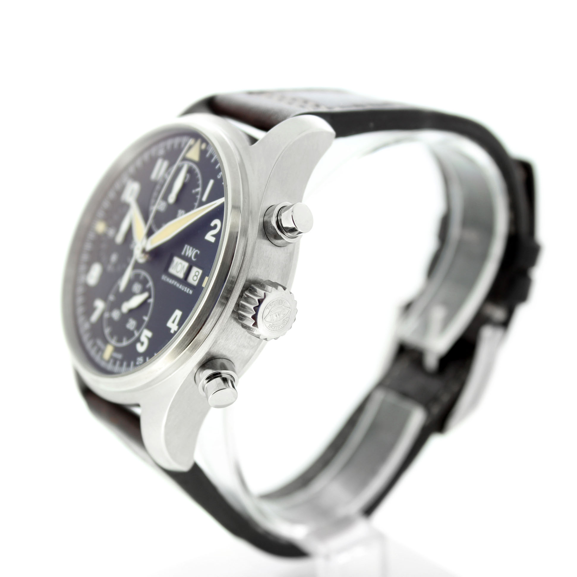 Dit tweedehands IWC Spitfire Chronograph IW387901 is een automatisch horloge en heeft een 41mm staal kast. Het IWC horloge is voorzien van een zwarte wijzerplaat met dag en datum aanduiding op 3uur. Het Zwitsers IWC horloge bezit een bruine lederband.