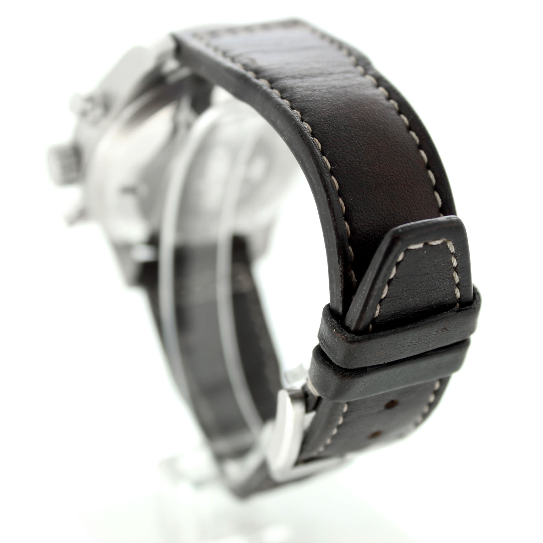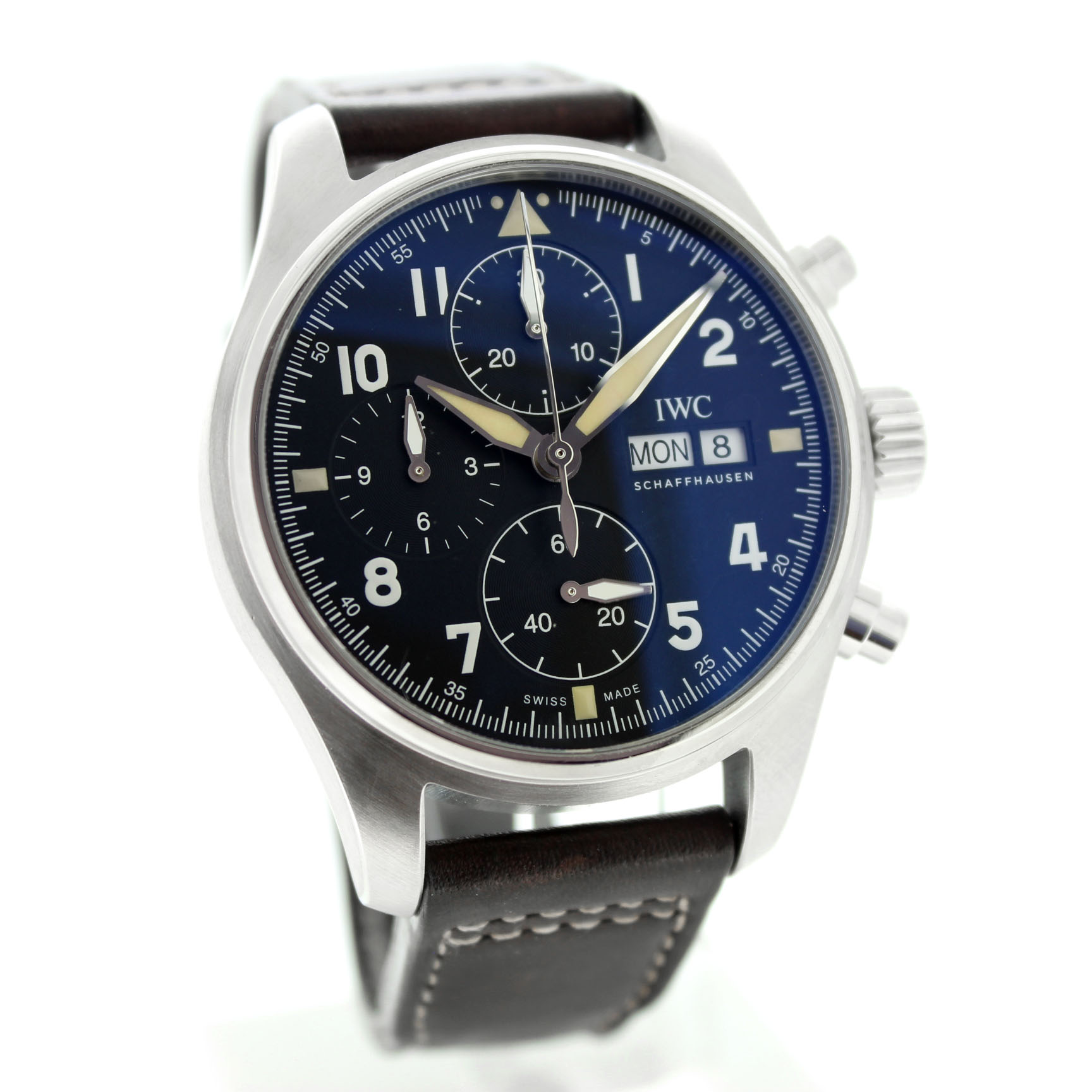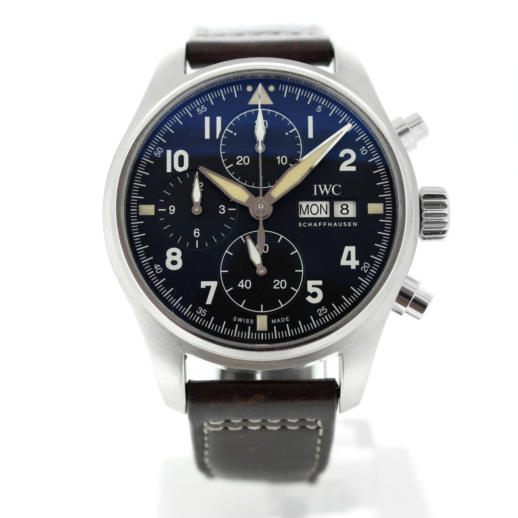 Dit tweedehands IWC Spitfire Chronograph IW387901 is een automatisch horloge en heeft een 41mm staal kast. Het IWC horloge is voorzien van een zwarte wijzerplaat met dag en datum aanduiding op 3uur. Het Zwitsers IWC horloge bezit een bruine lederband.