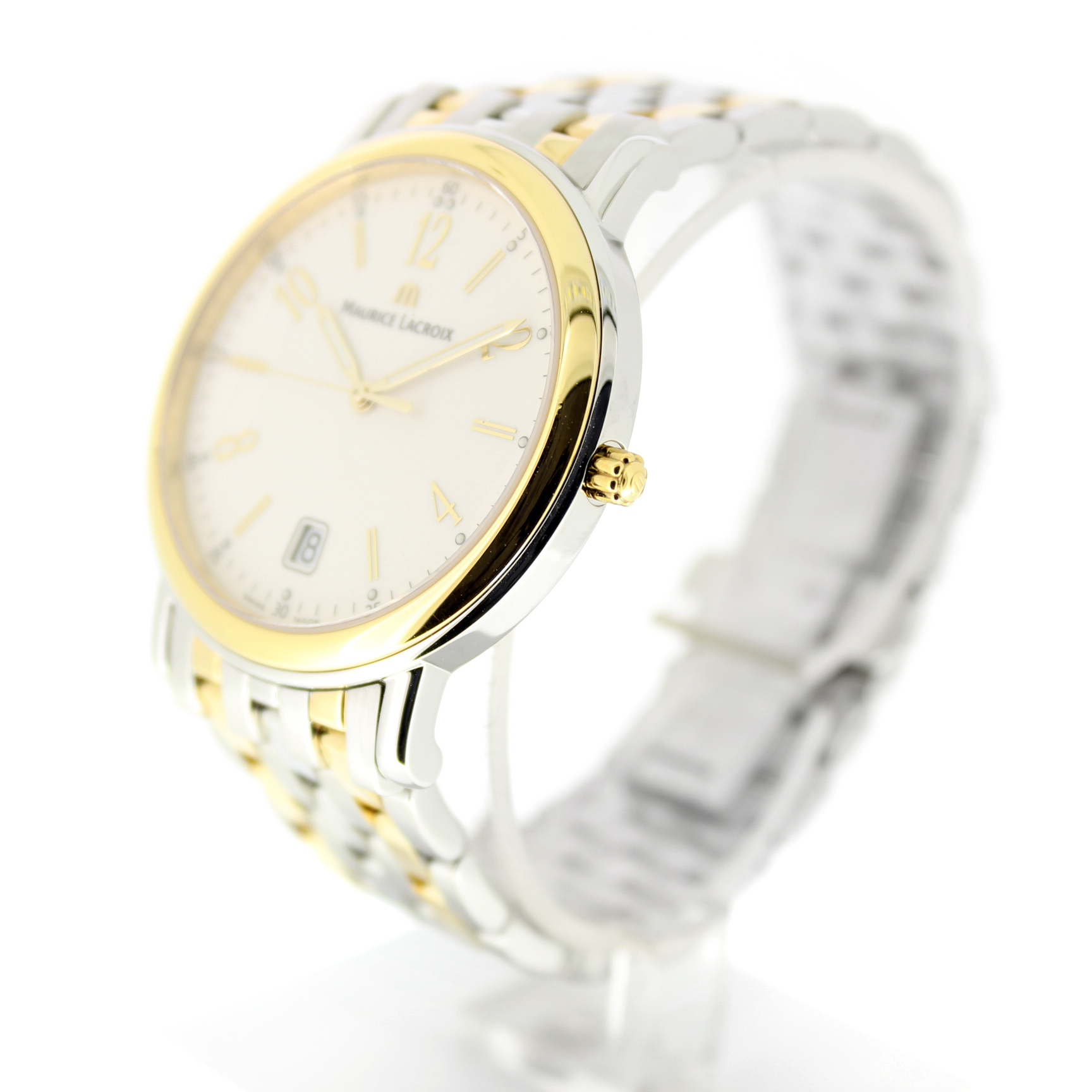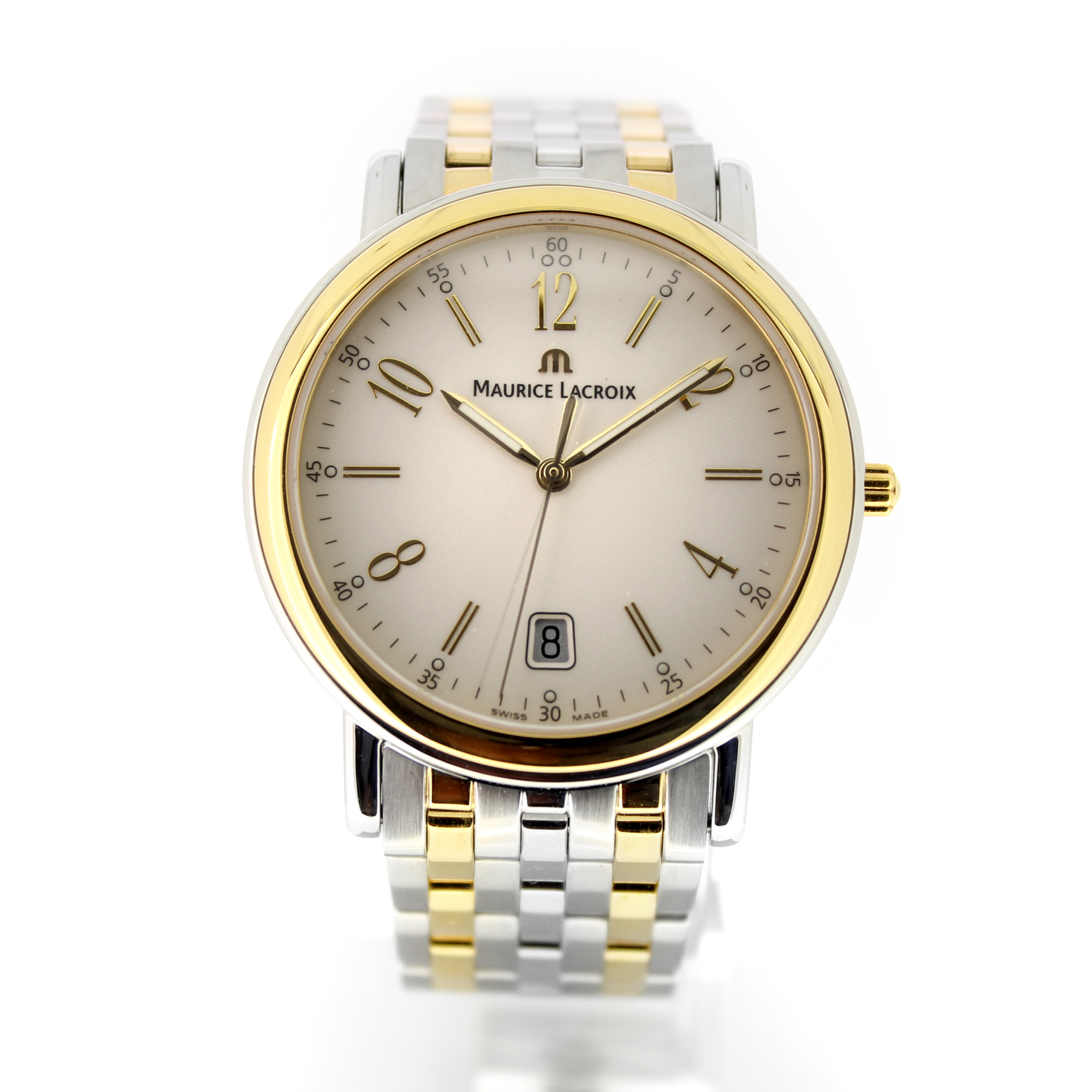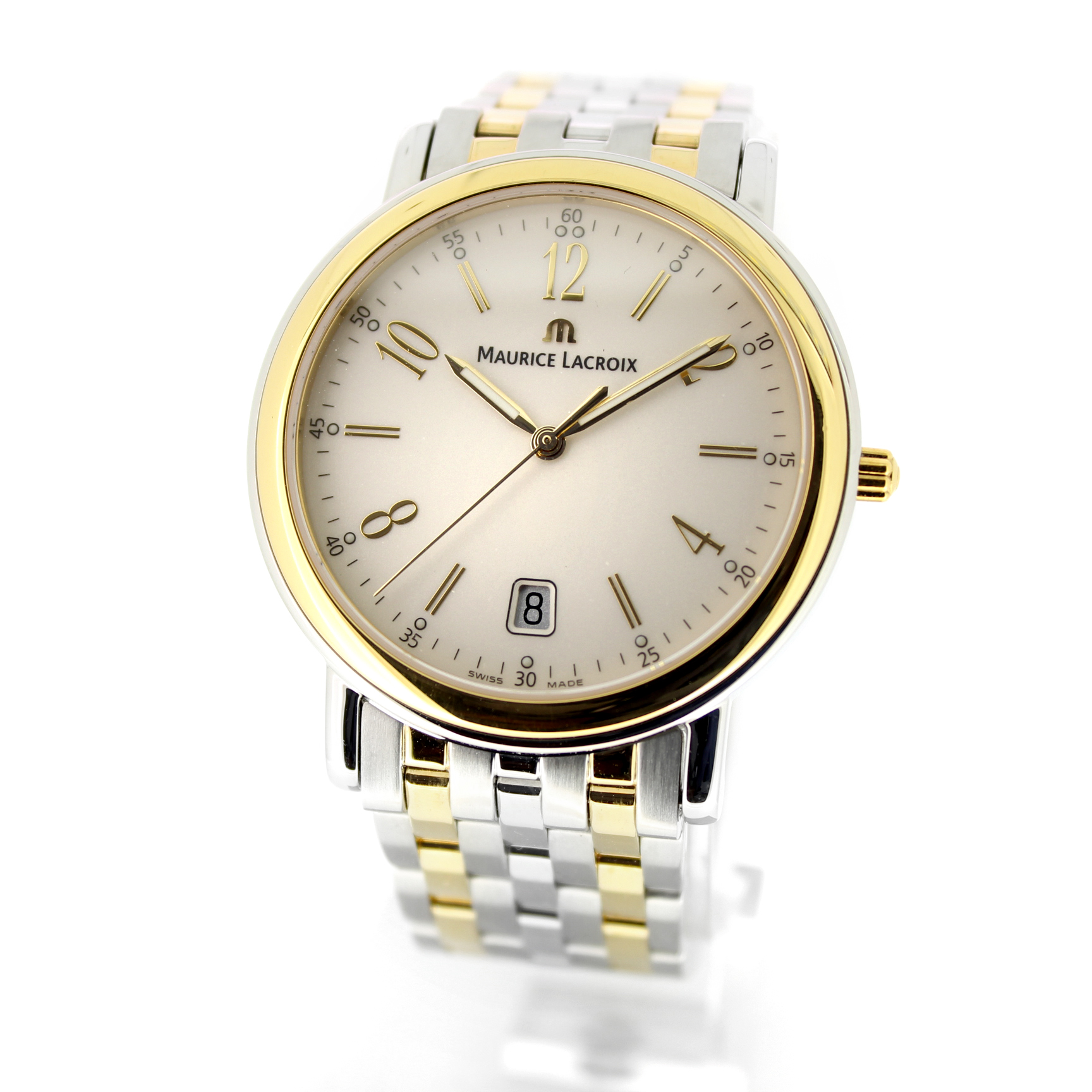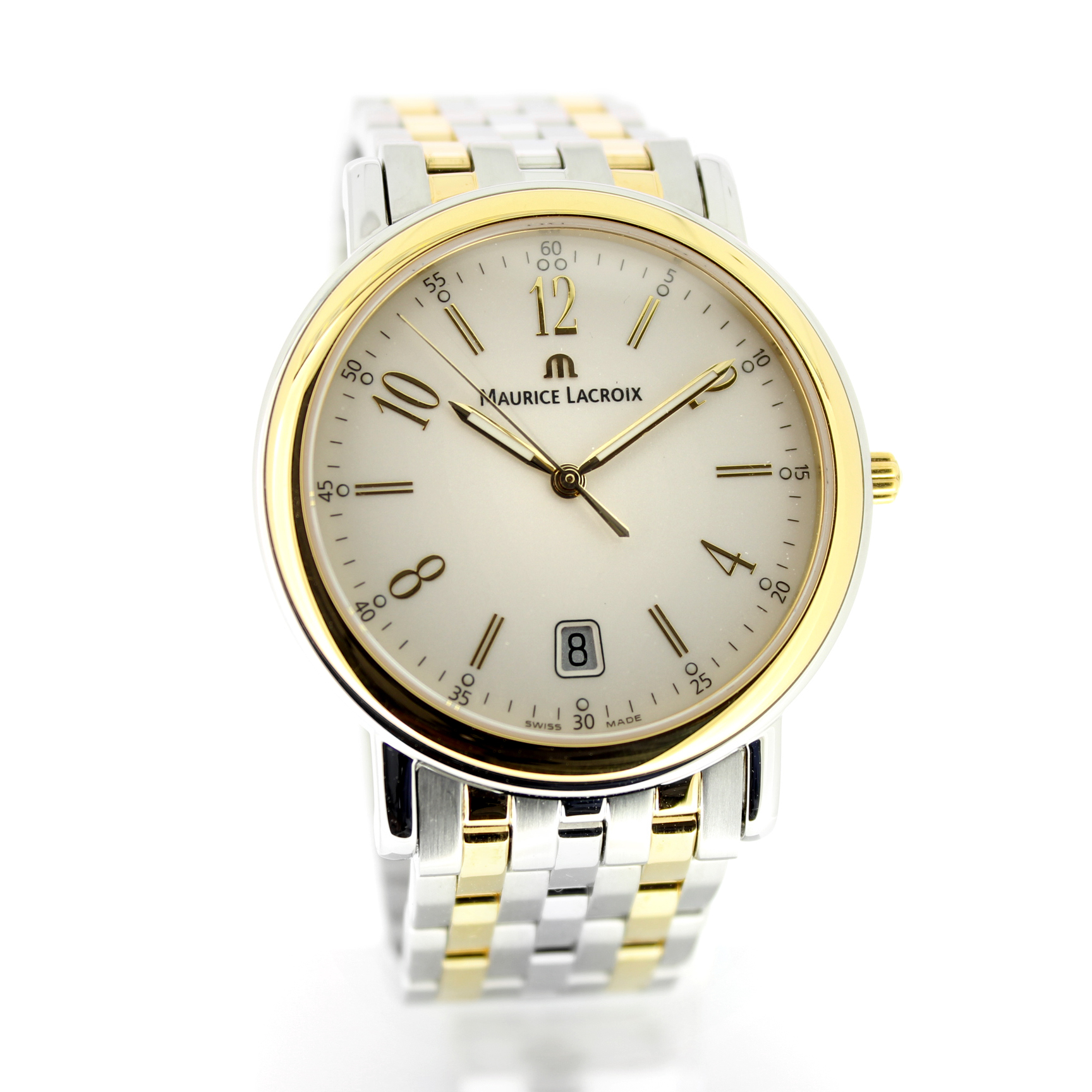Dit tweedehands Maurice Lacroix Les Classiques LC1017 horloge heeft een 38mm bicolorkleurige staal kast en band. Het horloge heeft een witte wijzerplaat met datum aanduiding op 6uur.