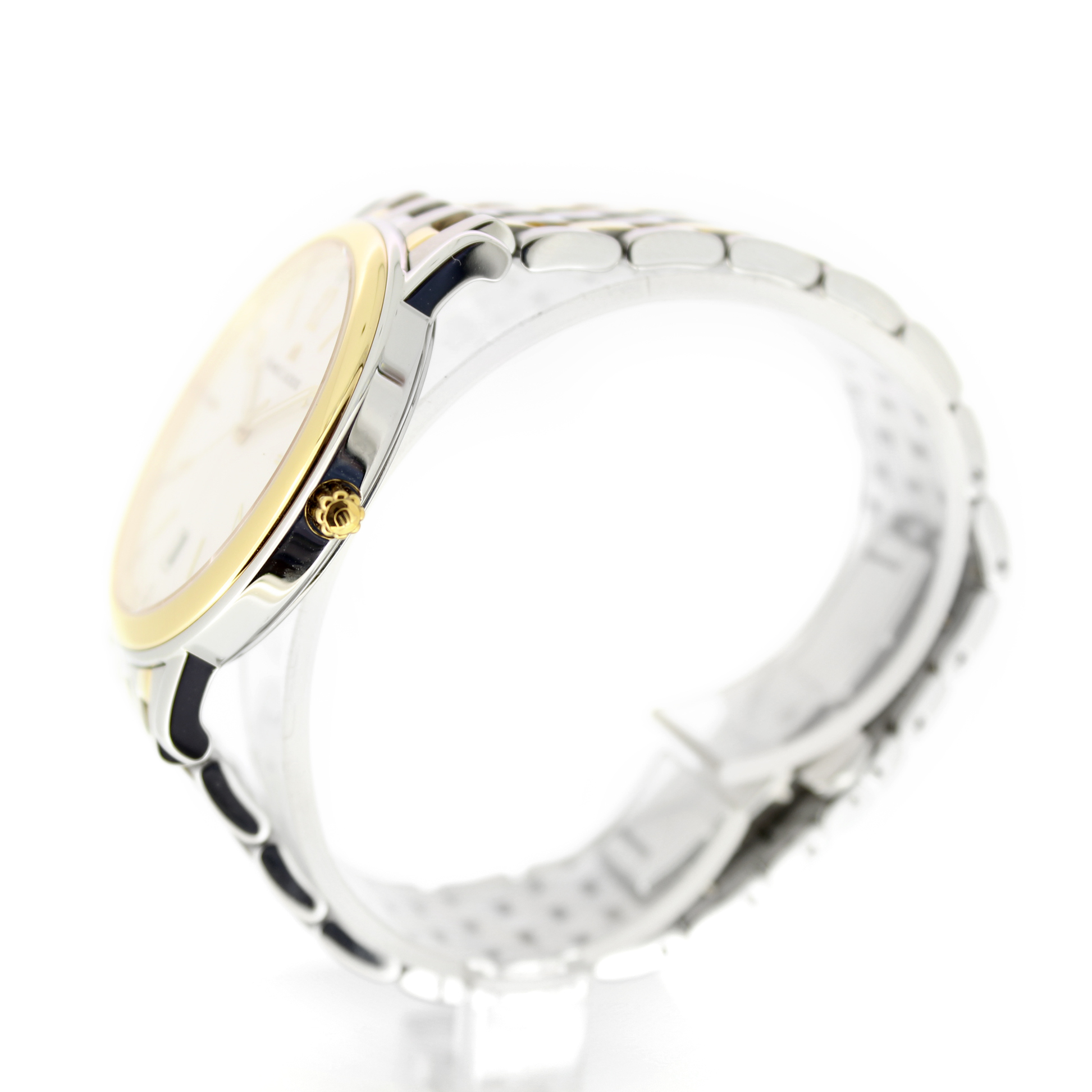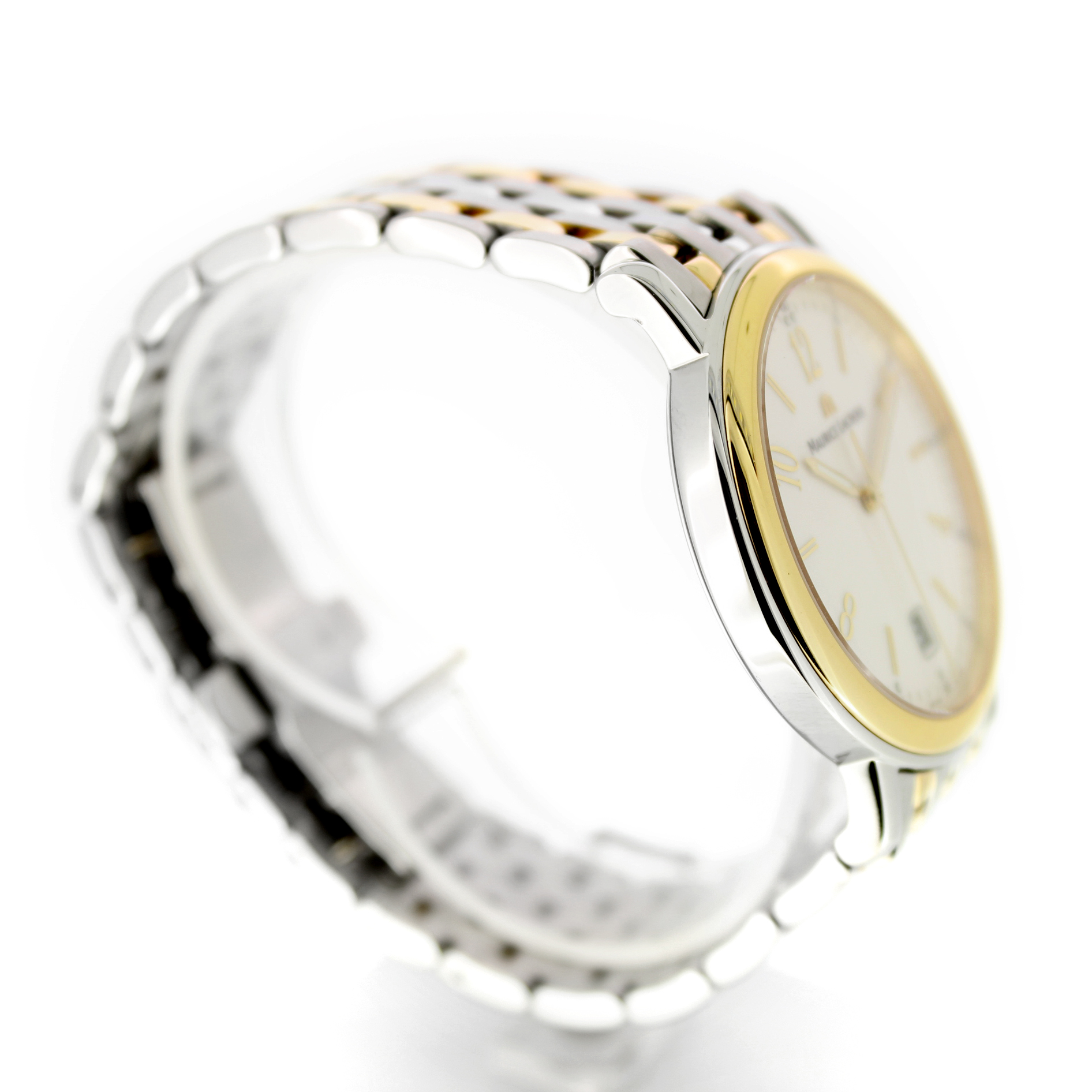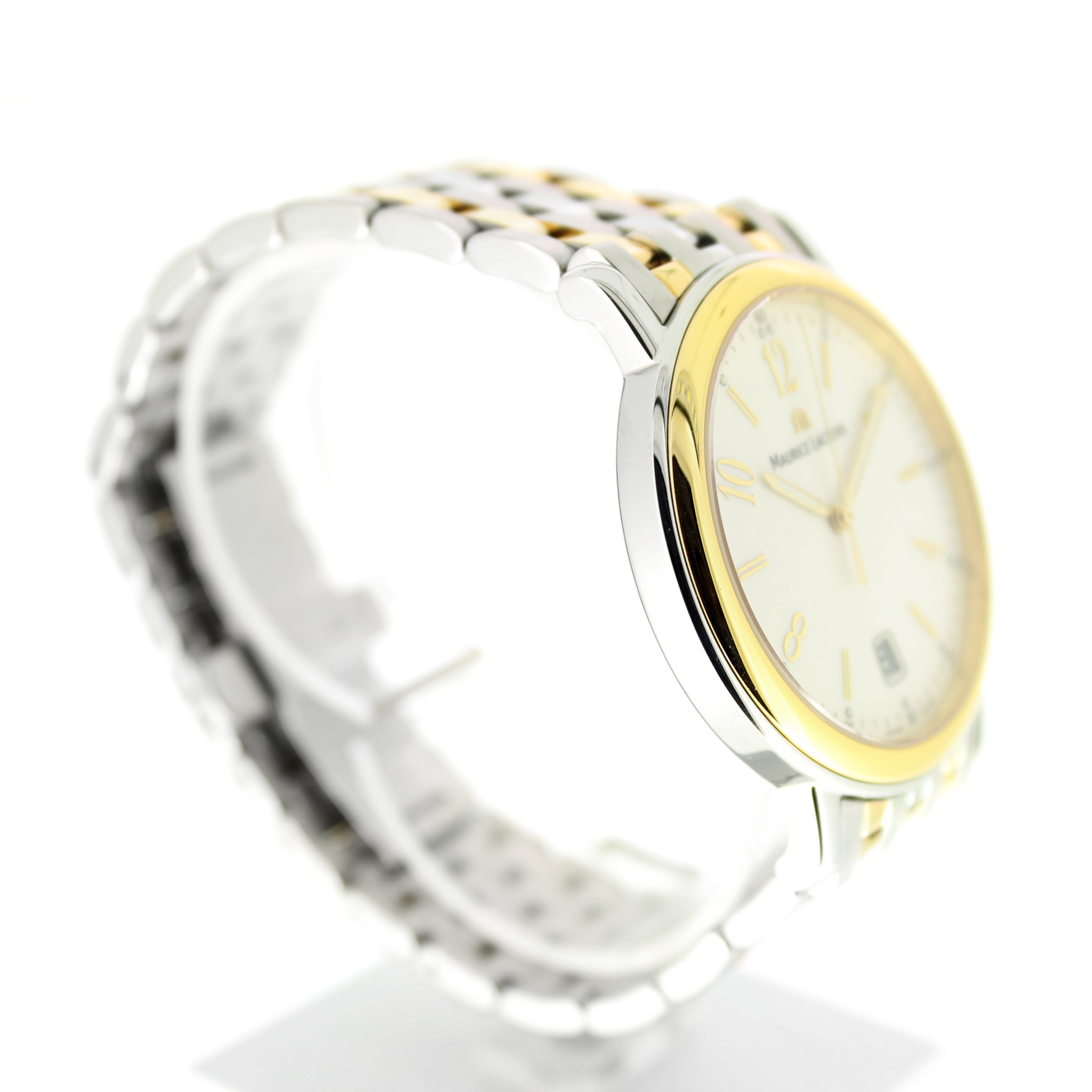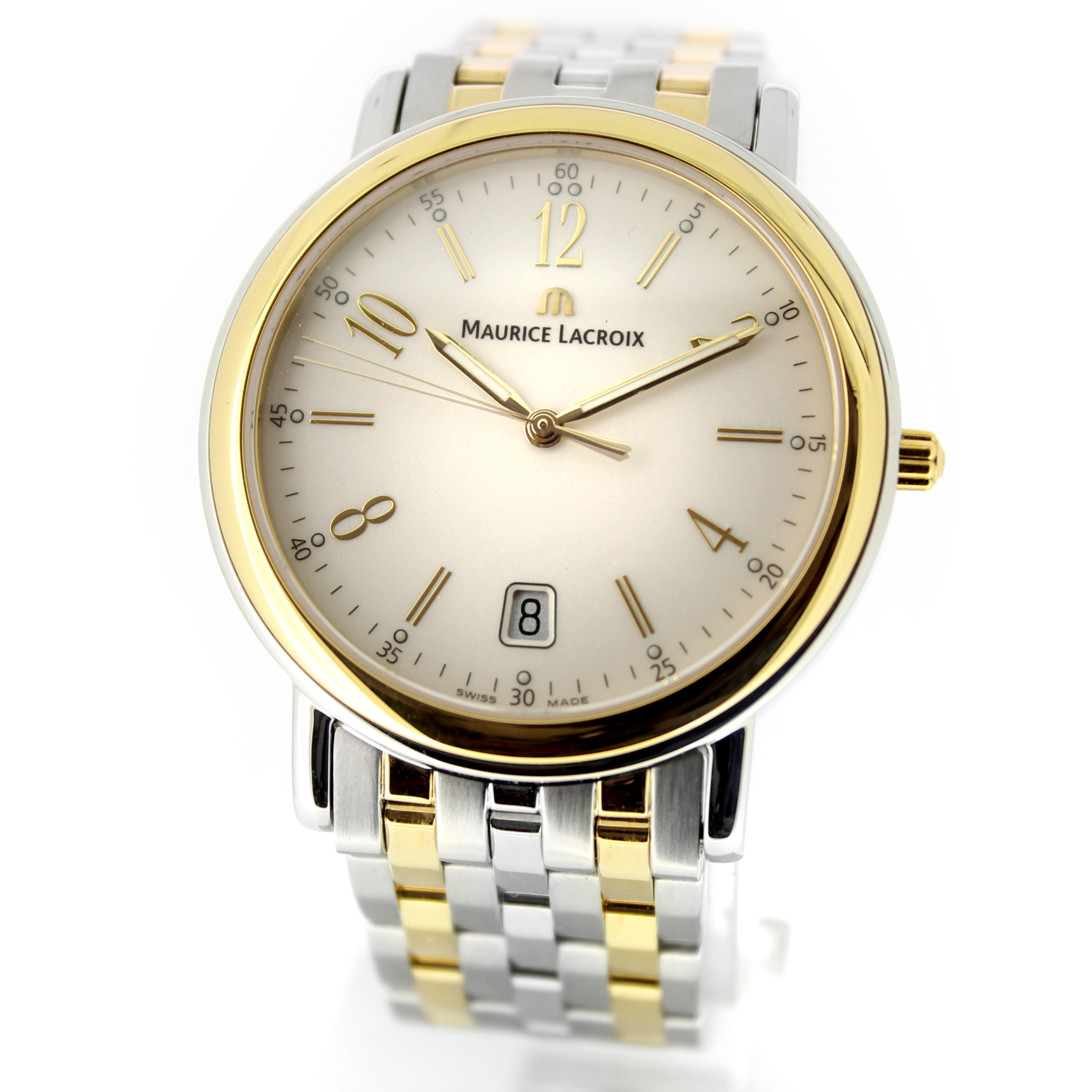 Dit tweedehands Maurice Lacroix Les Classiques LC1017 horloge heeft een 38mm bicolorkleurige staal kast en band. Het horloge heeft een witte wijzerplaat met datum aanduiding op 6uur.