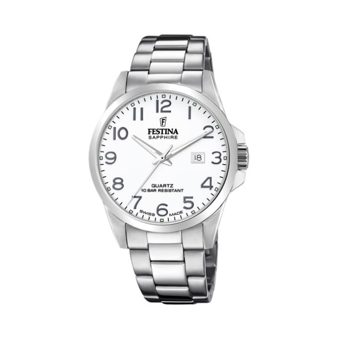 Dit Festina horloge met referentie F20024/1 is uit de Swiss Made collectie en heeft een 40mm staal kast en band. Het horloge heeft een witte wijzerplaat met een datum aanduiding op 3uur.