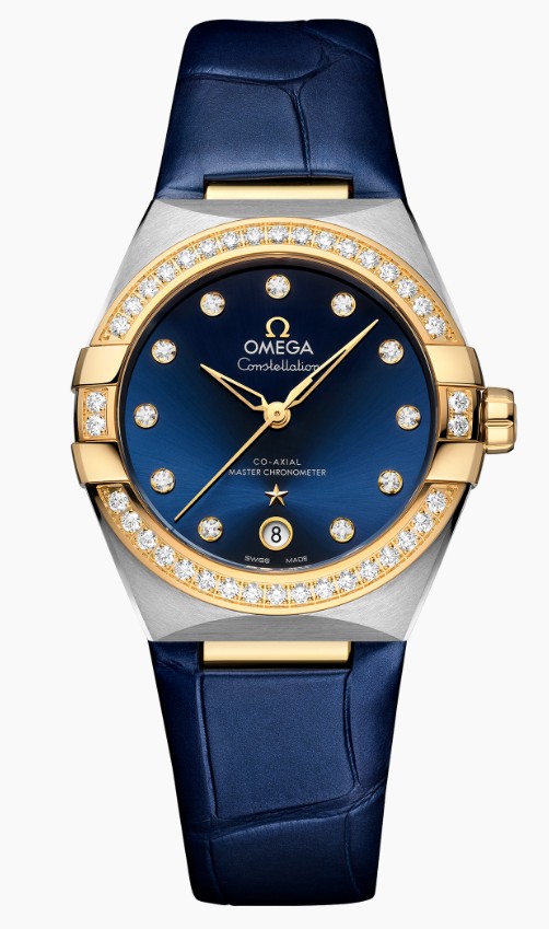 Dit model van 36 mm roestvrij staal en 18K geelgoud heeft een gepolijste lunette met 38 diamanten, een blauwe PVD-behandelde wijzerplaat met zongeborstelde afwerking en een datumvenster op de 6-uurspositie. De wijzers, het OMEGA-logo, de Constellation-ster en de indexen zijn allemaal van 18K geel goud.
