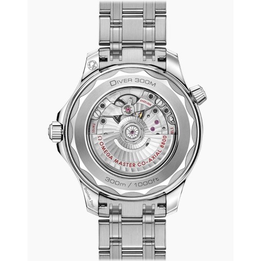Het horloge wordt gepresenteerd op een verstelbare roestvrijstalen armband met extra duikextensie en wordt aangedreven door de OMEGA Master Chronometer Calibre 8800, die te zien is door het saffierkristal op de achterkant van de kast met golvende randen.