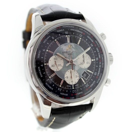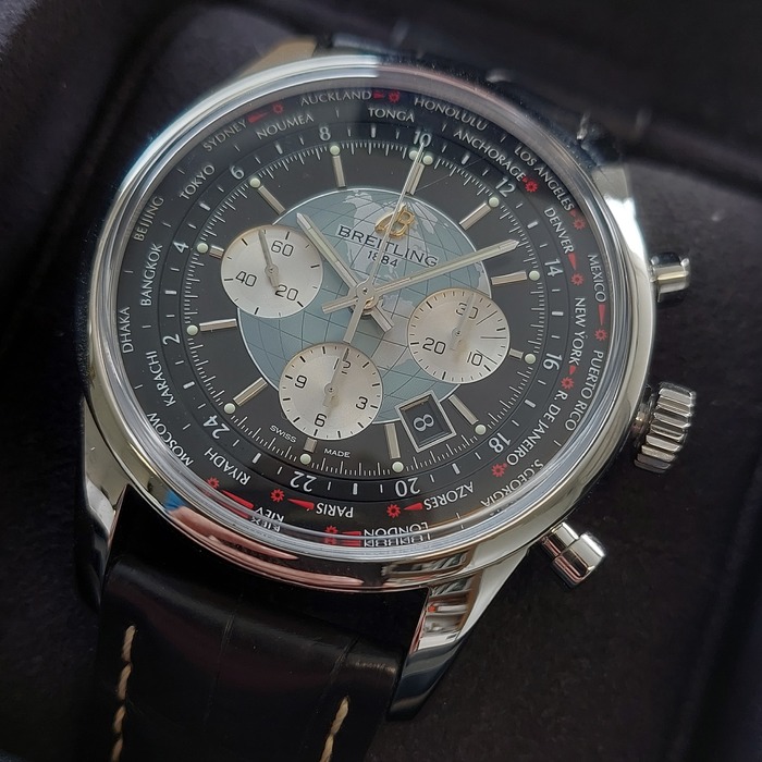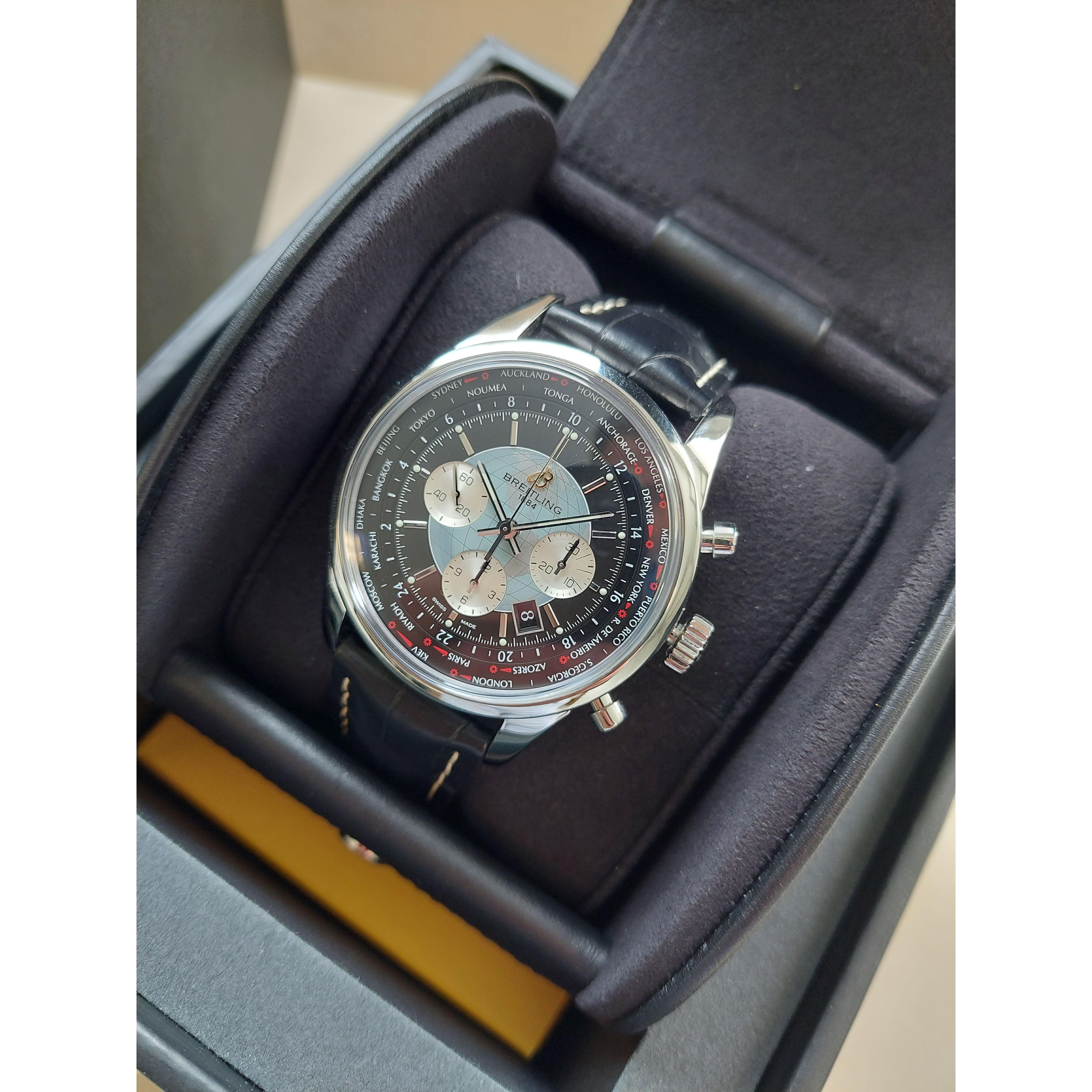 De Breitling Transocean Chronograph Unitime AB0510 is tweedehands te koop in onze zaak. Het Breitling horloge beschikt over een zwarte wijzerplaat met chronograaf en datum aanduiding.