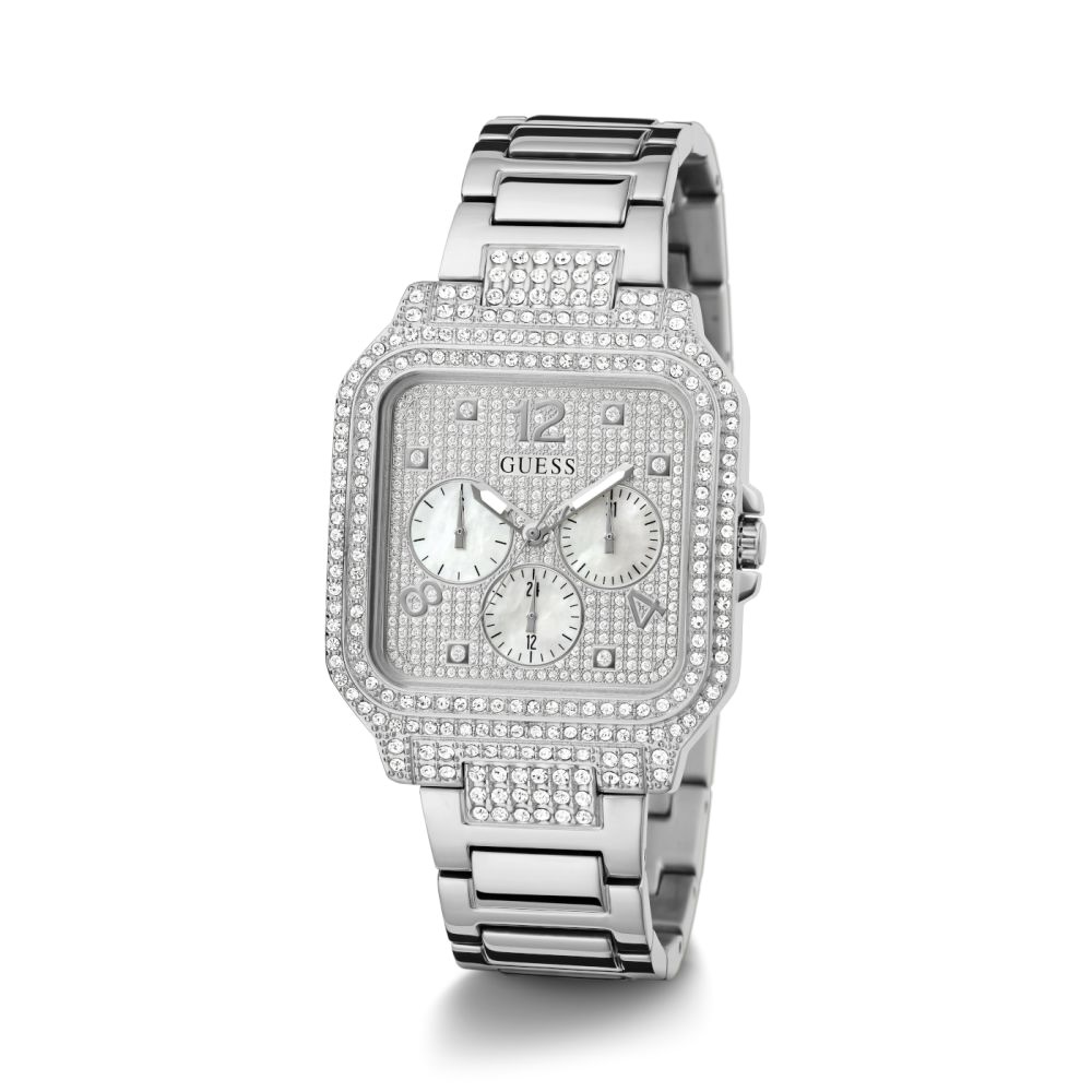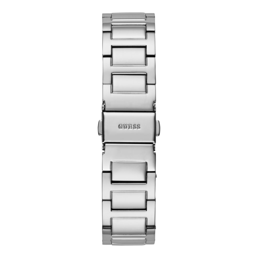 Dit Guess dames horloge Deco GW0472L1 heeft een zilverkleurige staal kast en band. De zilveren wijzerplaat en kast zijn gezet met steentjes.