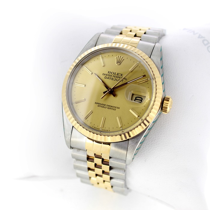 Het Rolex Datejust M16013 horloge beschikt over een 36mm bicolor kast en armband. Het horloge is voorzien van een goudkleurige wijzerplaat met een datum aanduiding op 3 uur.