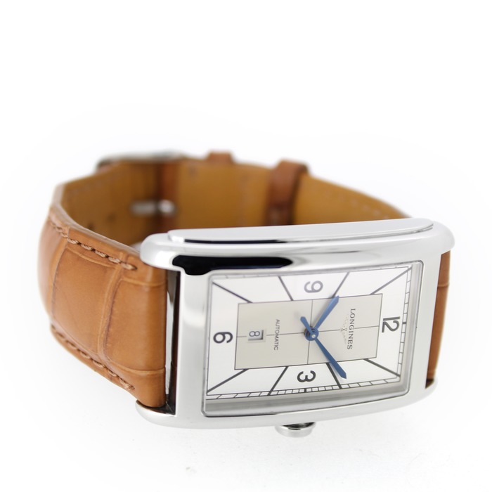 Het tweedehands Longines DolceVita L5.767.4.73.3 horloge heeft een 28x47 mm staal kast en bruin lederen band. Het horloge heeft een zilverkleurige wijzerplaat met een datum aanduiding op 6uur.
