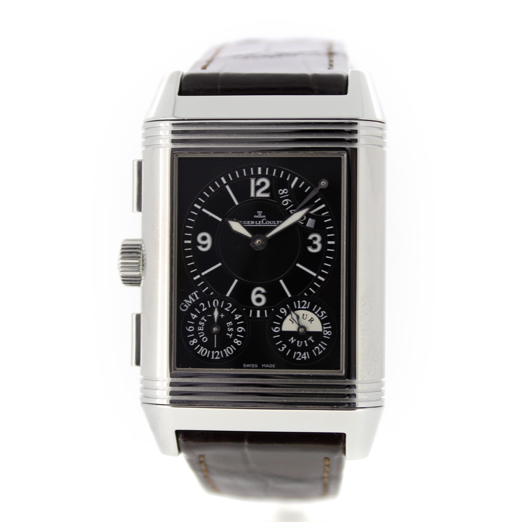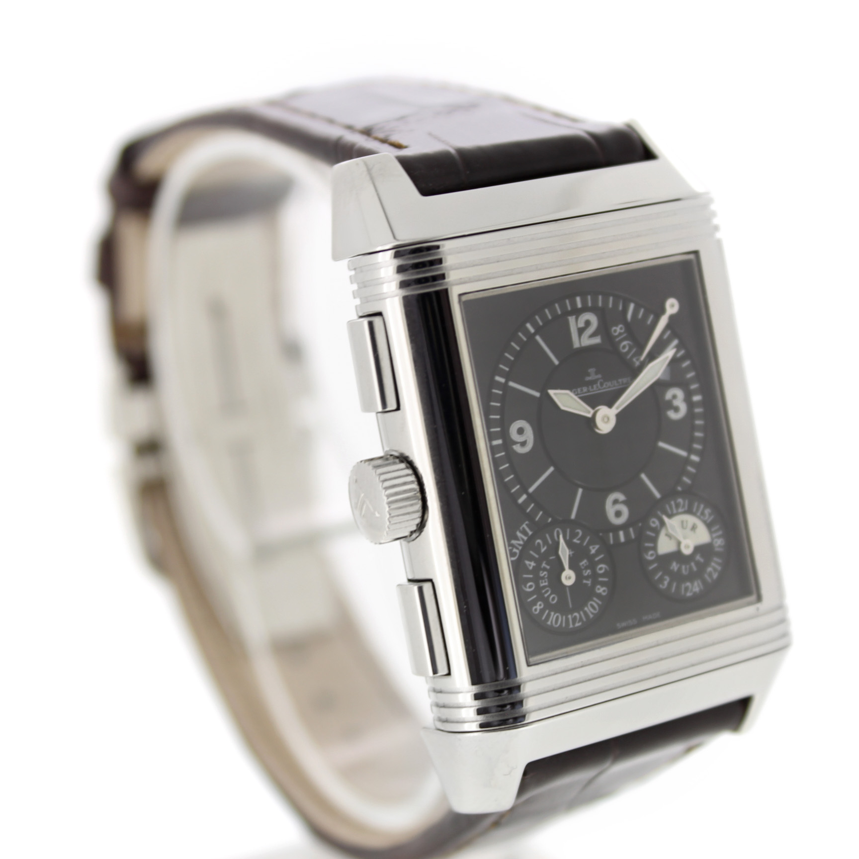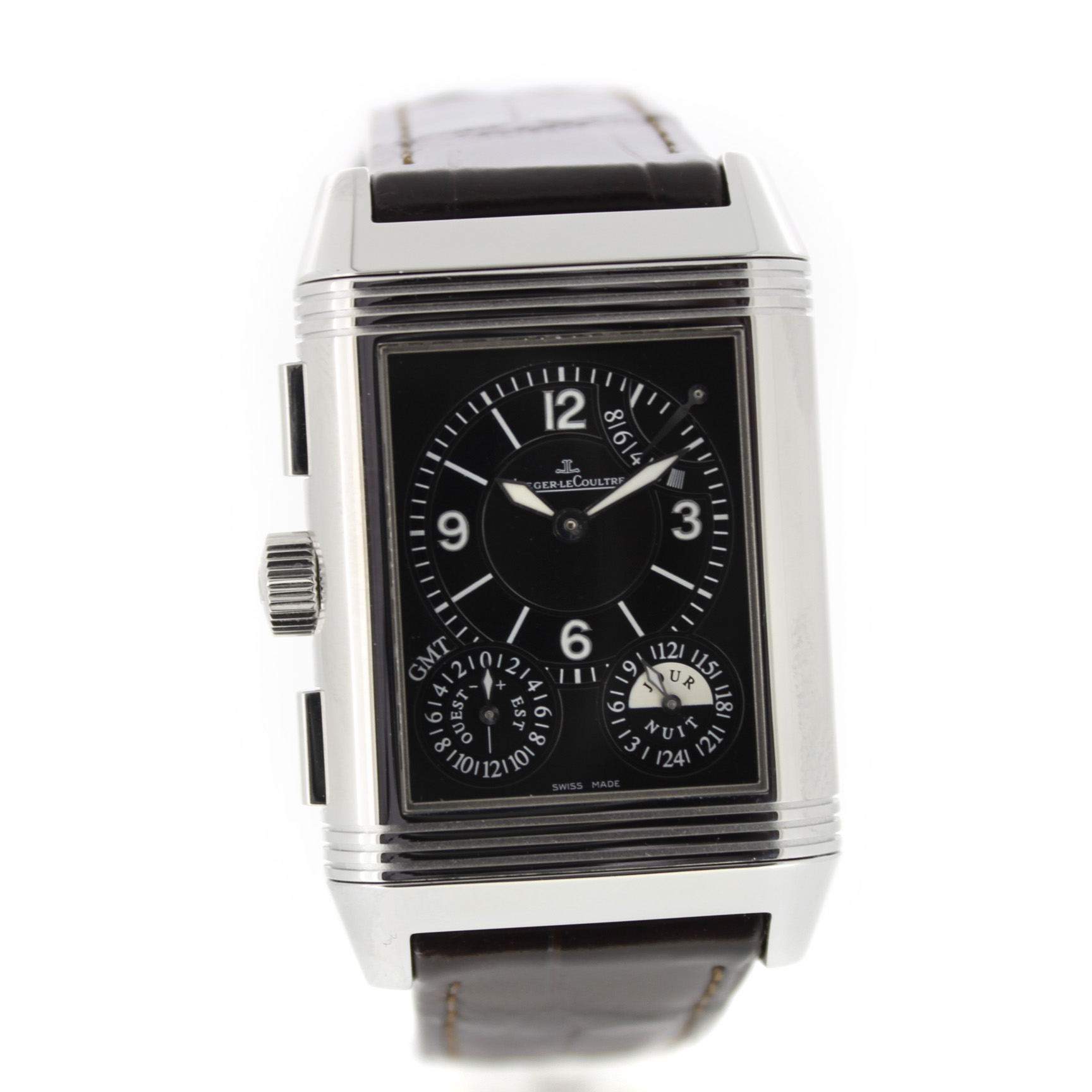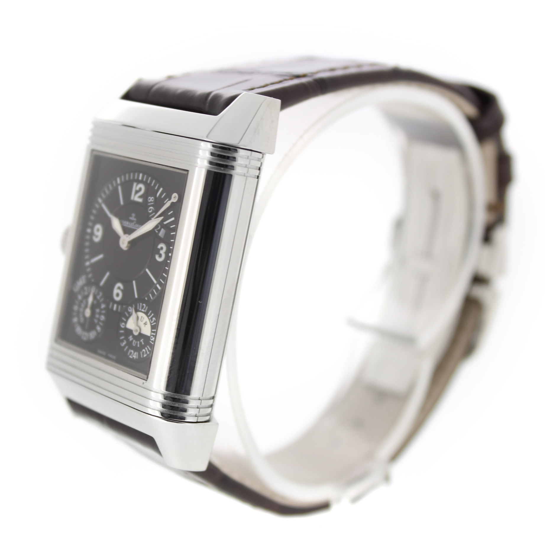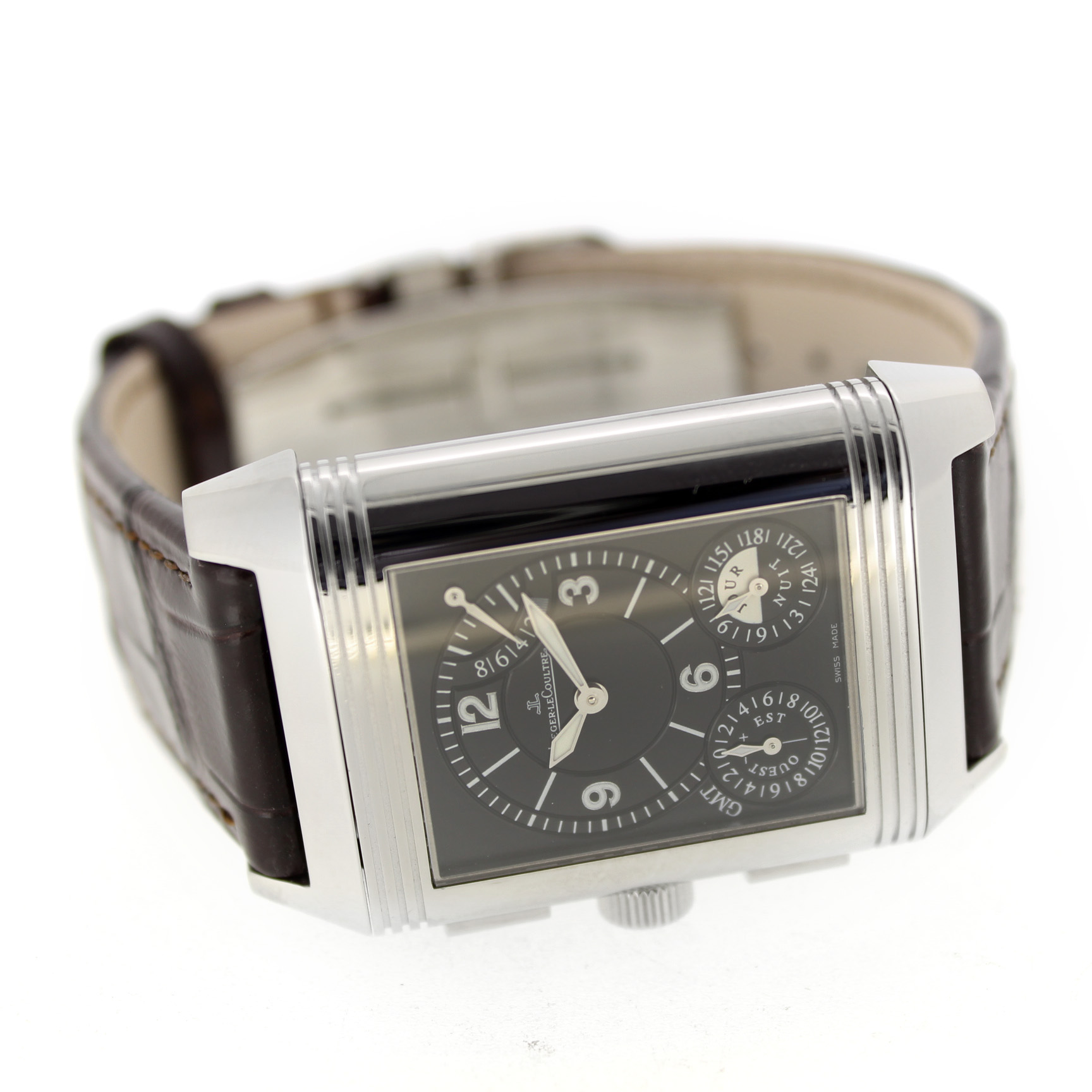 Jaeger-LeCoultre Reverso Grande Gmt 240.8.18 horloge is tweedehands te koop in onze zaak en heeft een 29mm staal kast met een bruin leren band. Het horloge beschikt over een zilverkleurige of zwarte wijzerplaat.