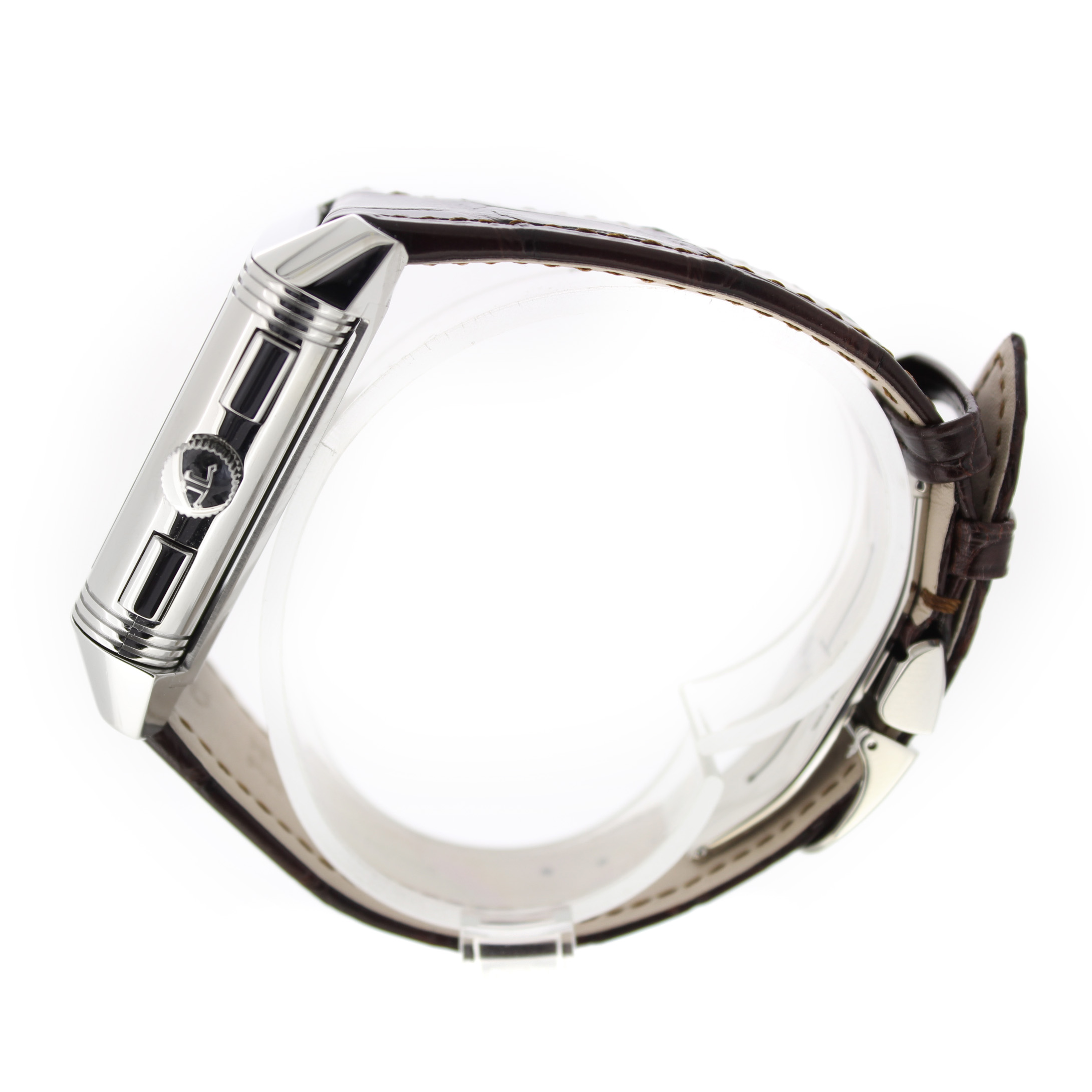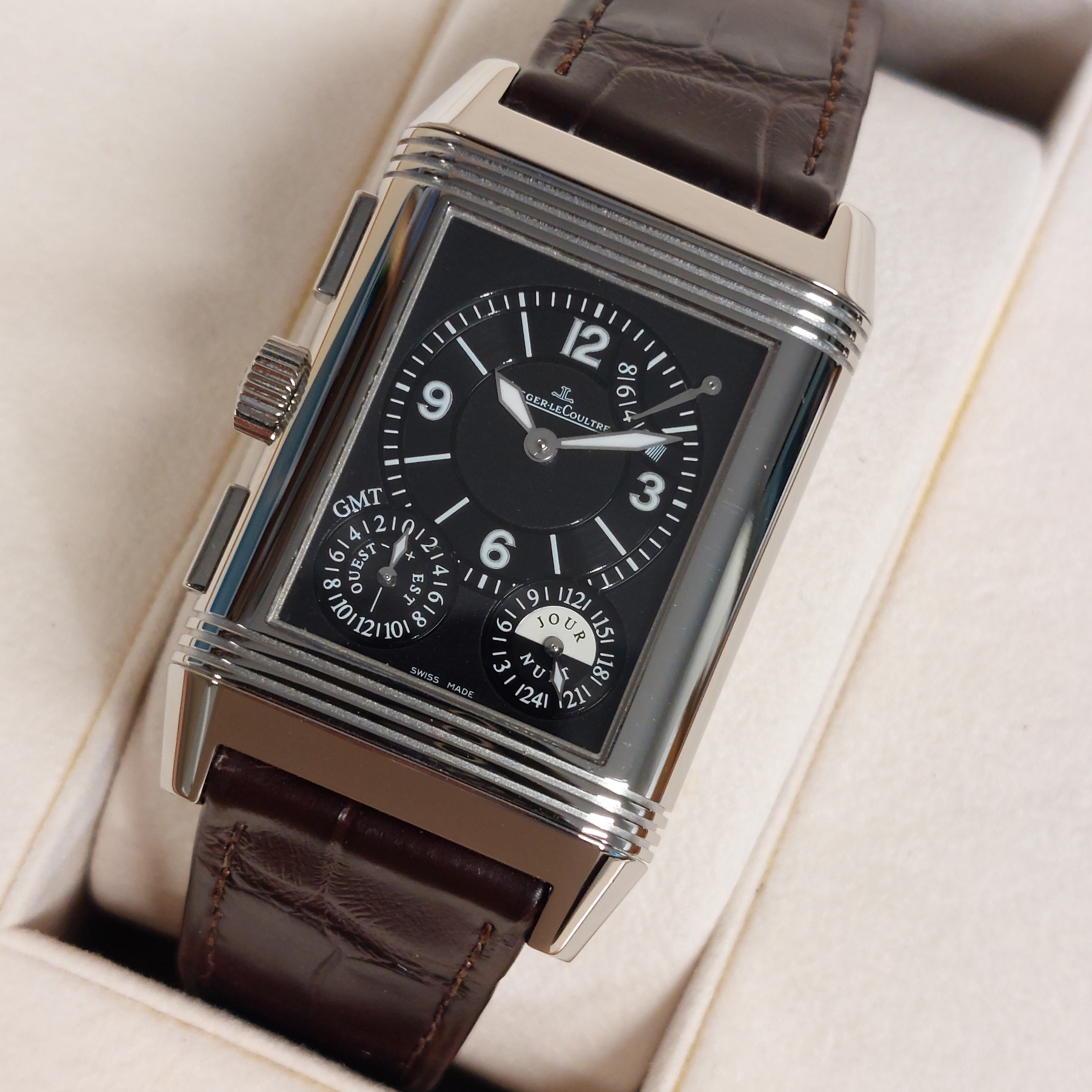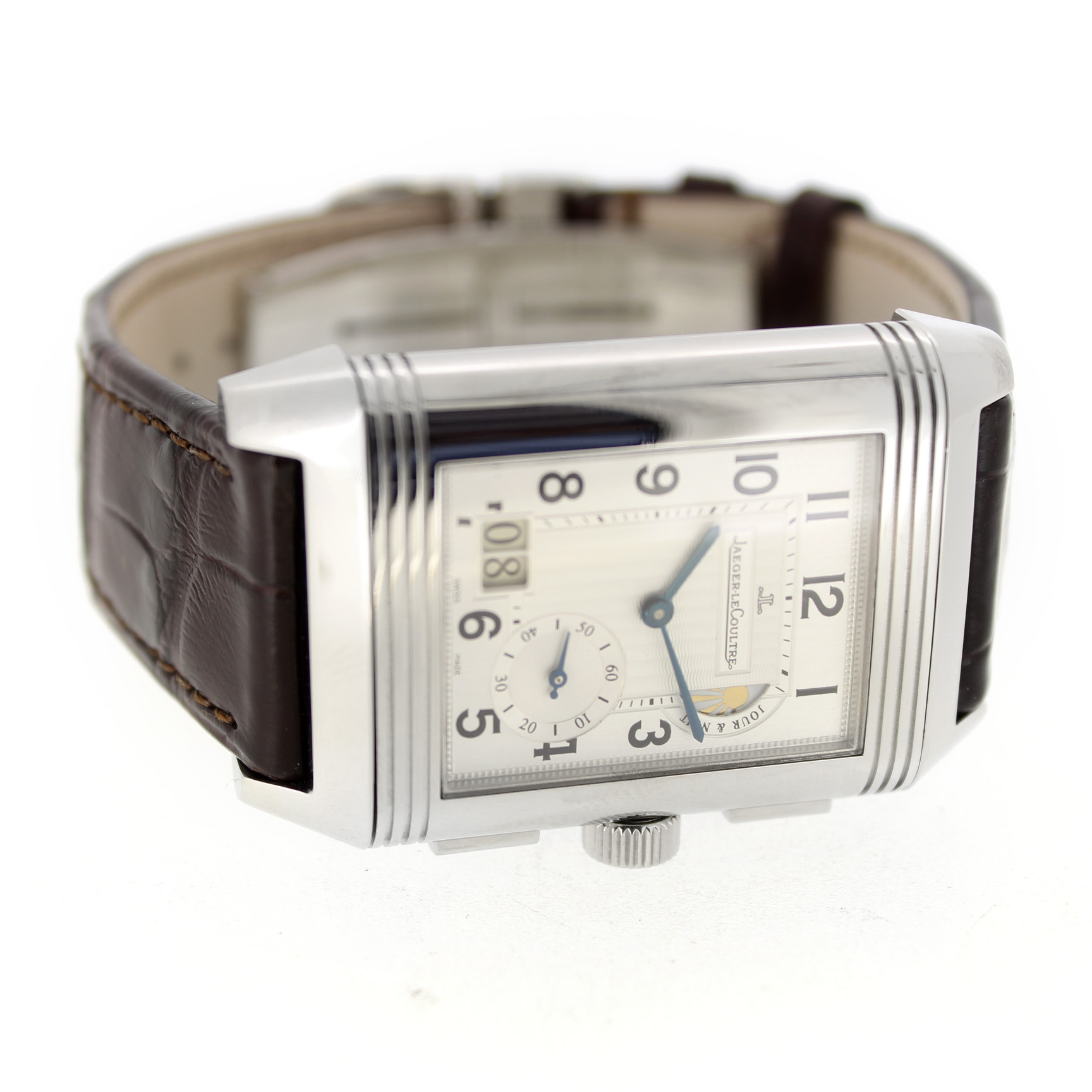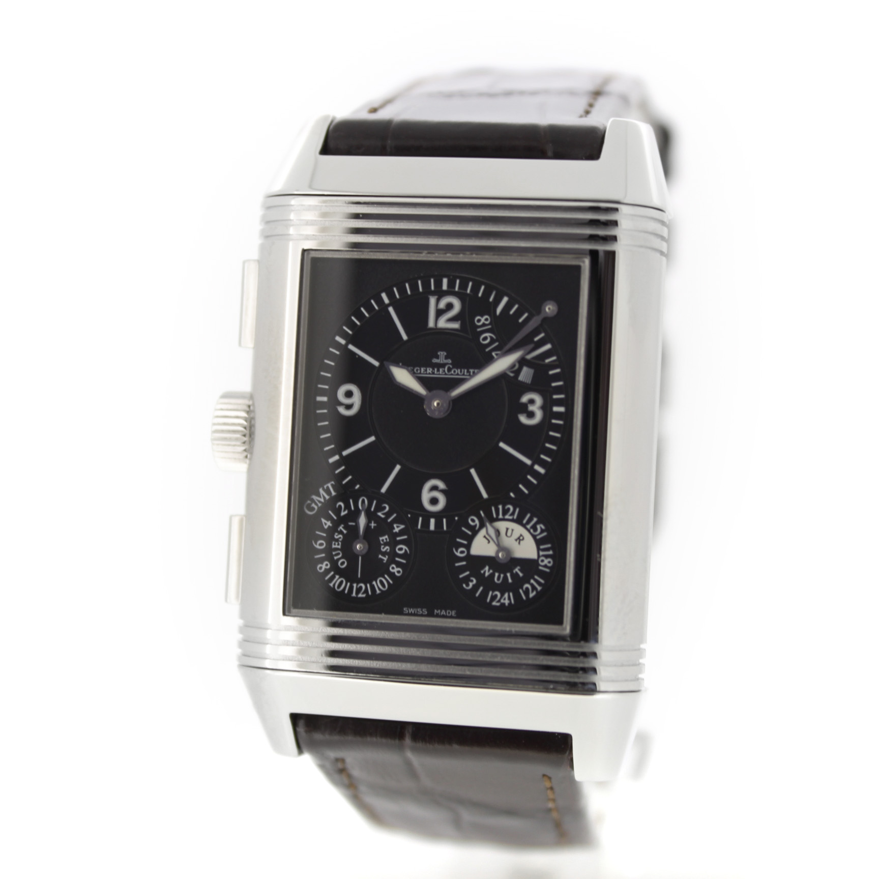 Jaeger-LeCoultre Reverso Grande Gmt 240.8.18 horloge is tweedehands te koop in onze zaak en heeft een 29mm staal kast met een bruin leren band. Het horloge beschikt over een zilverkleurige of zwarte wijzerplaat.