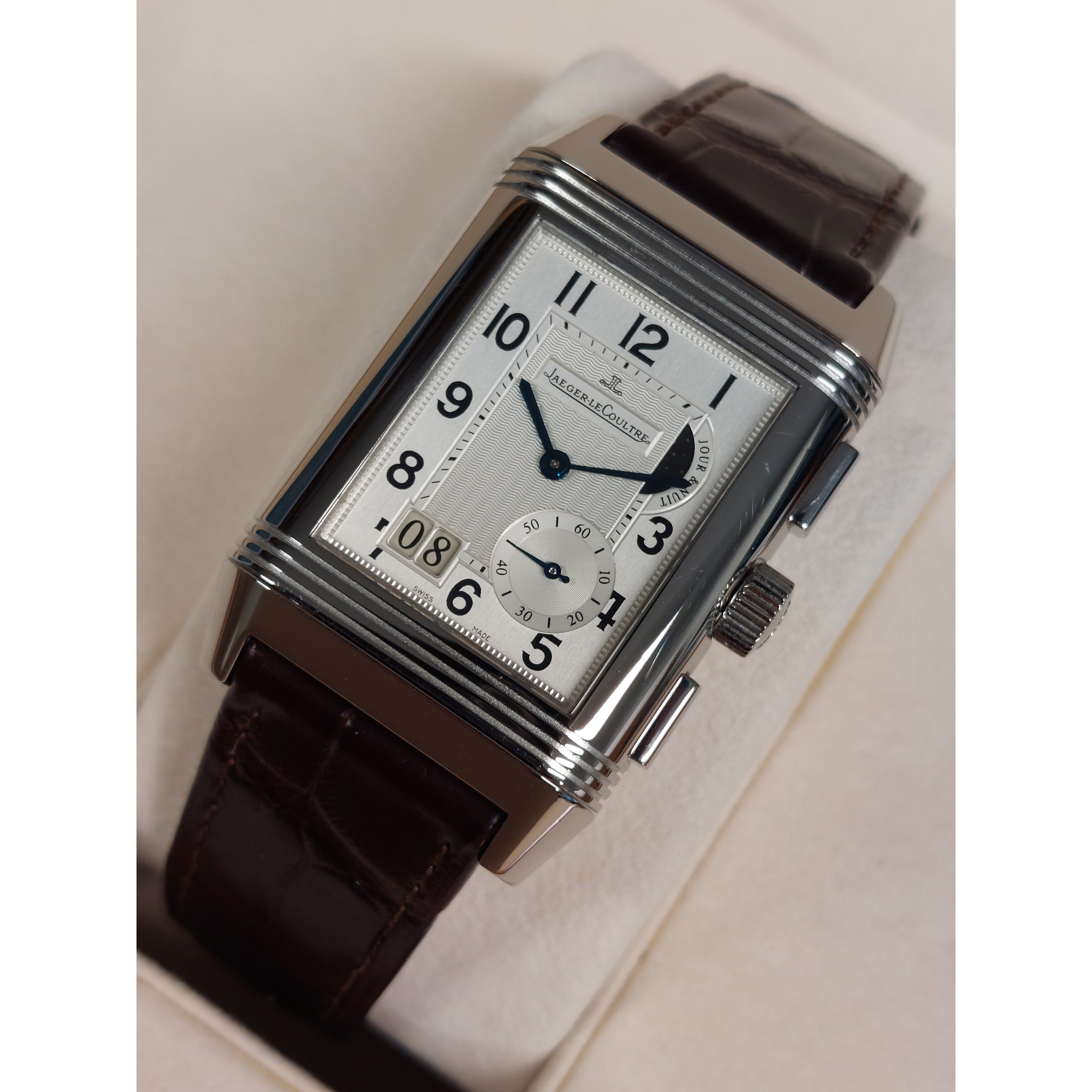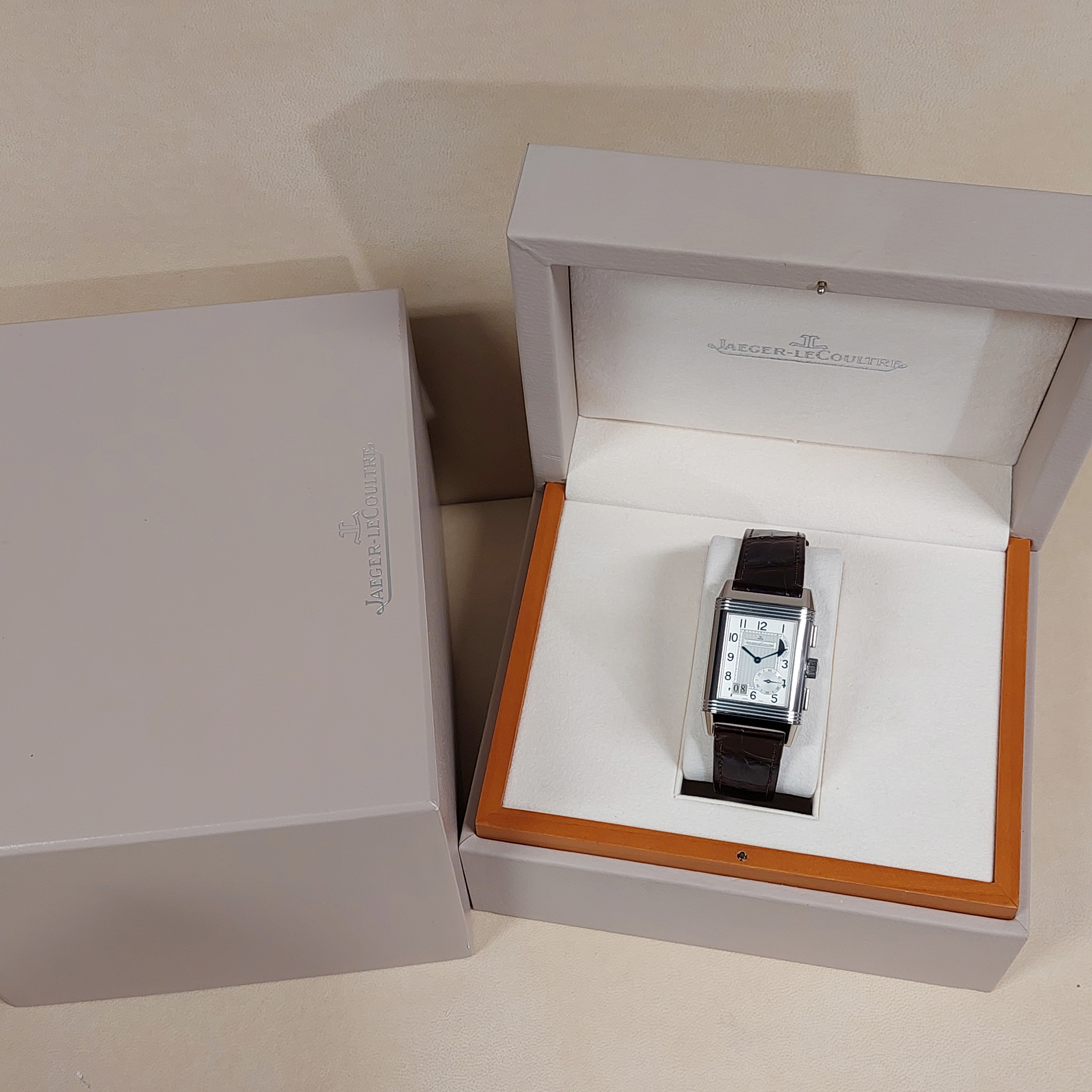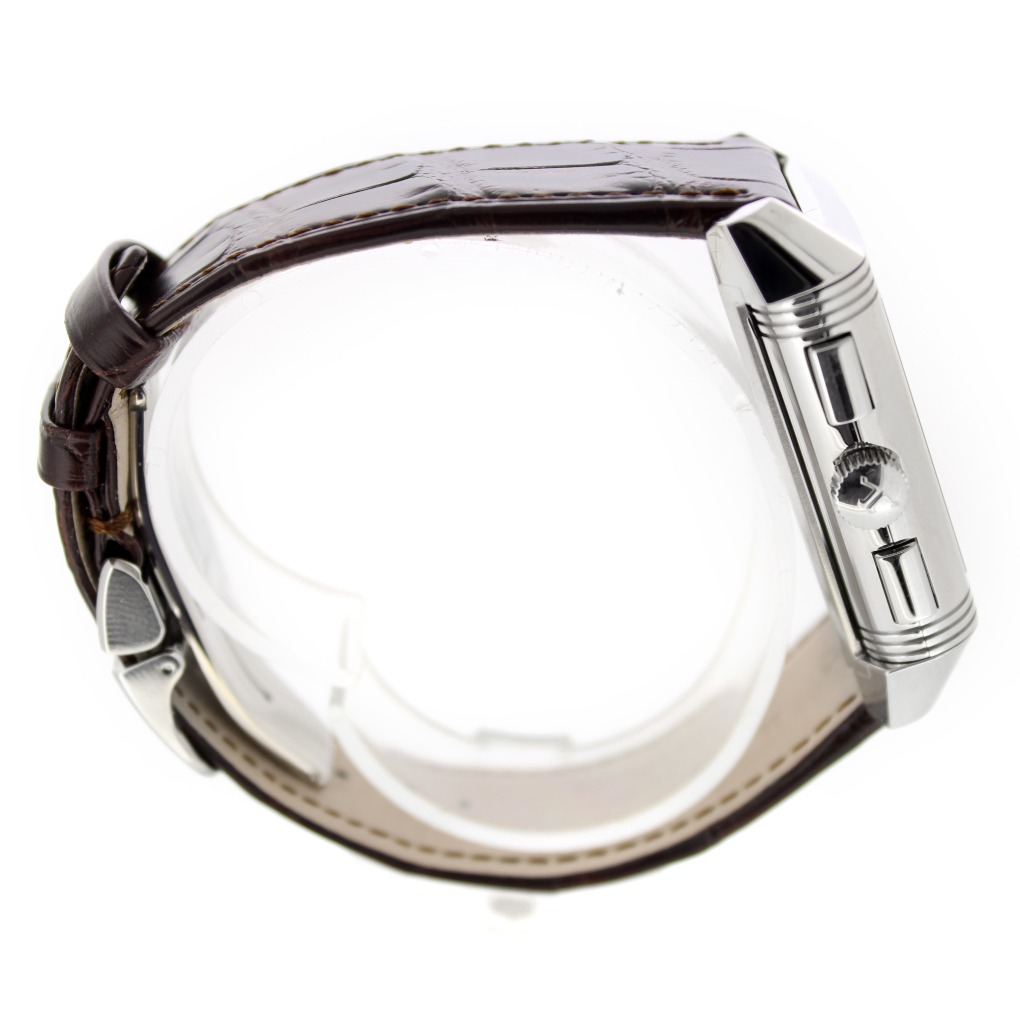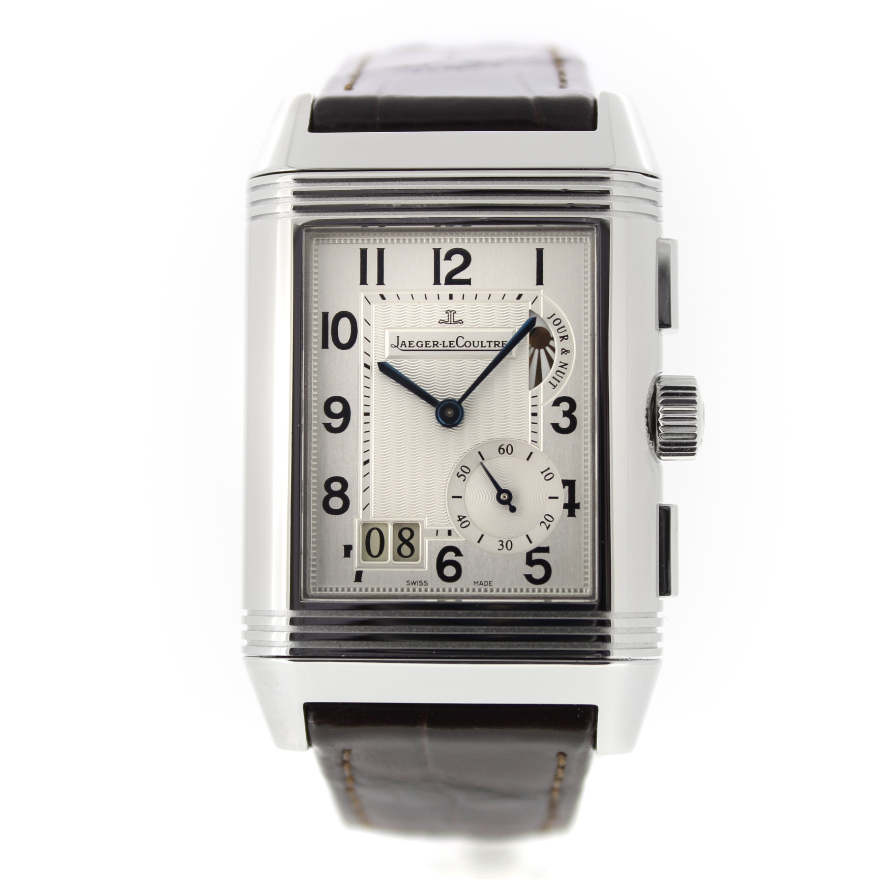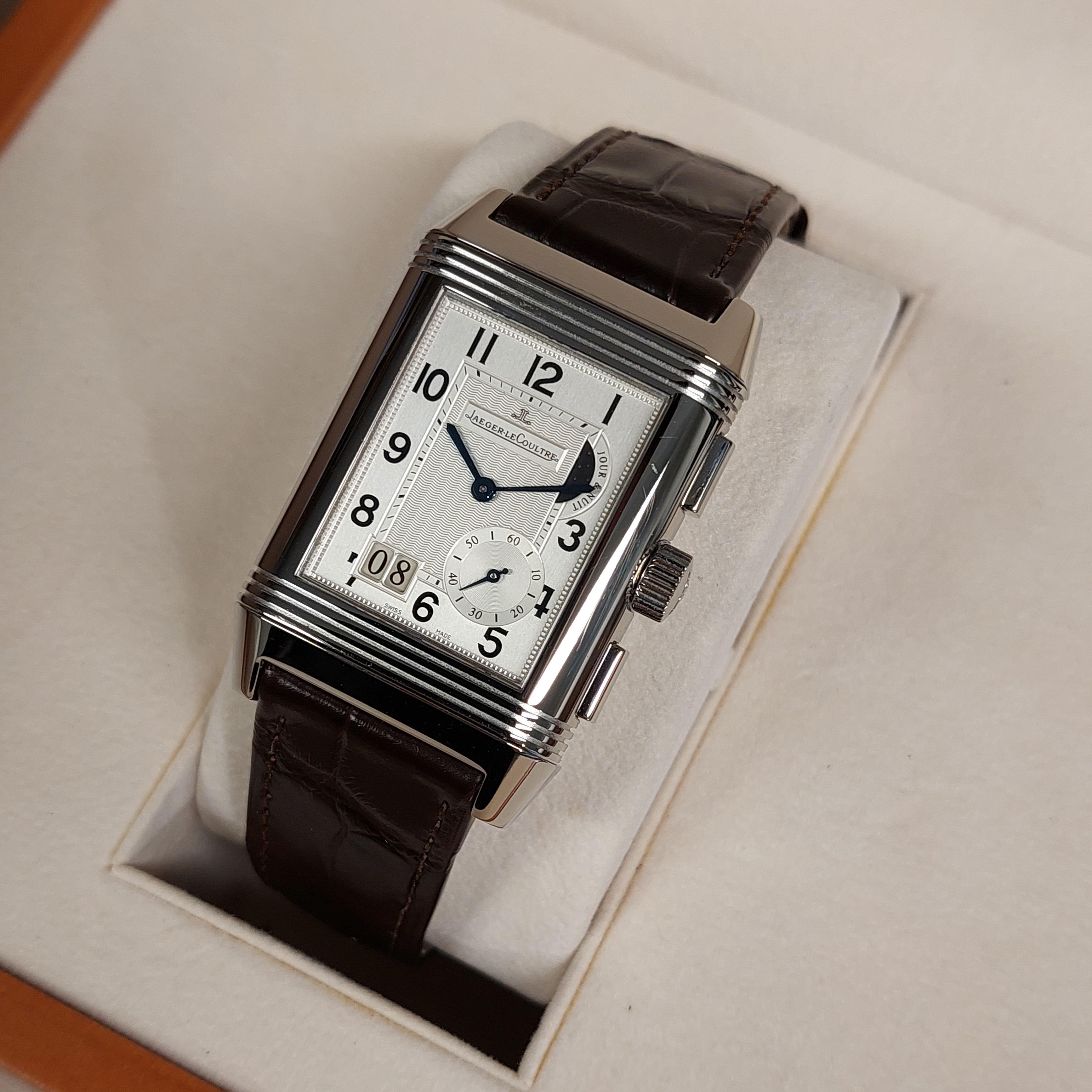 Jaeger-LeCoultre Reverso Grande Gmt 240.8.18 horloge is tweedehands te koop in onze zaak en heeft een 29mm staal kast met een bruin leren band. Het horloge beschikt over een zilverkleurige of zwarte wijzerplaat.