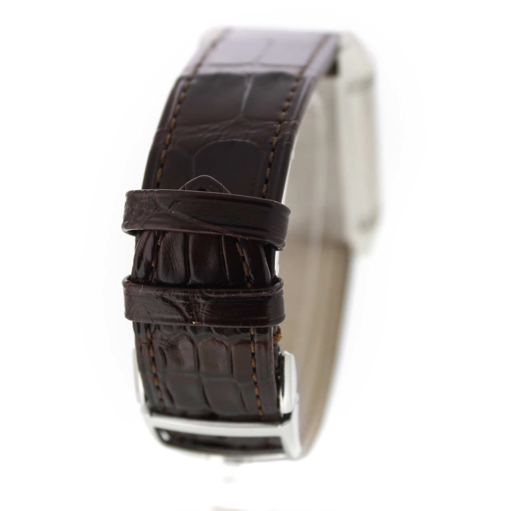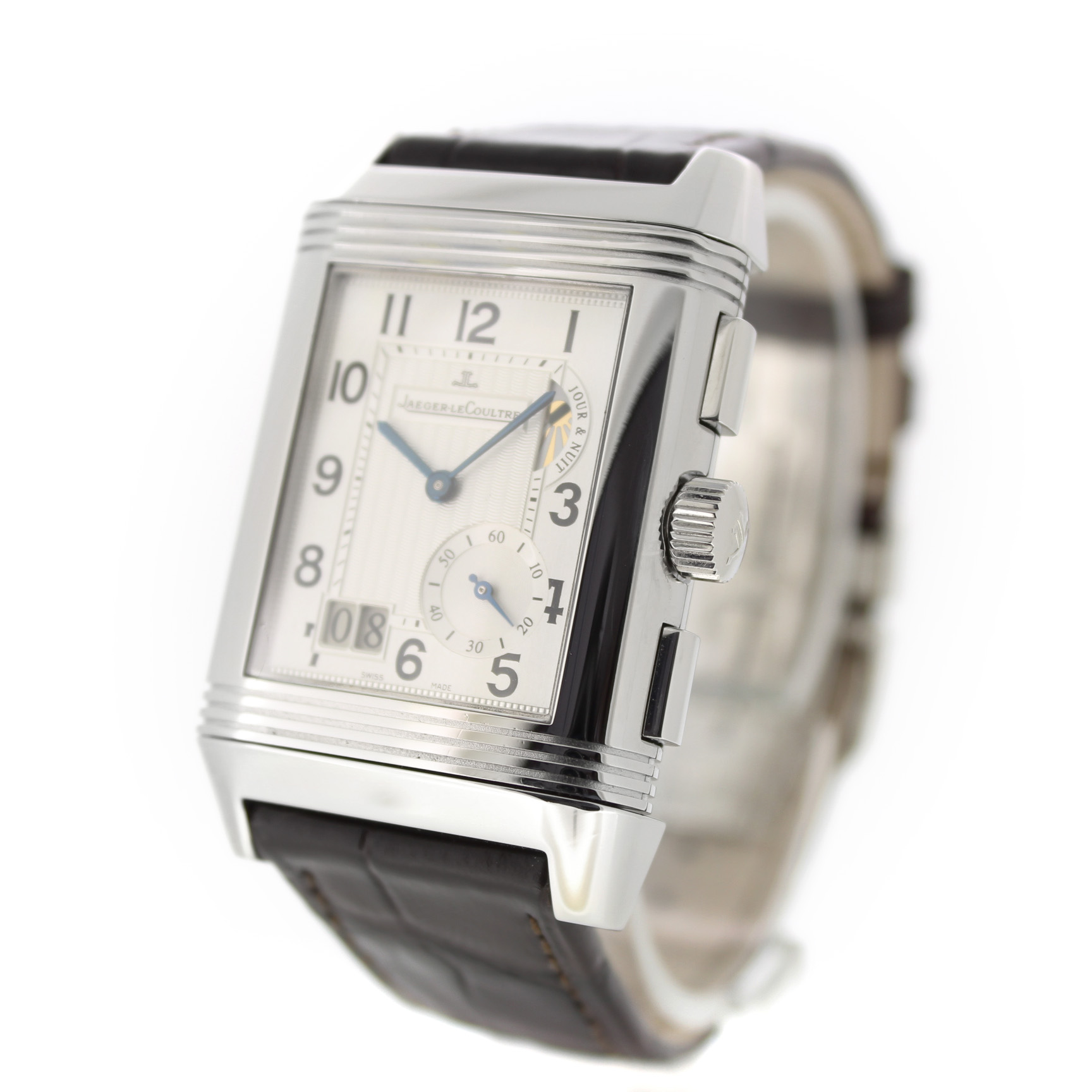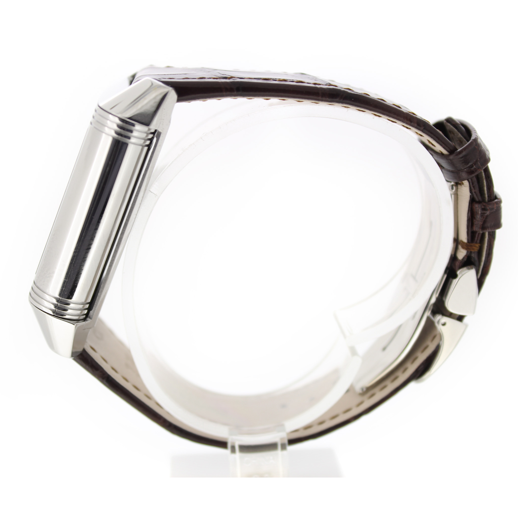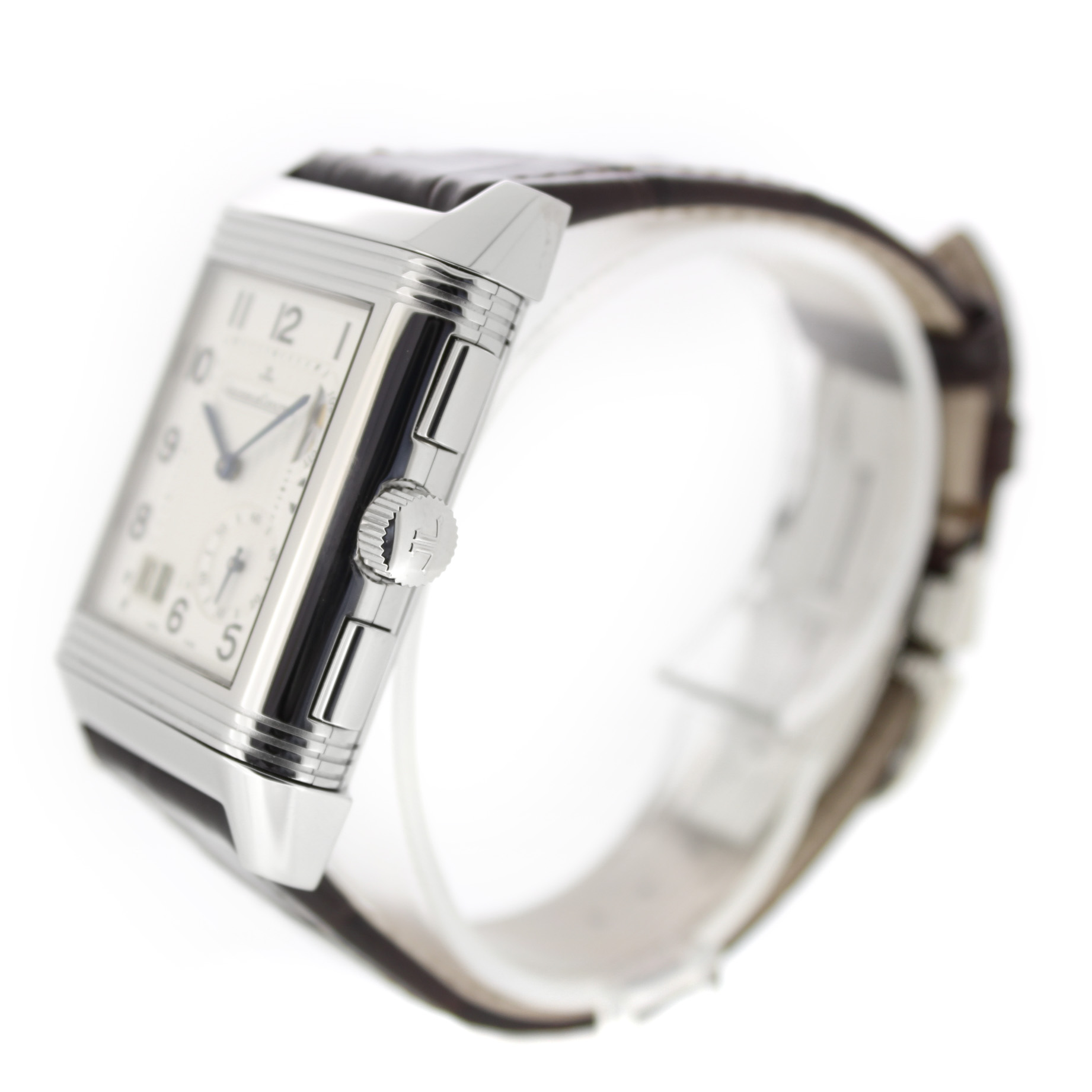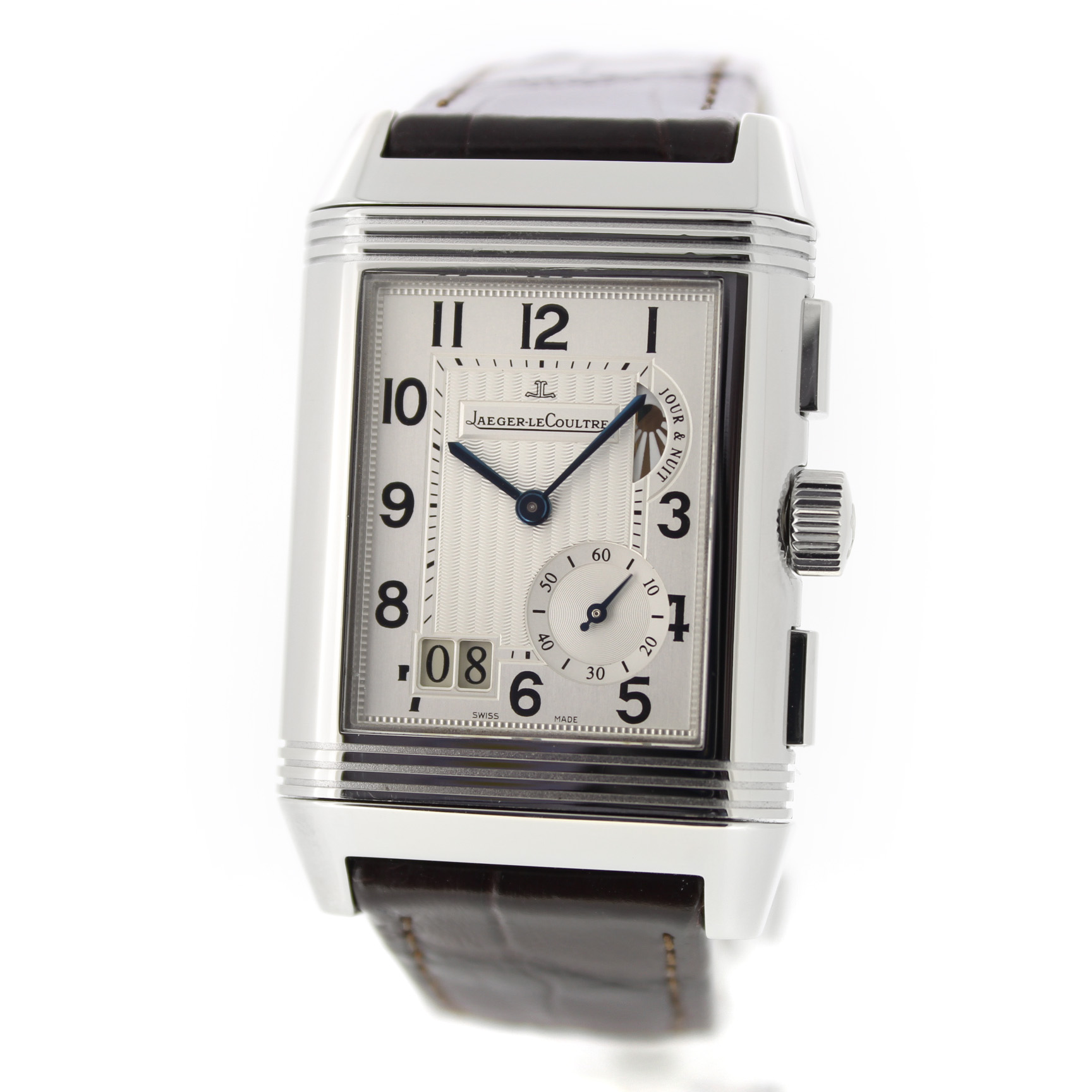 Jaeger-LeCoultre Reverso Grande Gmt 240.8.18 horloge is tweedehands te koop in onze zaak en heeft een 29mm staal kast met een bruin leren band. Het horloge beschikt over een zilverkleurige of zwarte wijzerplaat.