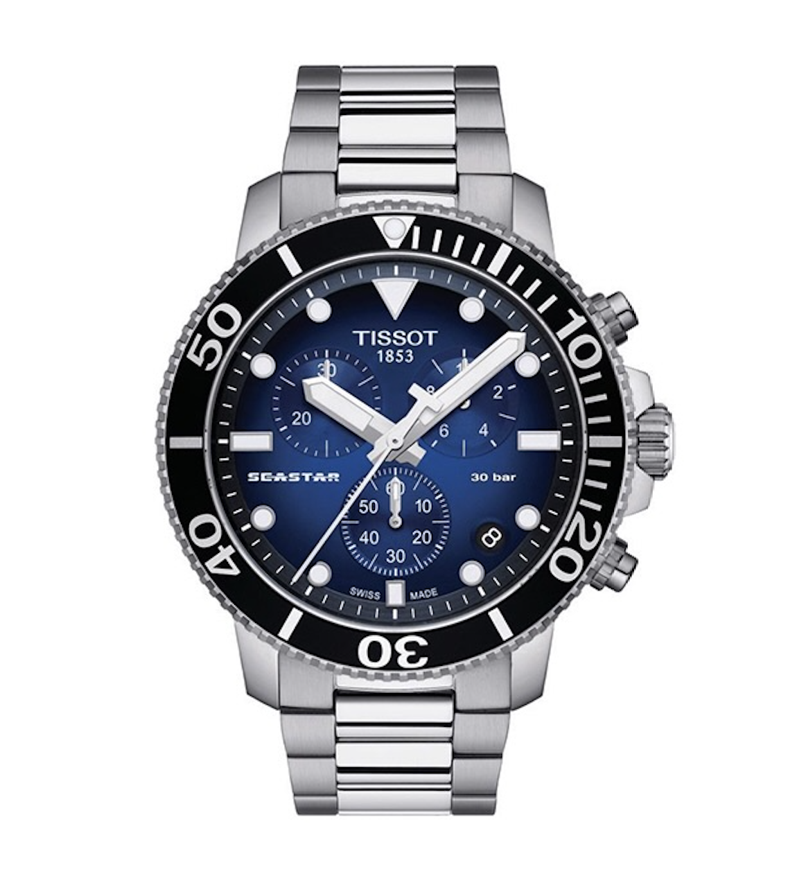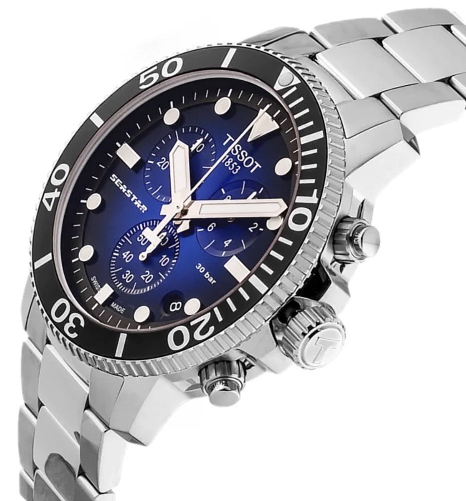 De Tissot Seastar 1000 combineert stijl en prestaties zonder compromissen. De duikinspiratie vormt zowel het uiterlijk als de functionaliteit van dit horloge. Het behoudt zijn prestaties tot een druk van 30 bar (300 m/1'000 ft), een combinatie van onderwatersporten en een voorkeur voor een geavanceerd Zwitsers uurwerk.
