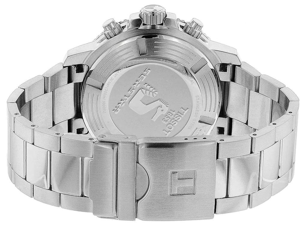 Deze Tissot T120.417.11.041.01 uit de T-Sport Seastar collectie is vervaardigd uit een 45mm zilverkleurige staal kast en band. Het horloge heeft een blauwe wijzerplaat met een datum aanduiding en een chronograaf en is tot 300M waterdicht.