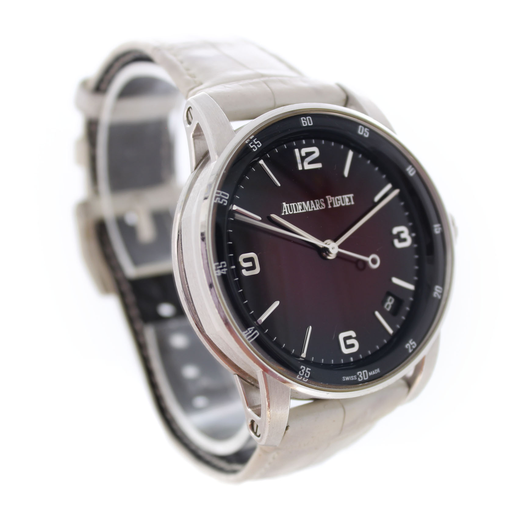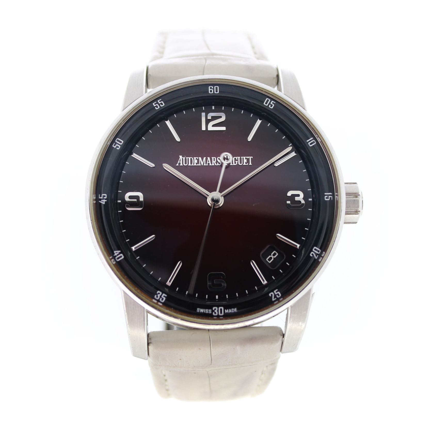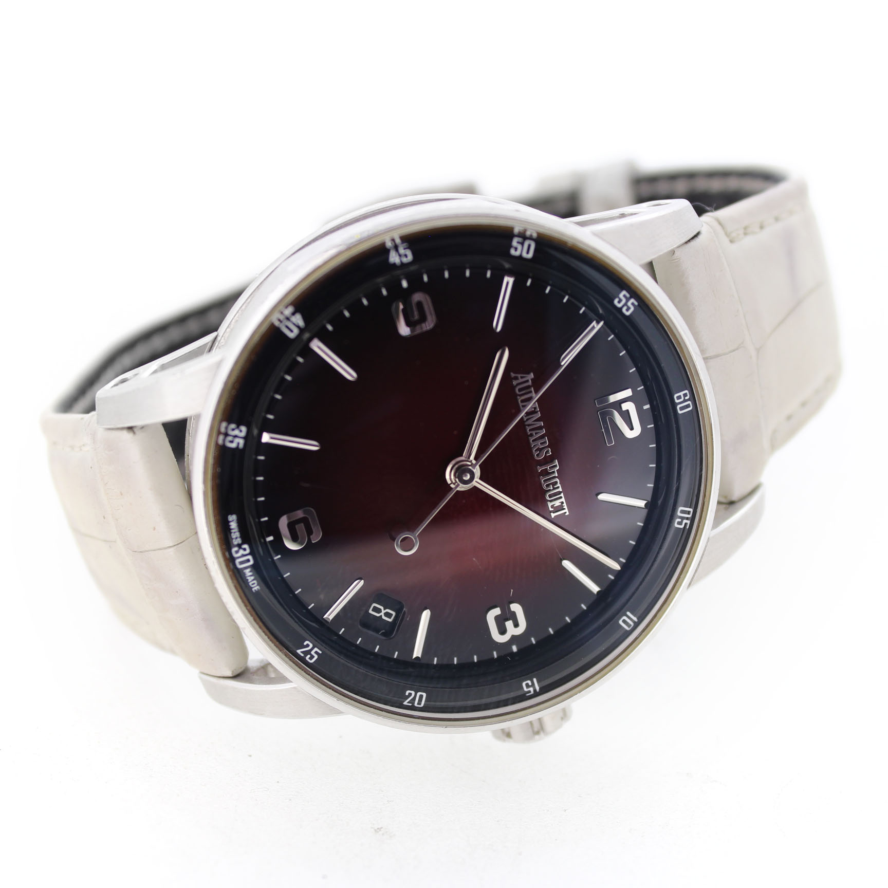 Dit verfijnde Audemars Piguet Code 11.59 horloge met referentie 15210BC.OO.A500KB.01 is momenteel tweedehands beschikbaar. Het model beschikt over een 41 mm kast vervaardigd uit 18 karaat witgoud en is afgewerkt met een elegante witte krokodillenlederen armband. De diep bordeauxrode wijzerplaat met datumvenster op 4 uur geeft het geheel een unieke en stijlvolle uitstraling.