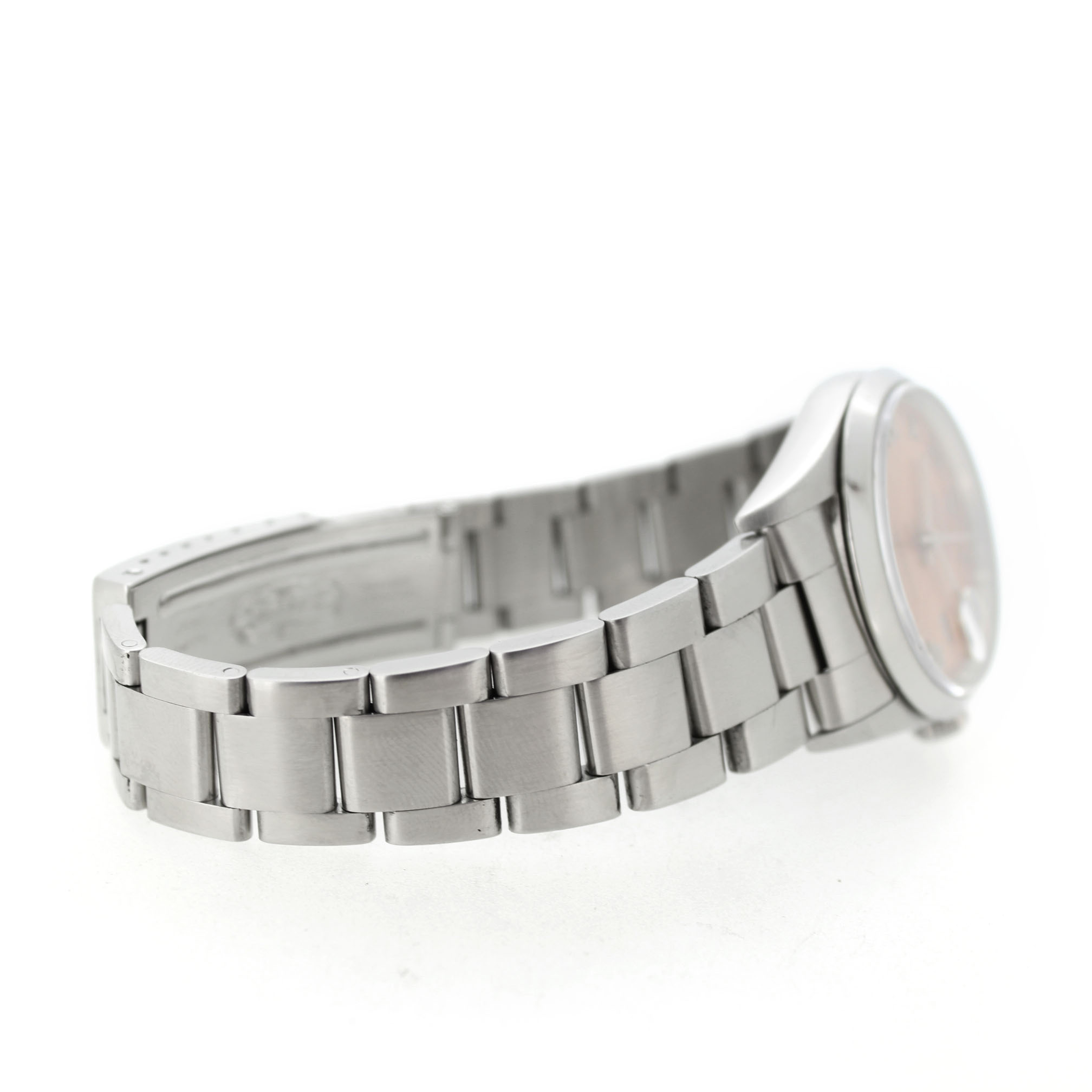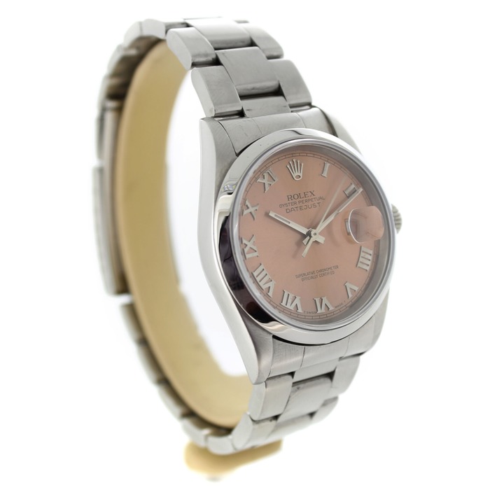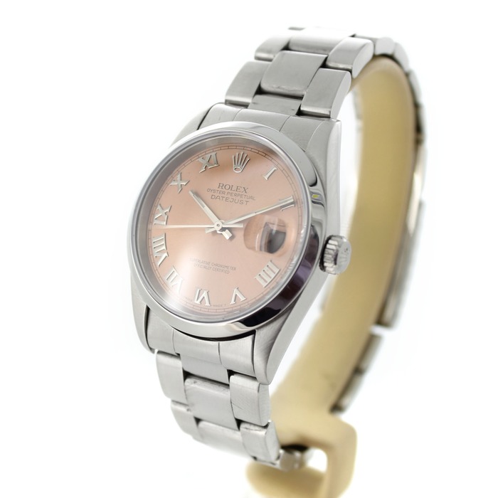 Het Rolex Datejust 16200 horloge beschikt over een 36mm staal kast en armband. Het horloge is voorzien van een zalmroze wijzerplaat met een datum aanduiding op 3 uur.