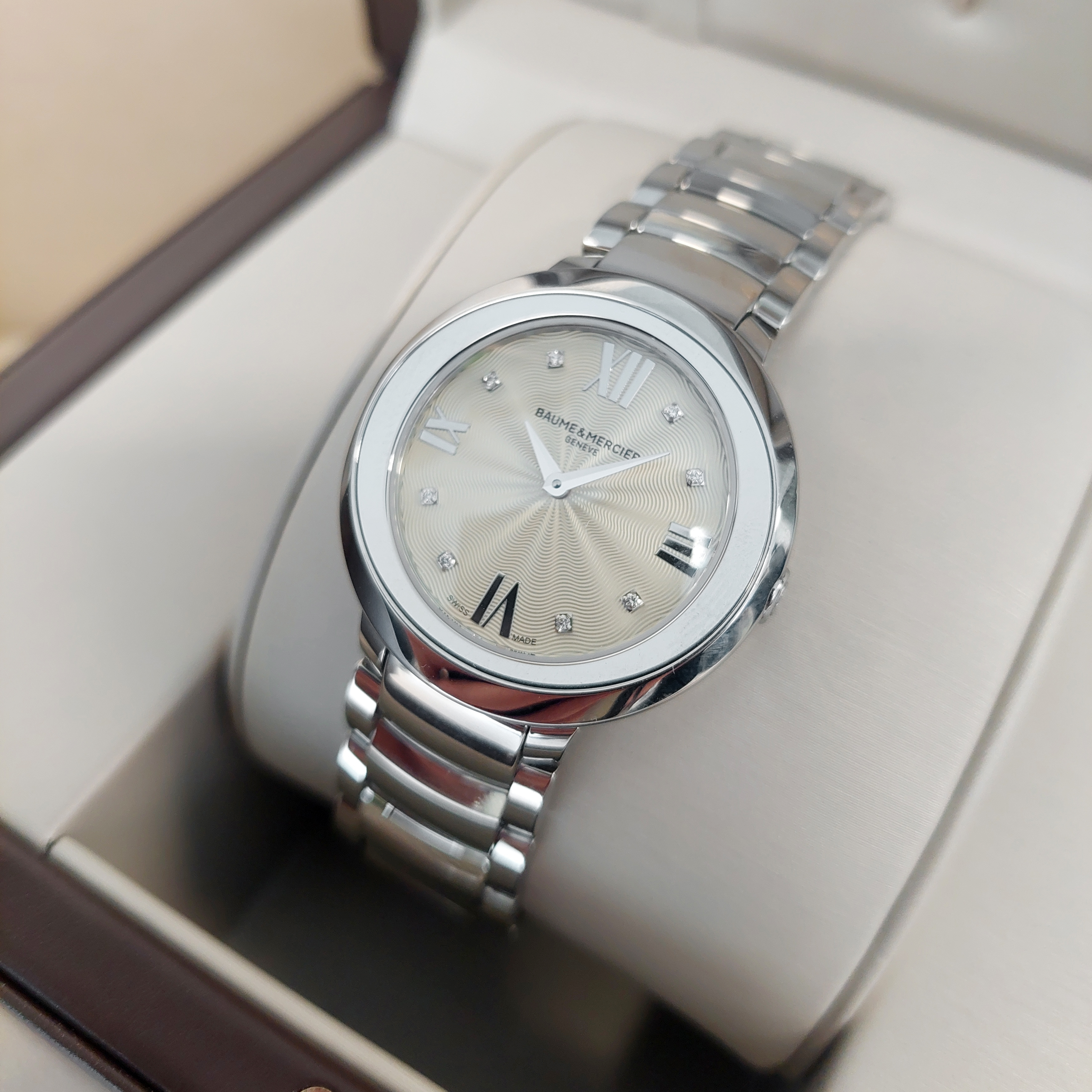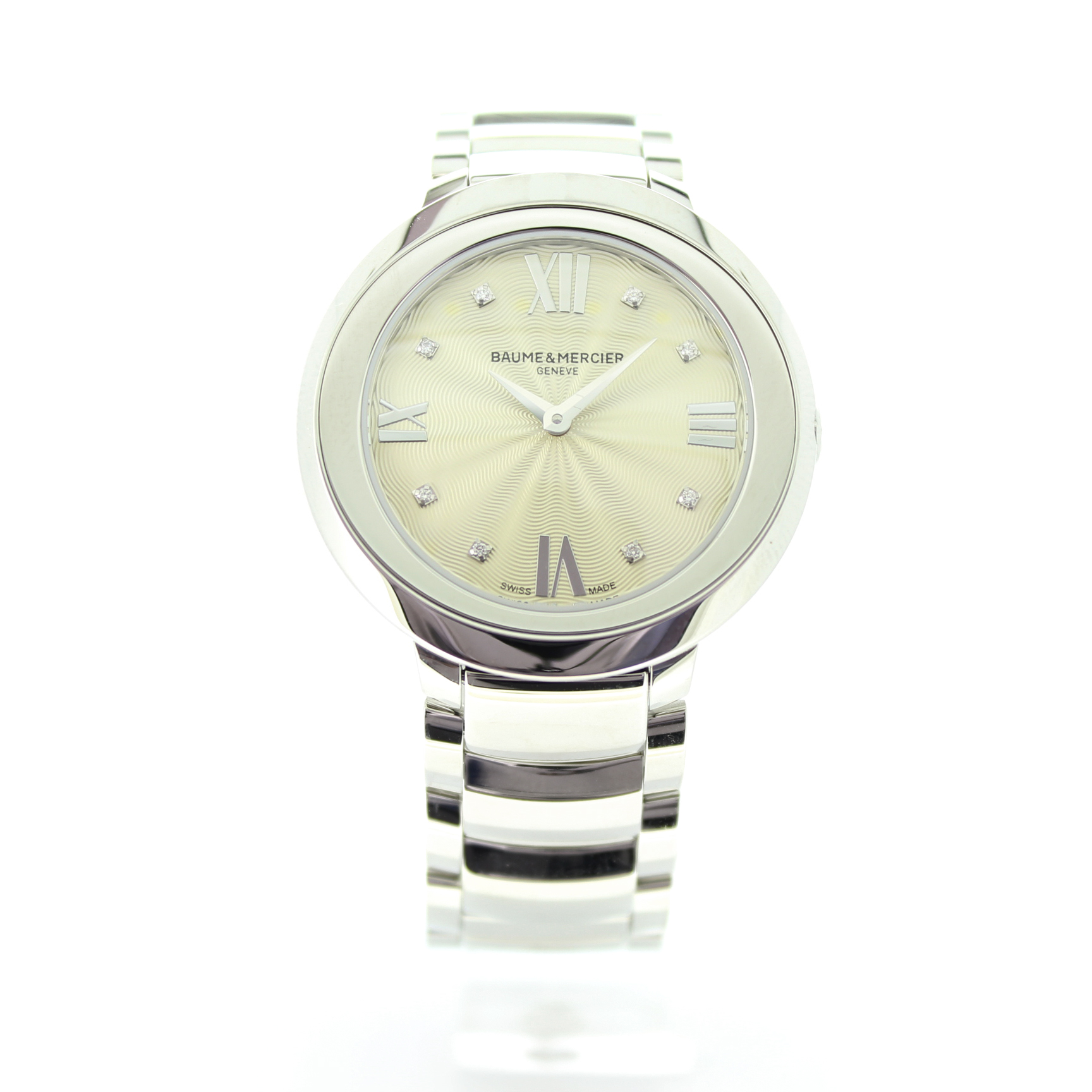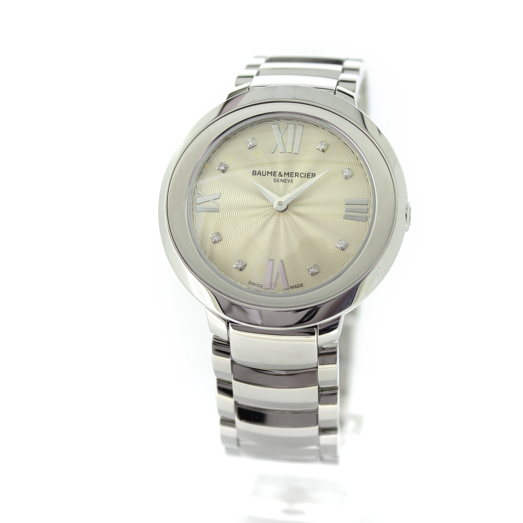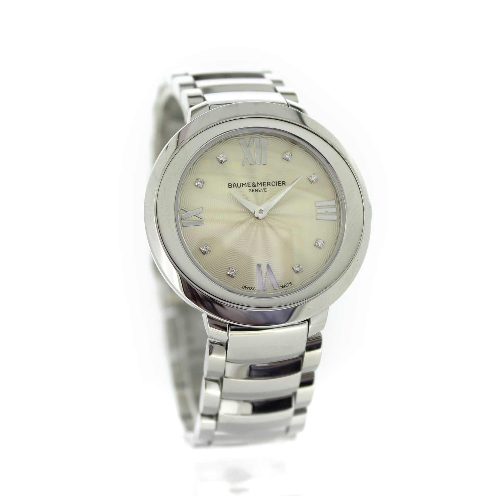 Het tweedehands dames Baume & Mercier promesse M0A10250 horloge is een quartz en heeft een zilverkleurige staal kast en band. De wijzerplaat heeft een parelmoer kleur en wordt beschermd met een saffier glas.