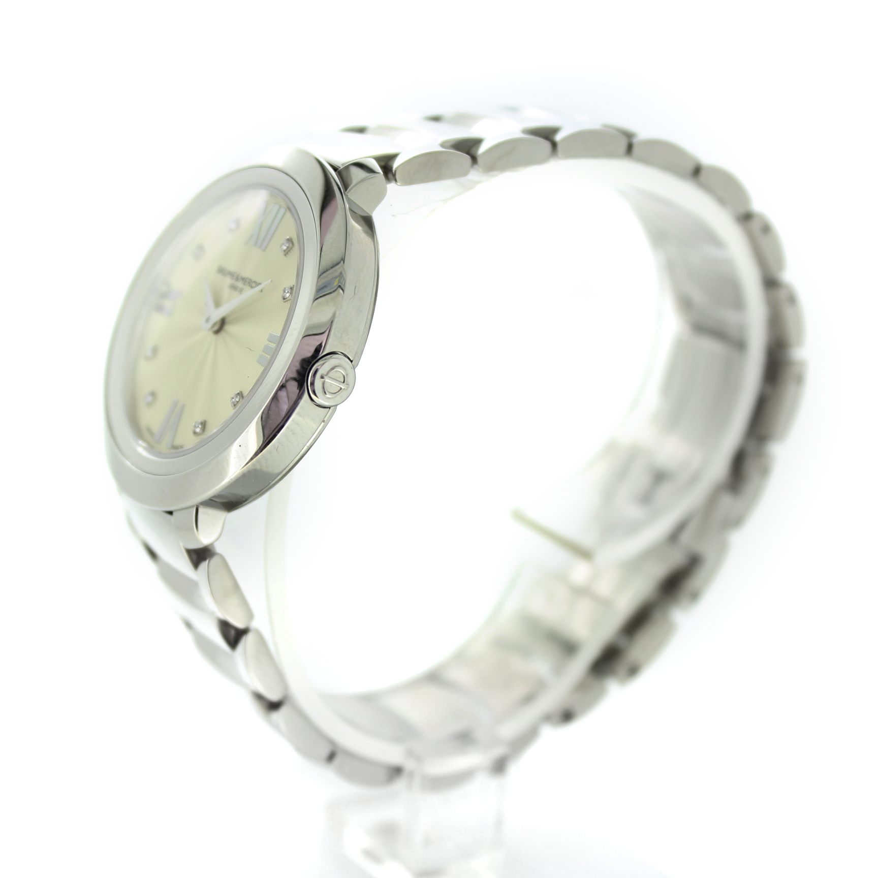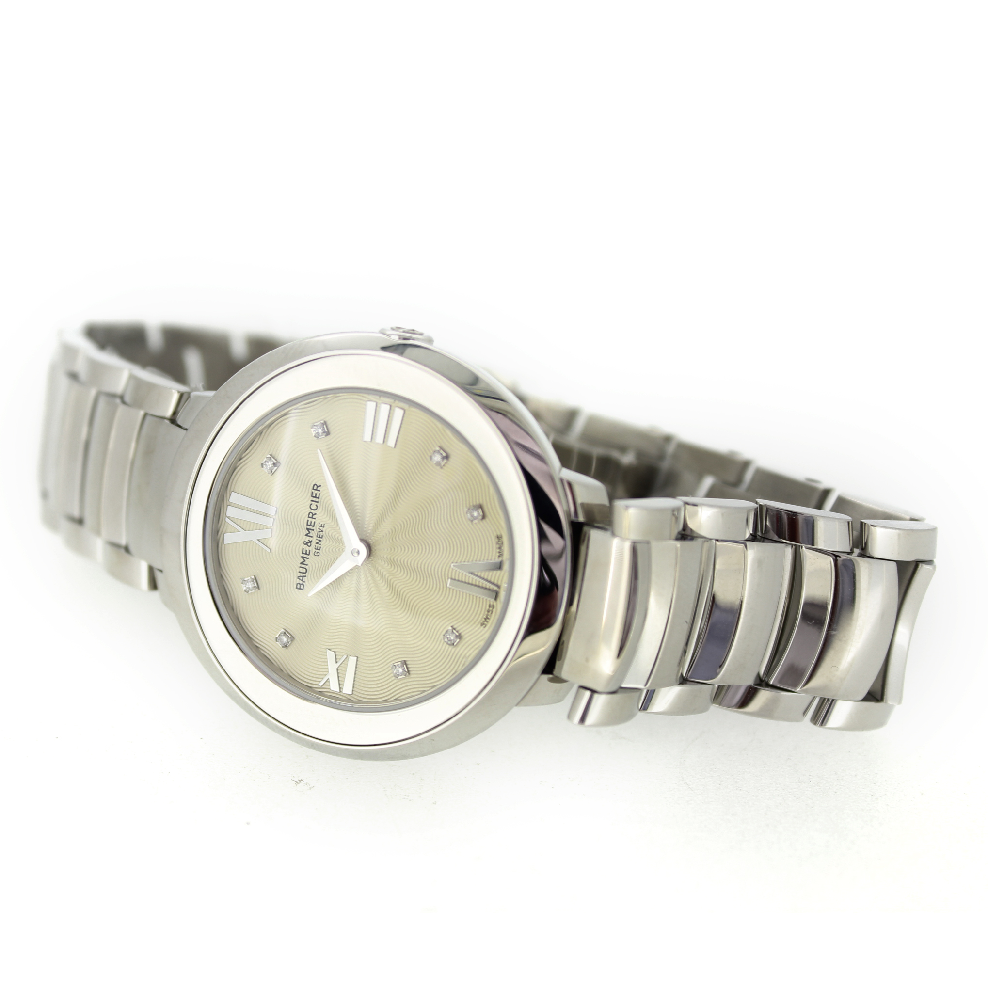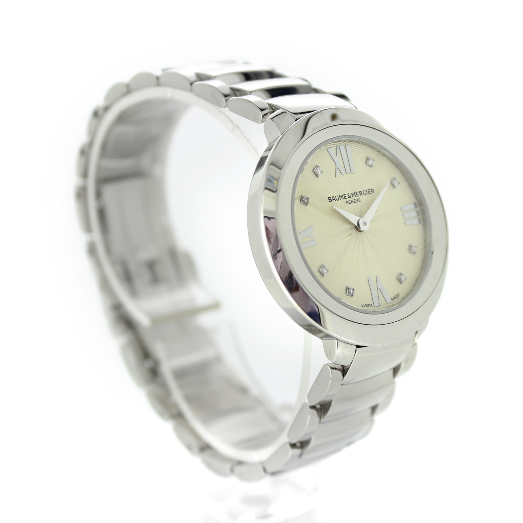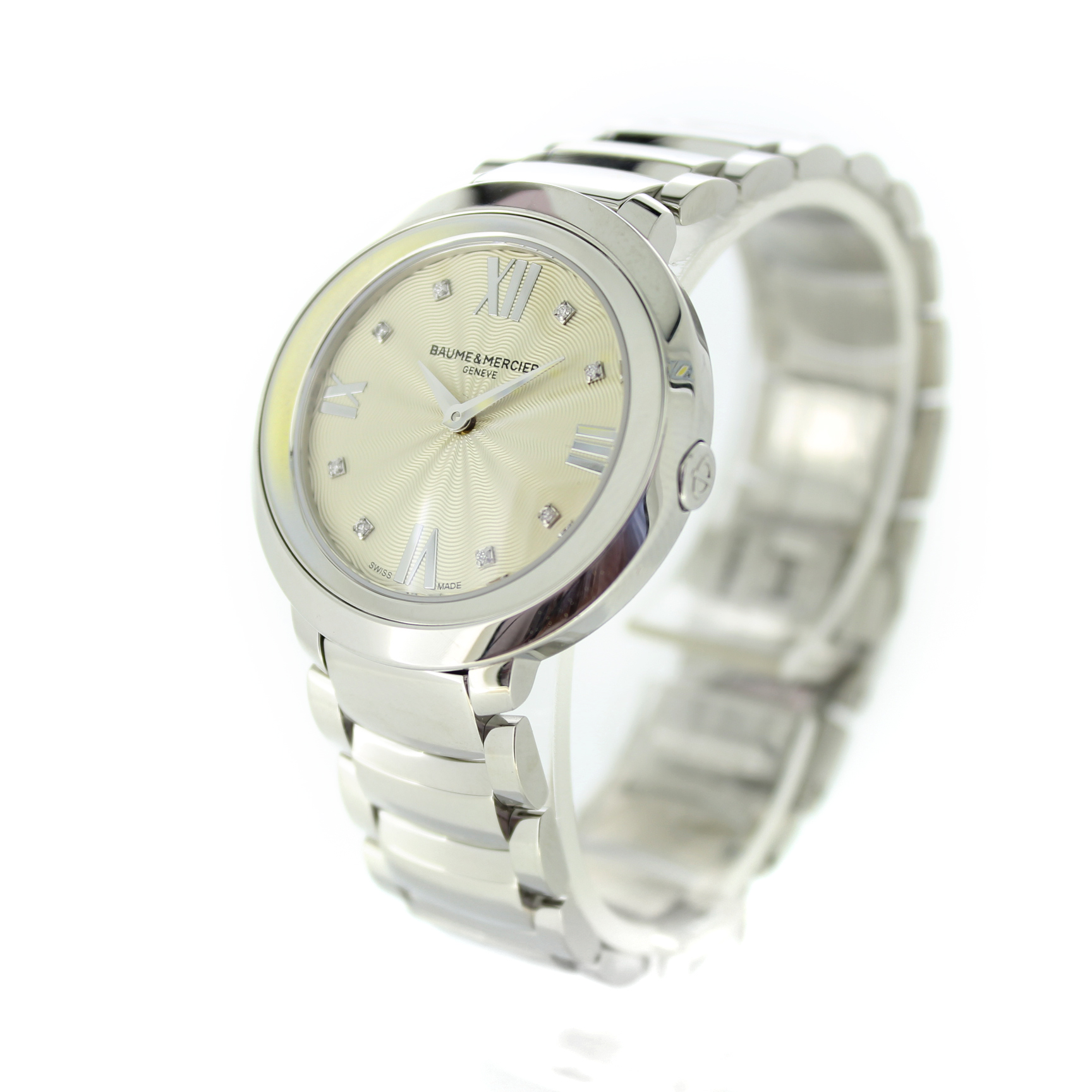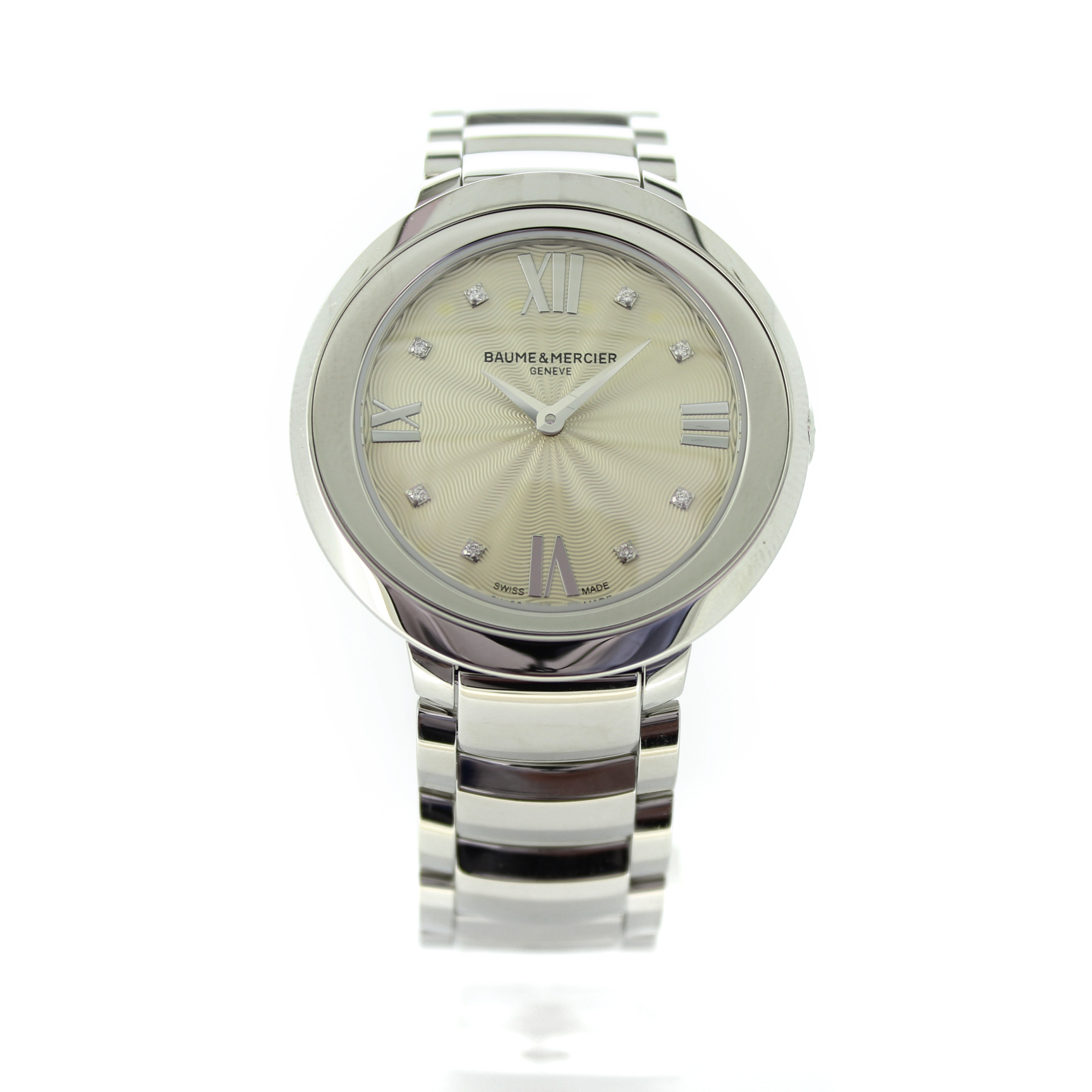 Het tweedehands dames Baume & Mercier promesse M0A10250 horloge is een quartz en heeft een zilverkleurige staal kast en band. De wijzerplaat heeft een parelmoer kleur en wordt beschermd met een saffier glas.