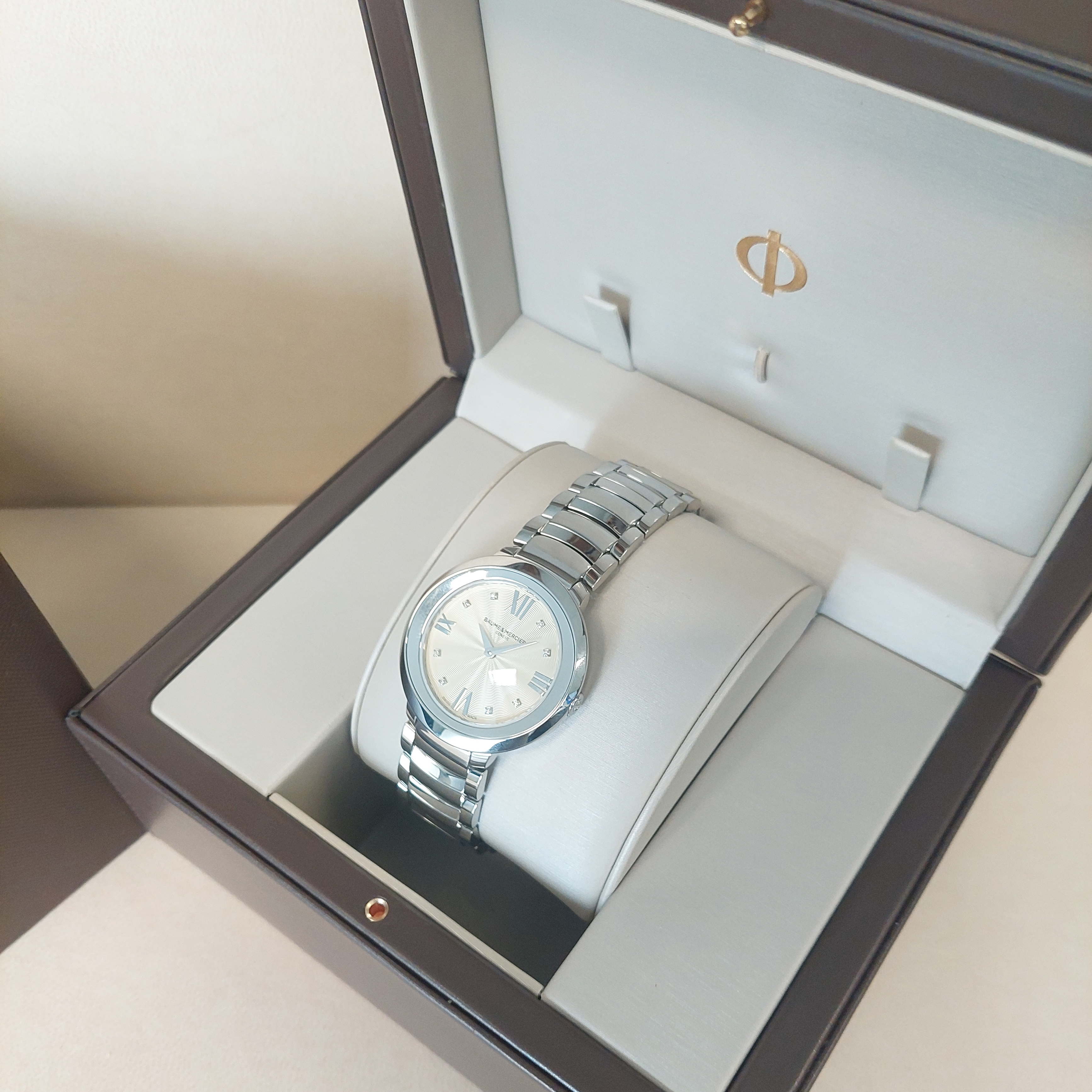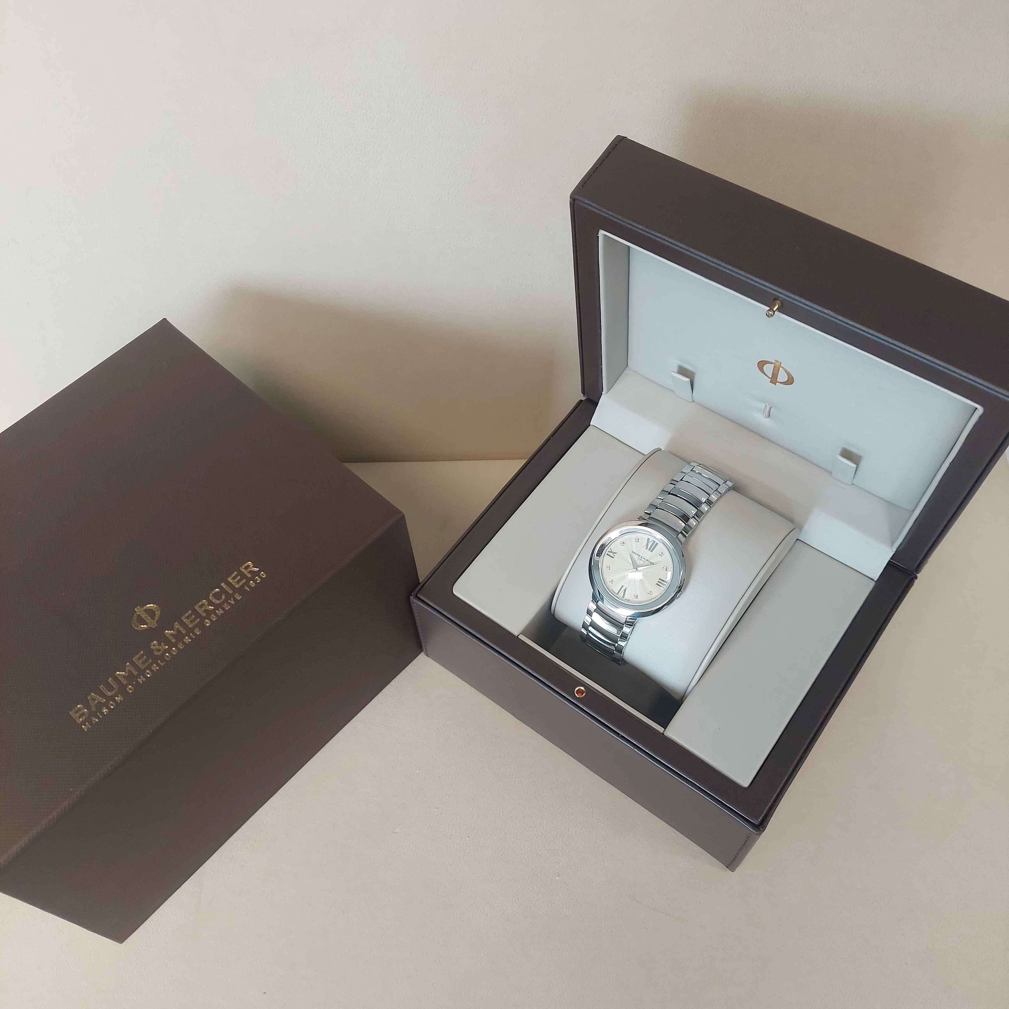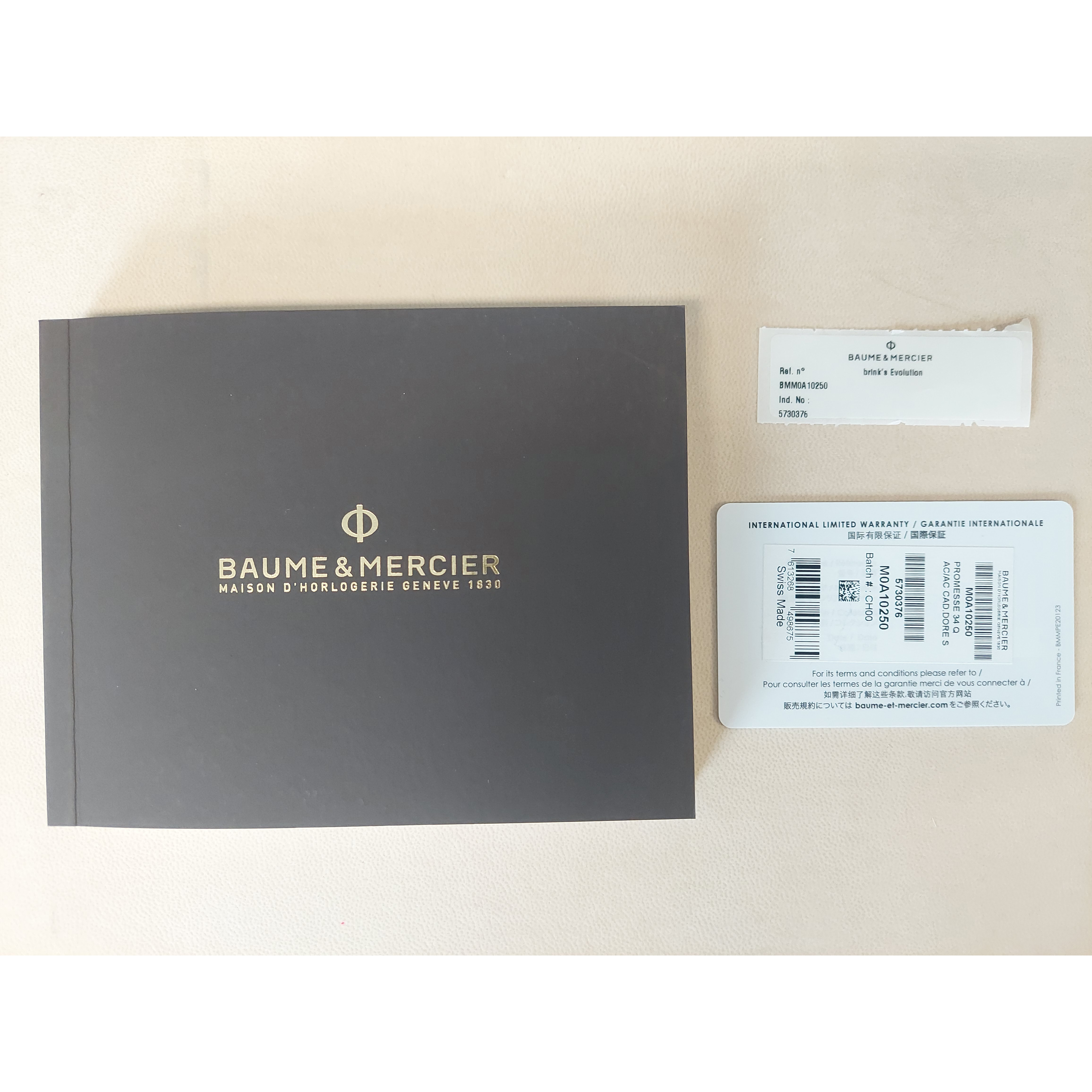 - De Baume & Mercier doos en documenten zijn aanwezig.