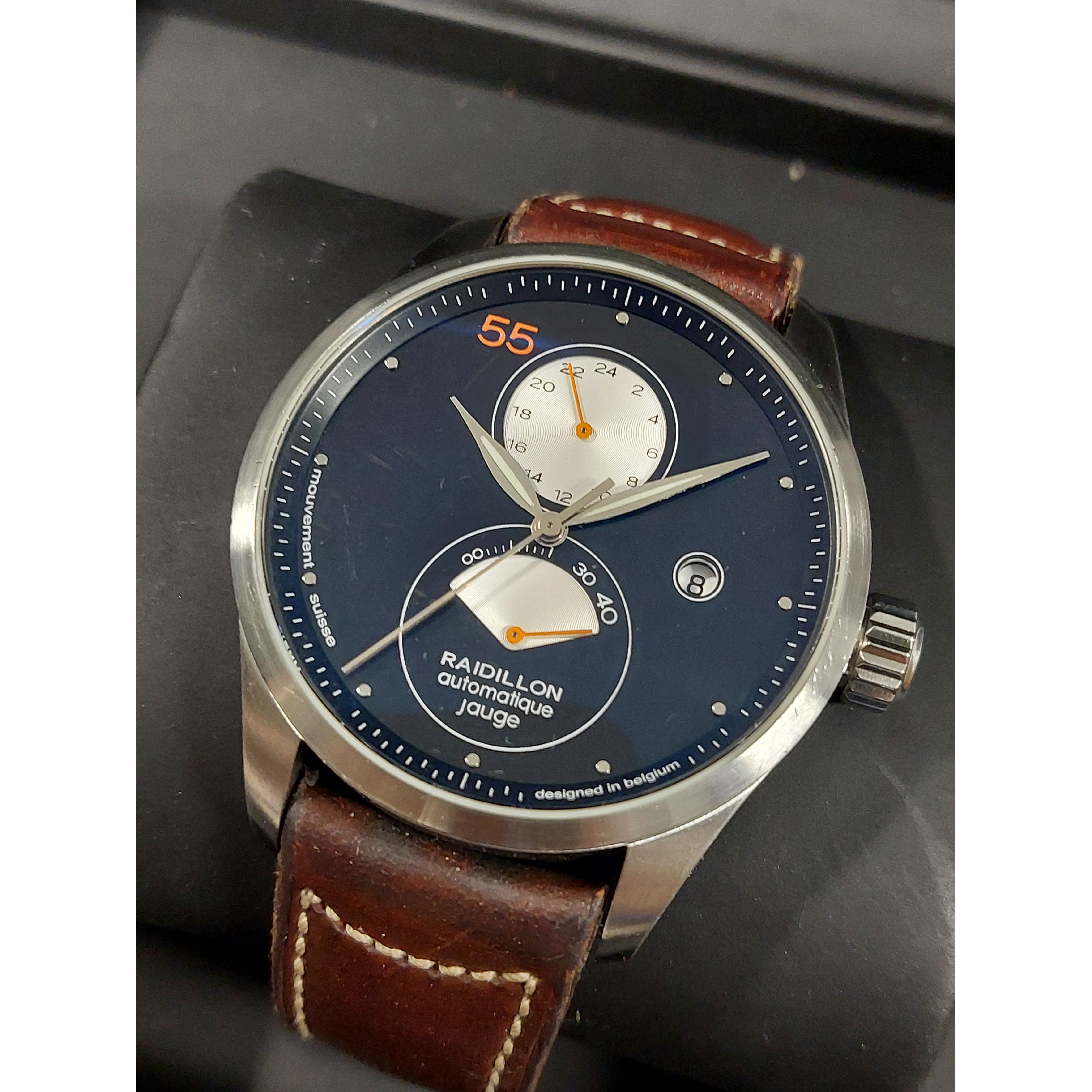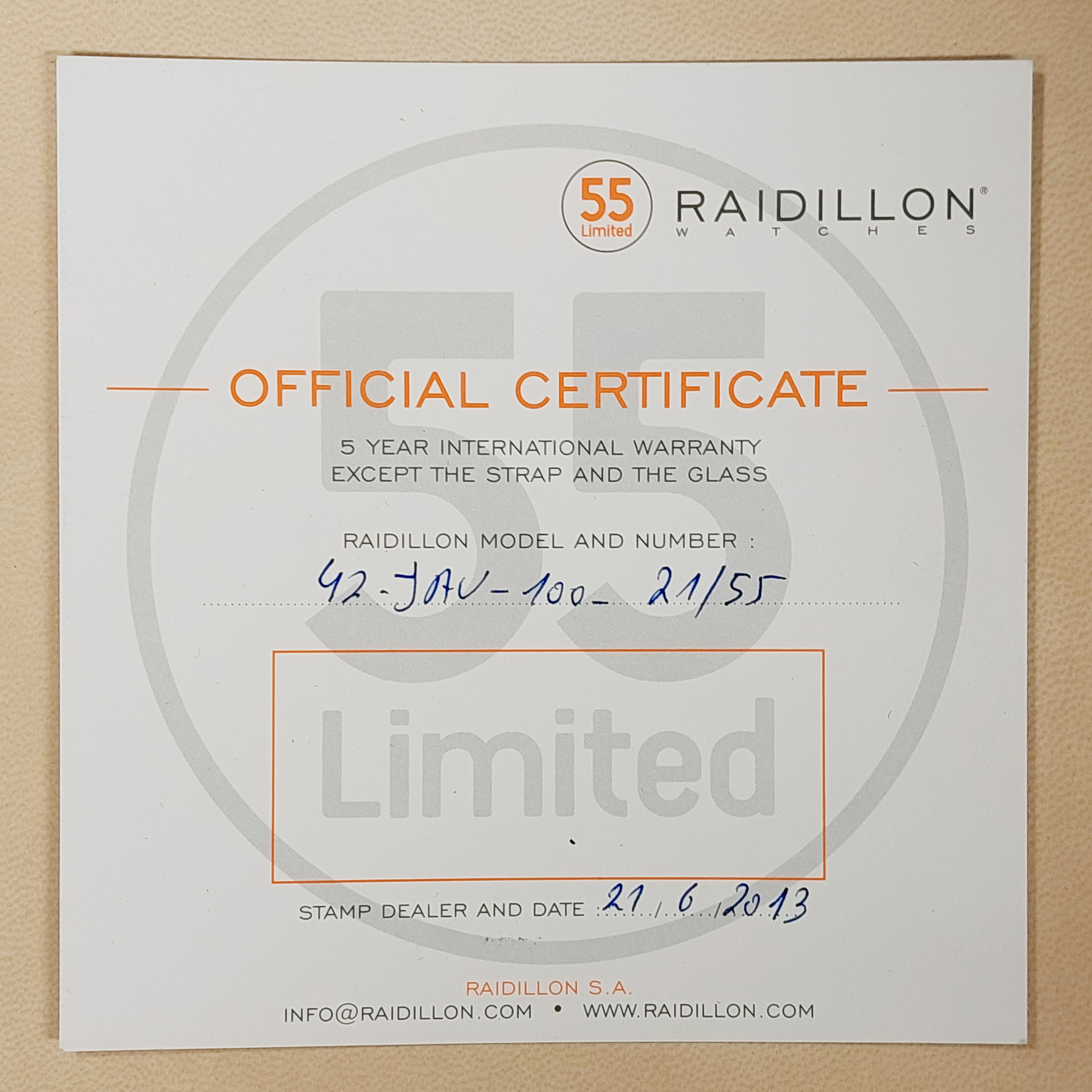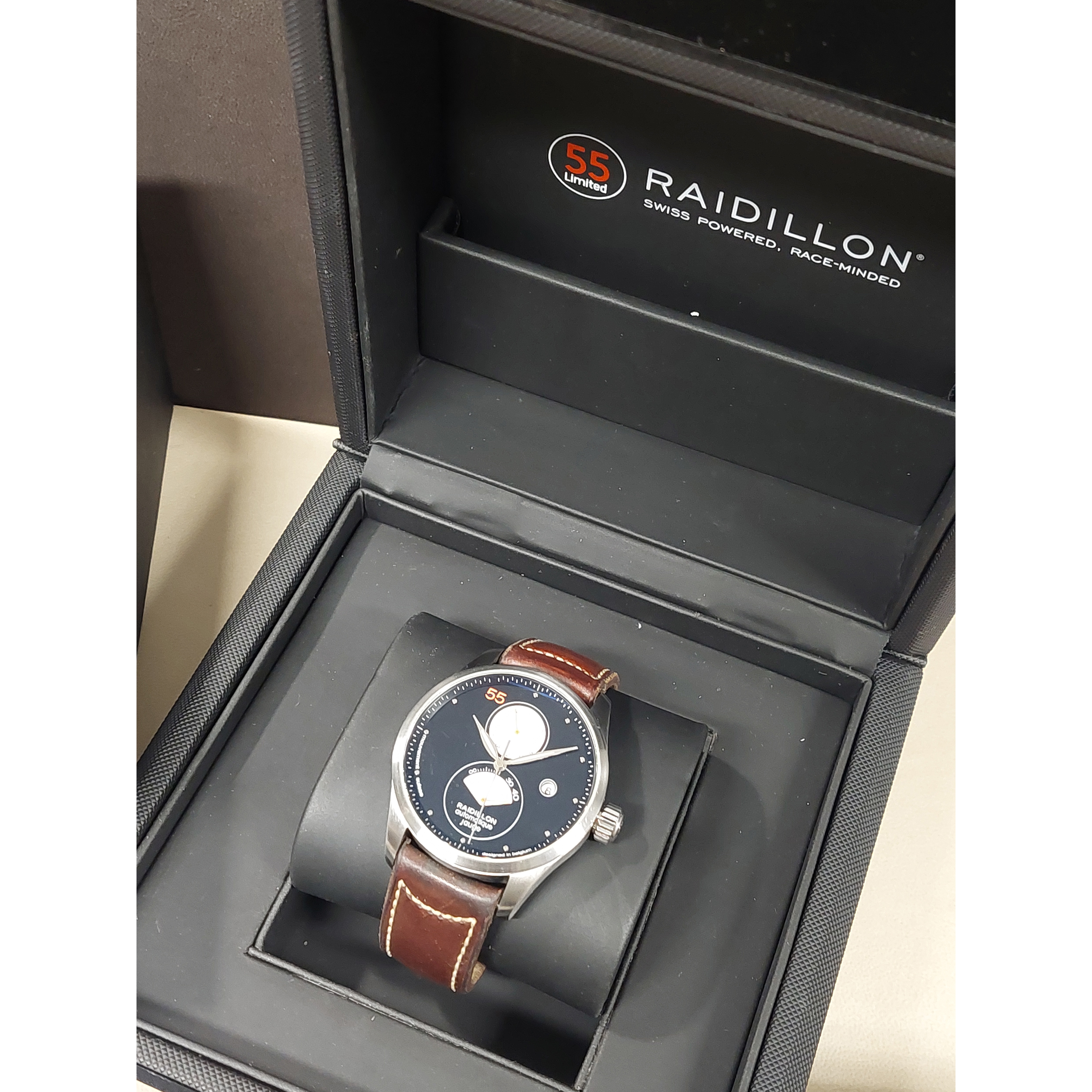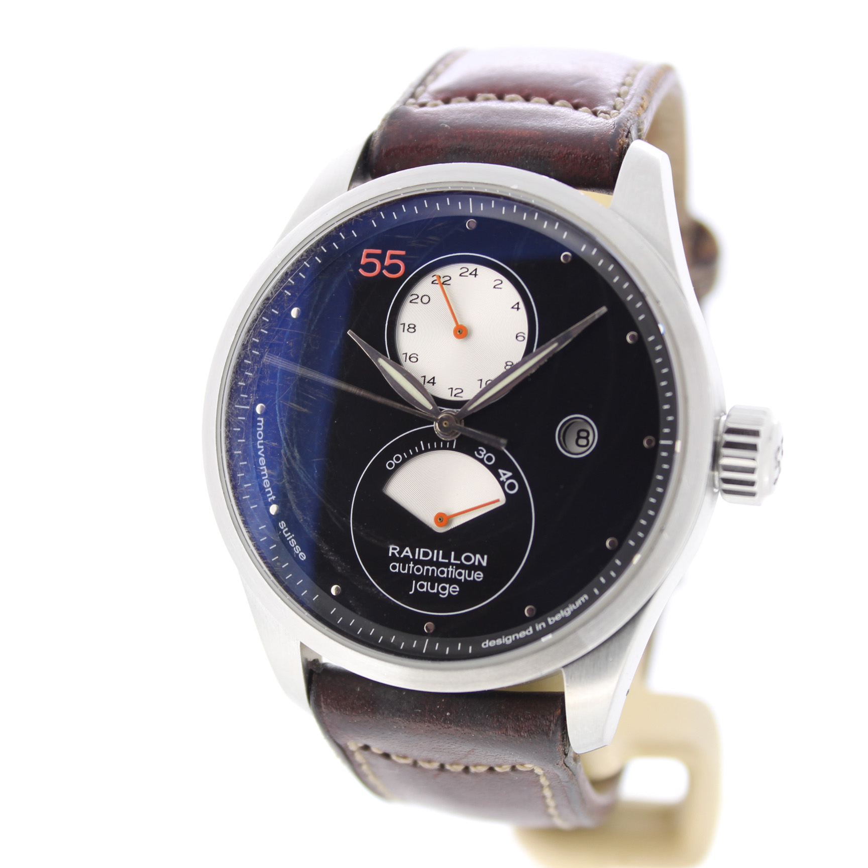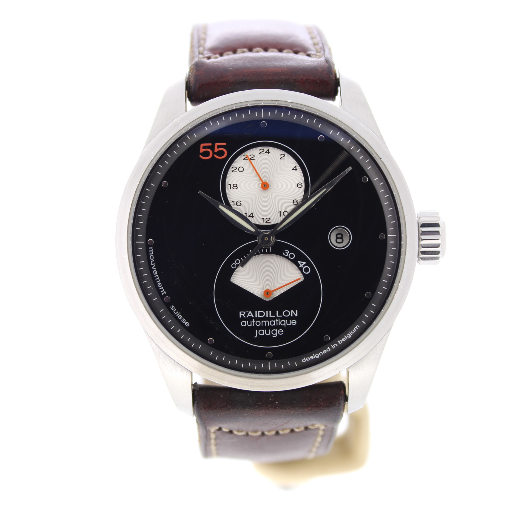 Het tweedehands Raidillon 42-JAV-100 horloge heeft een 42mm staal kast en bruin leren band. De zwarte wijzerplaat is beschermd door een saffierglas.