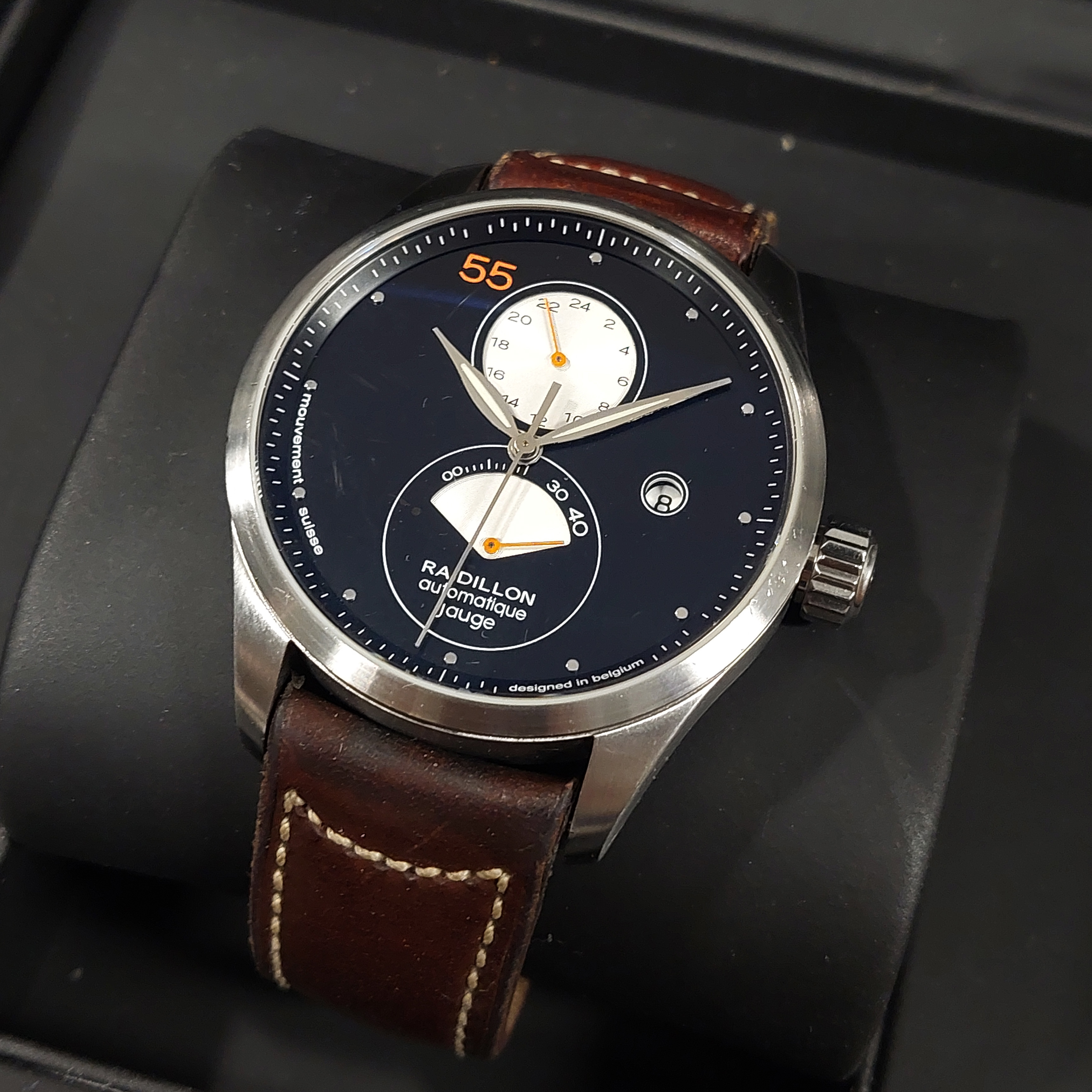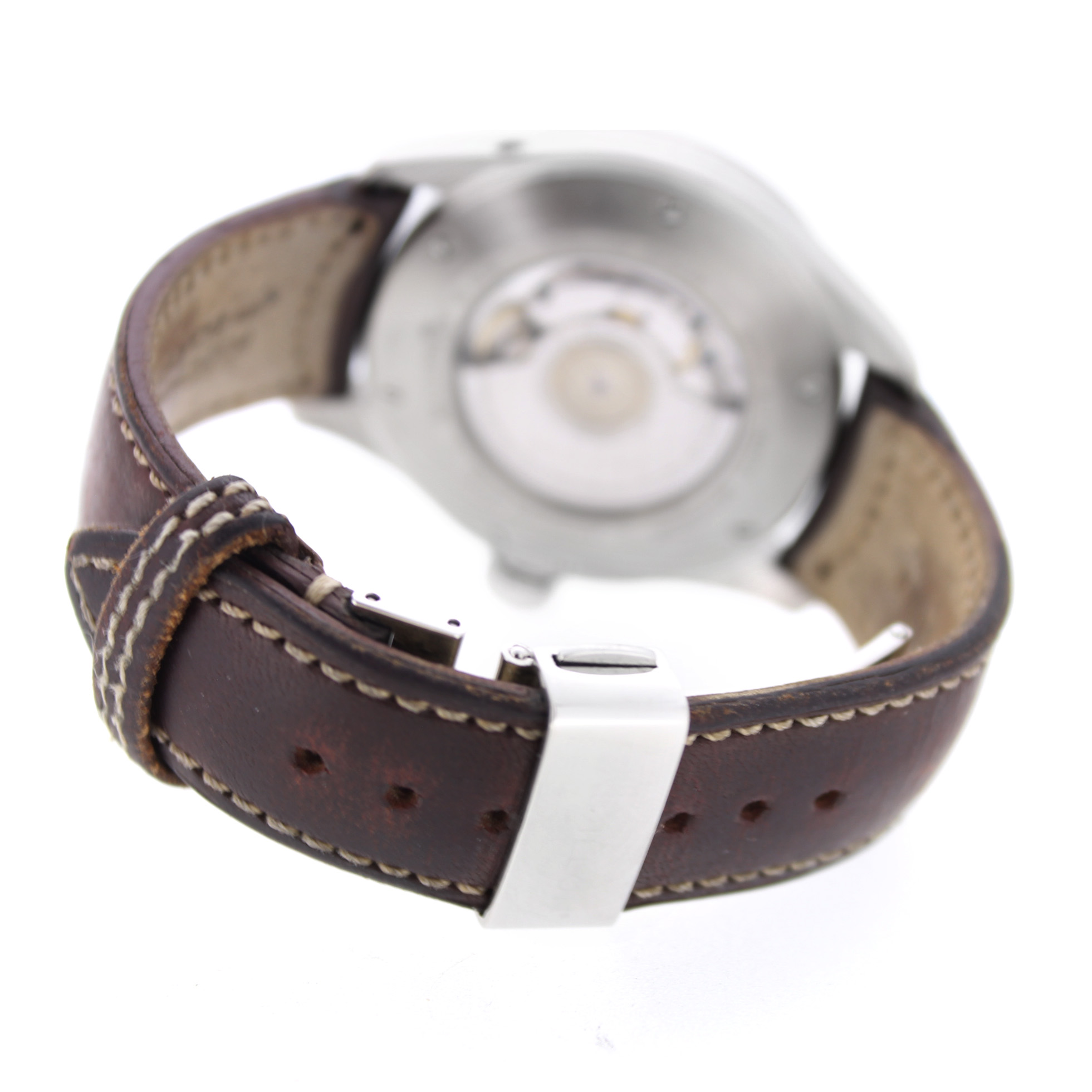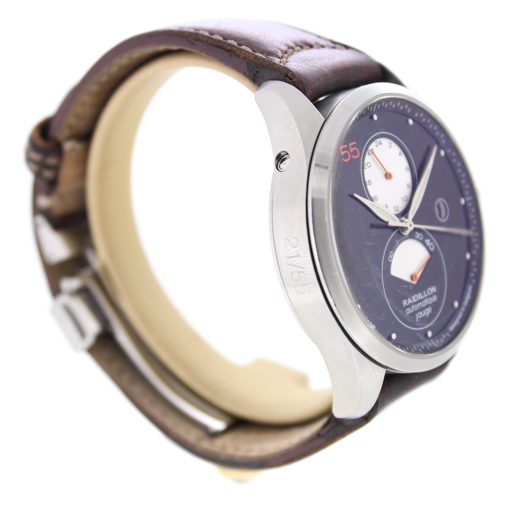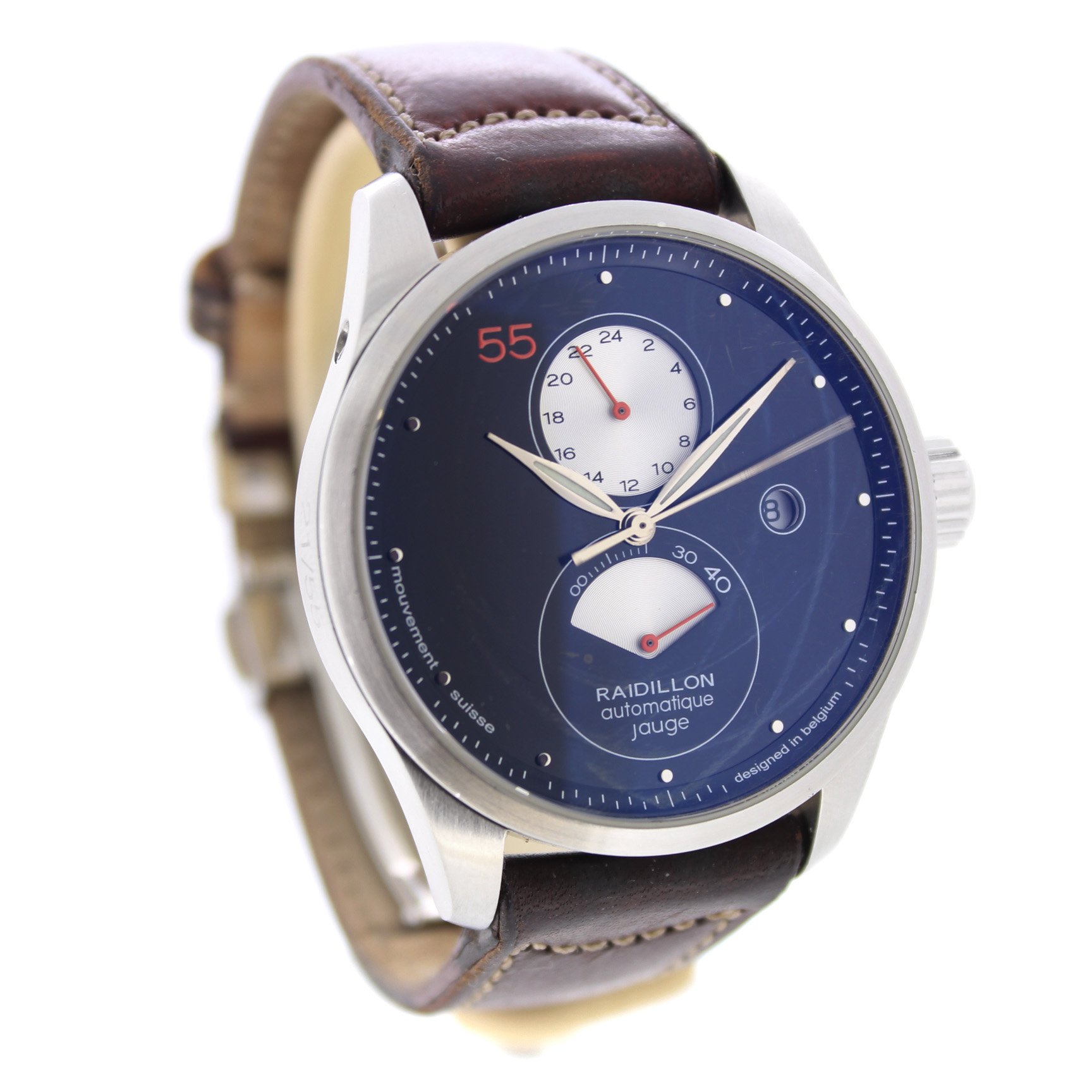 Het tweedehands Raidillon 42-JAV-100 horloge heeft een 42mm staal kast en bruin leren band. De zwarte wijzerplaat is beschermd door een saffierglas.