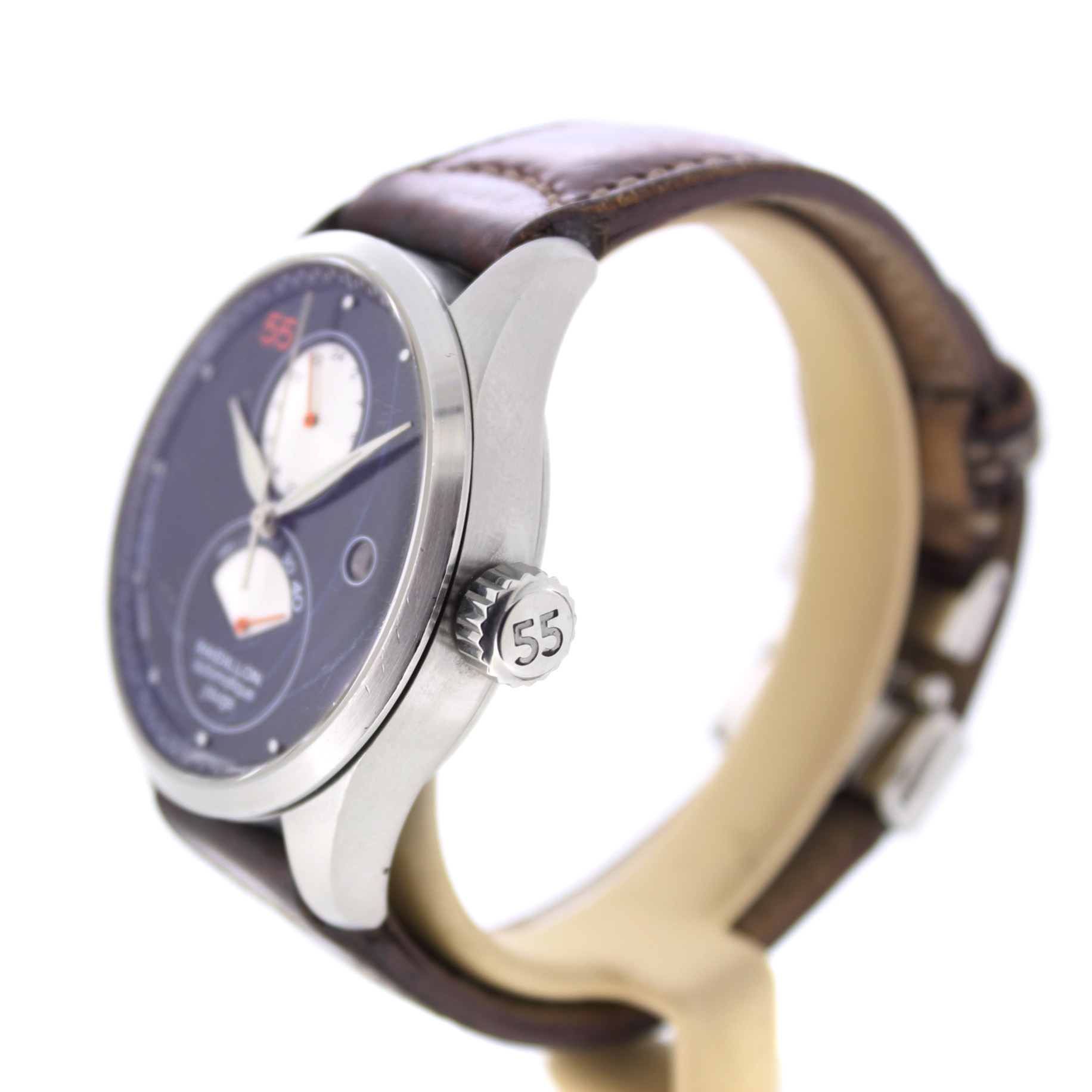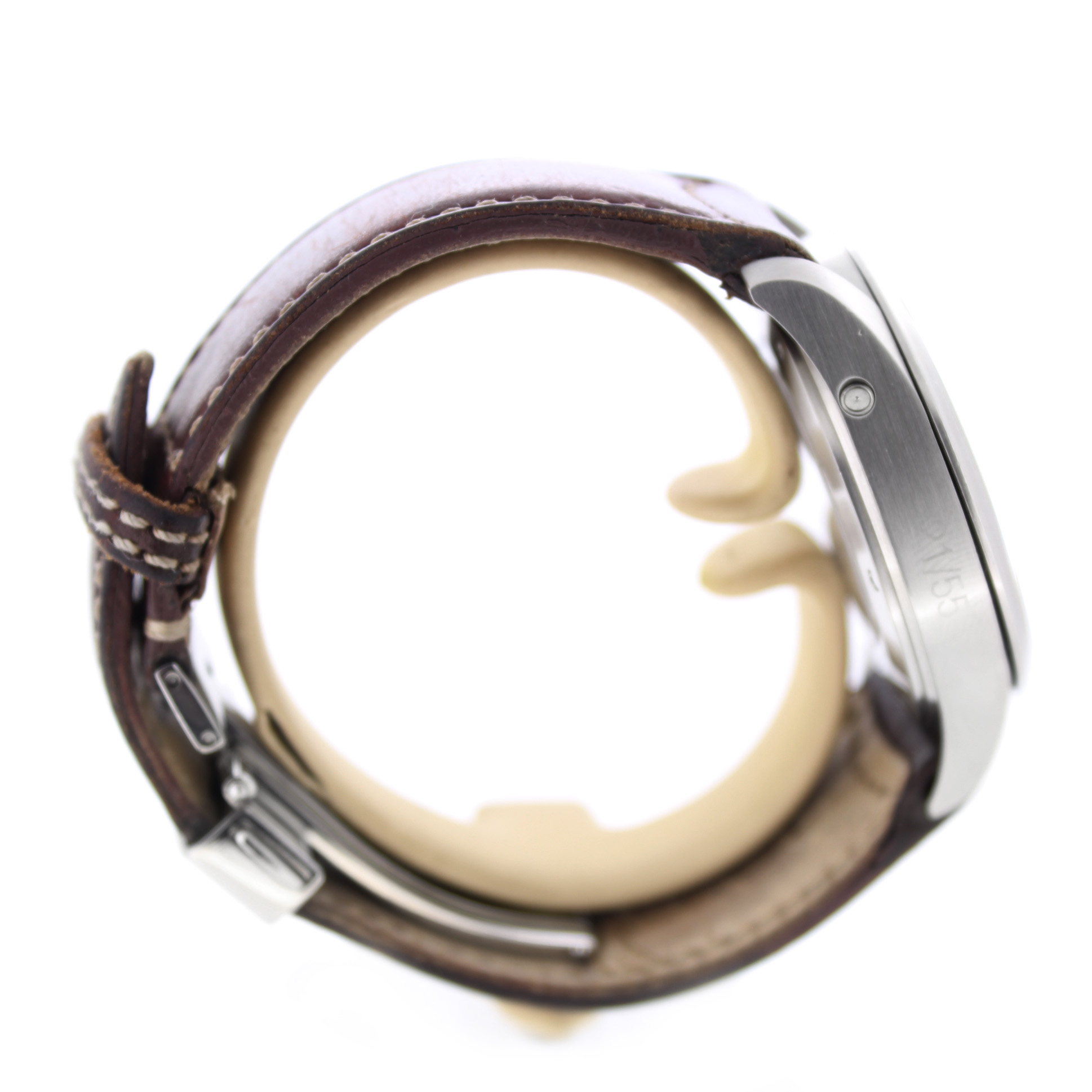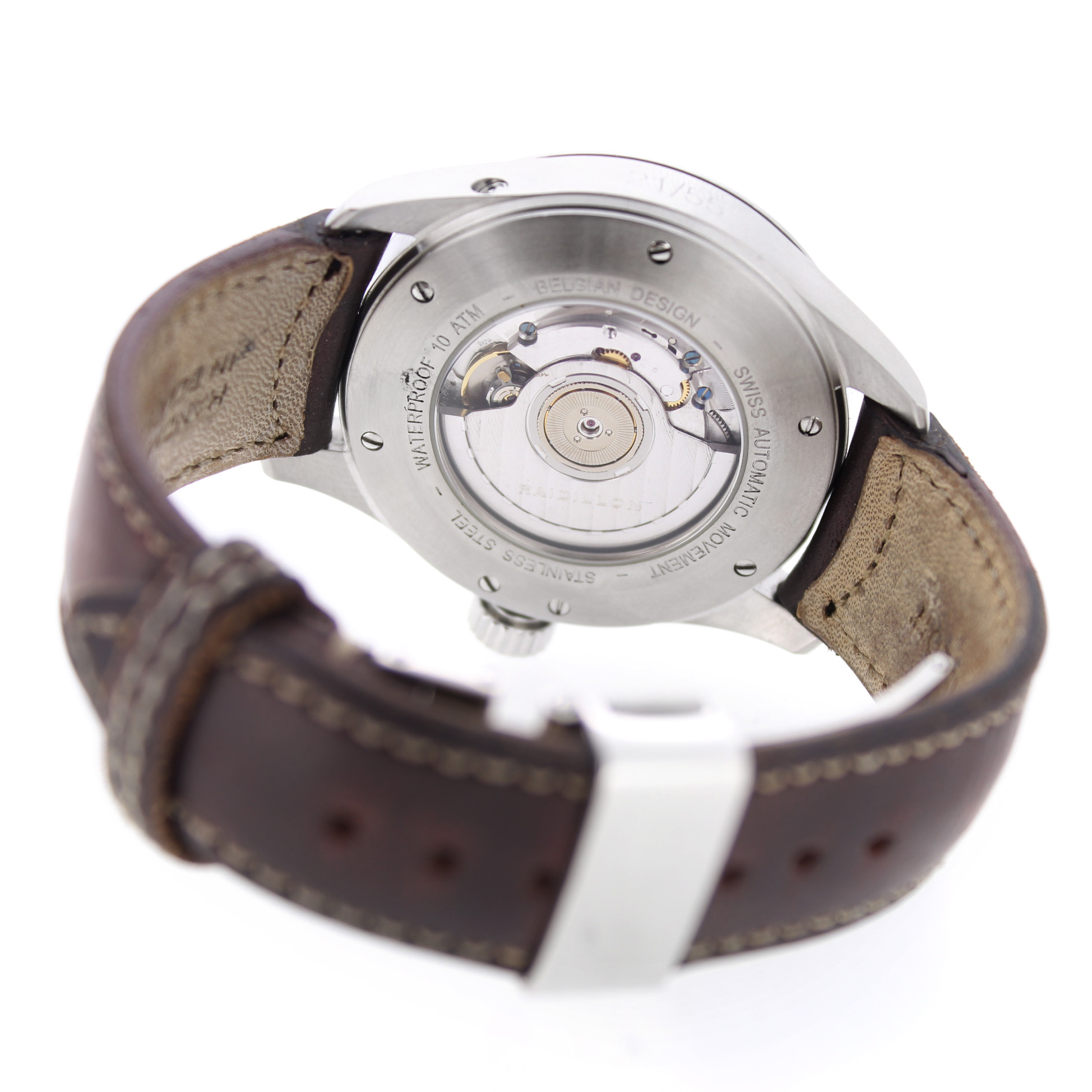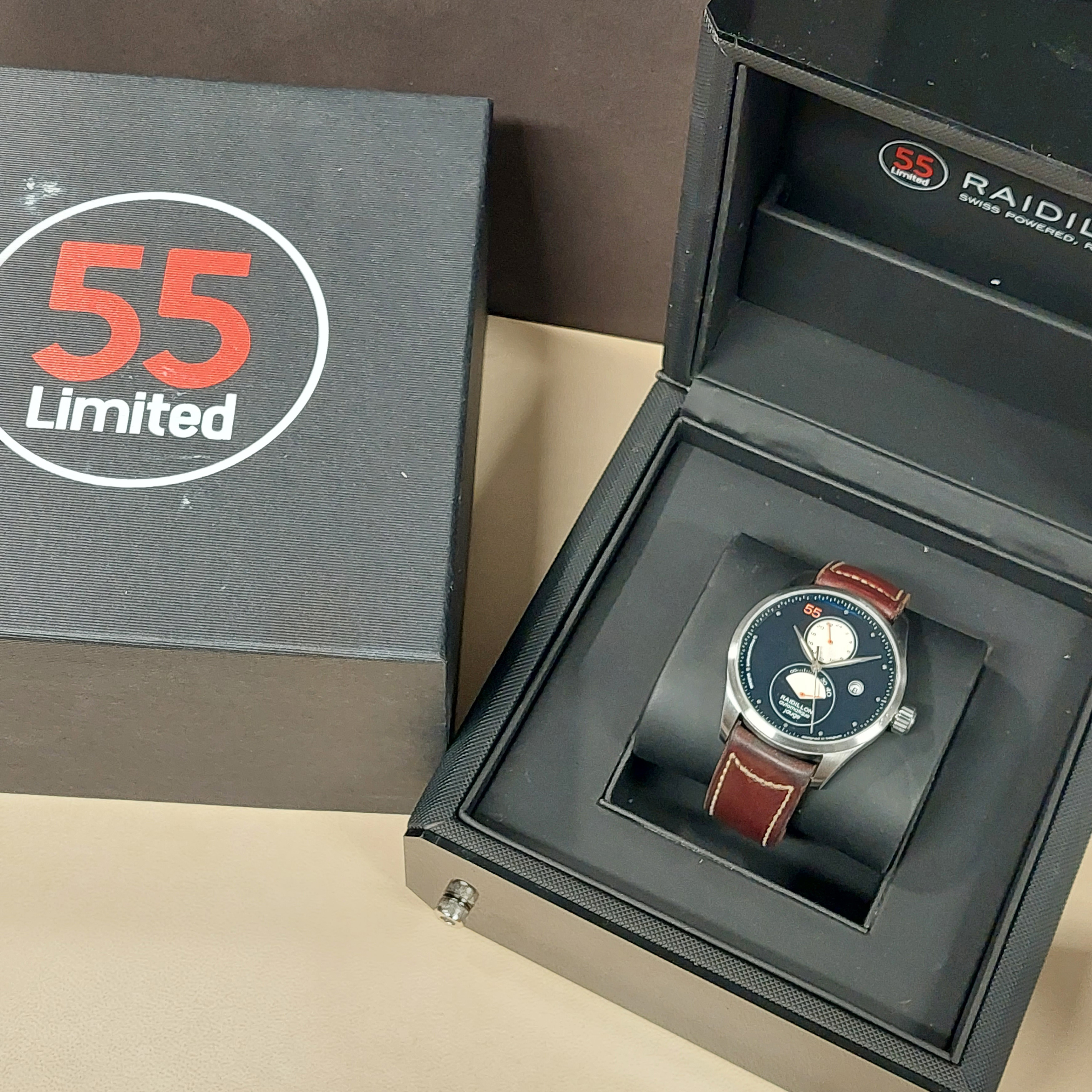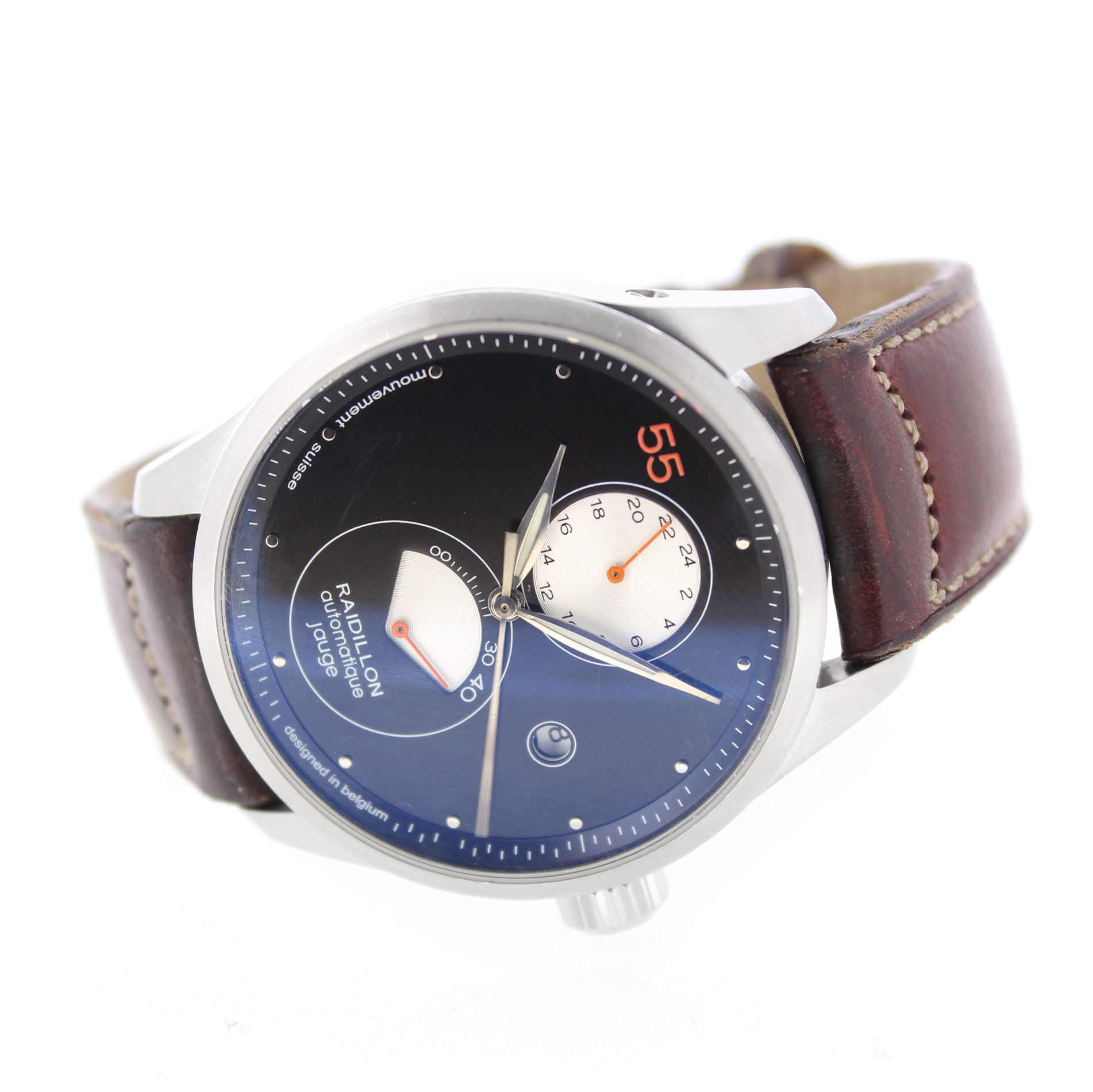 Het tweedehands Raidillon 42-JAV-100 horloge heeft een 42mm staal kast en bruin leren band. De zwarte wijzerplaat is beschermd door een saffierglas.