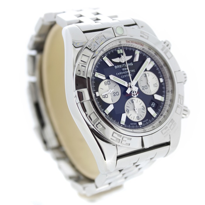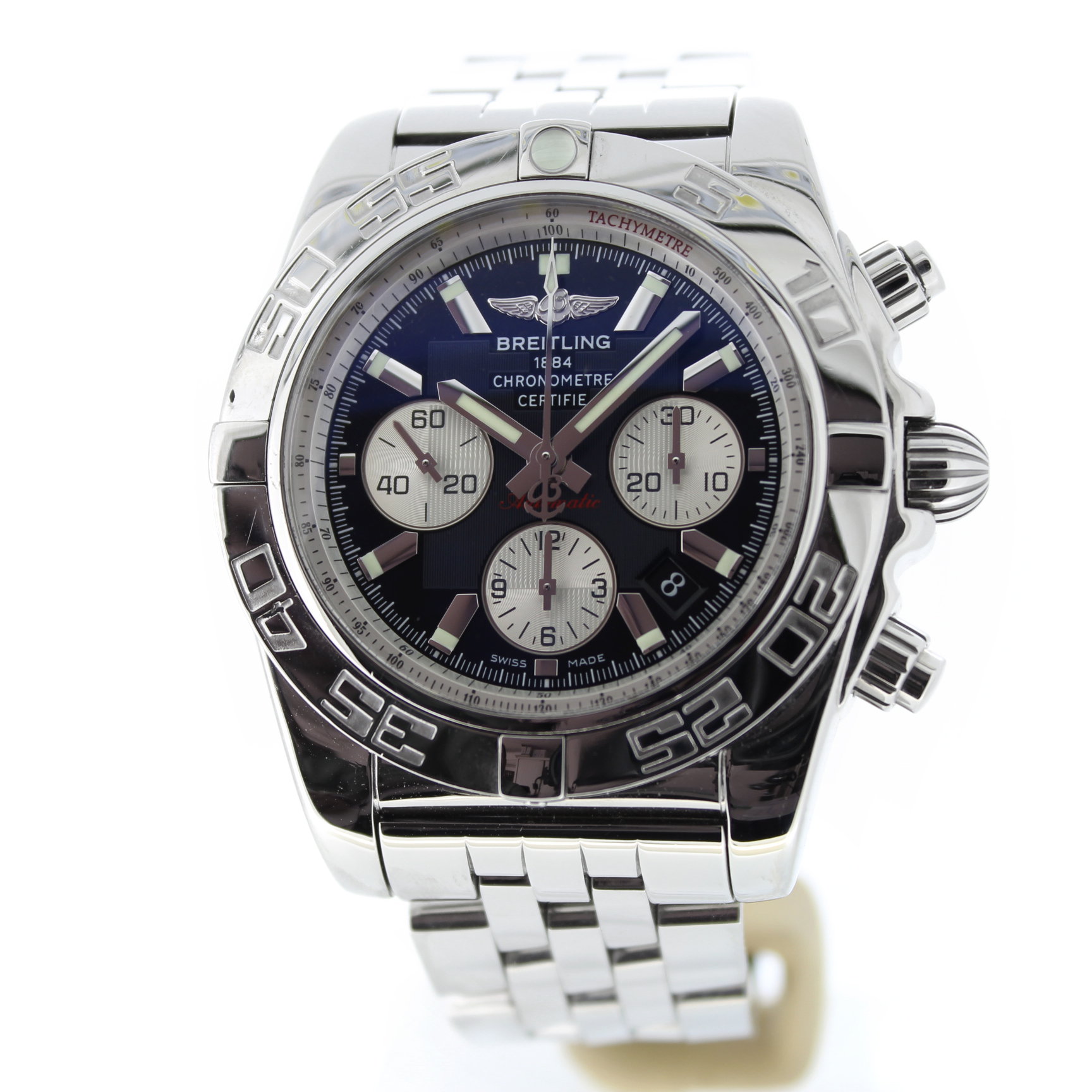 De Breitling Chronomat AB0110 is tweedehands te koop in onze zaak. Het Breitling horloge beschikt over een zwarte wijzerplaat met een chronograaf en datum aanduiding. Het horloge heeft een staal kast en band.