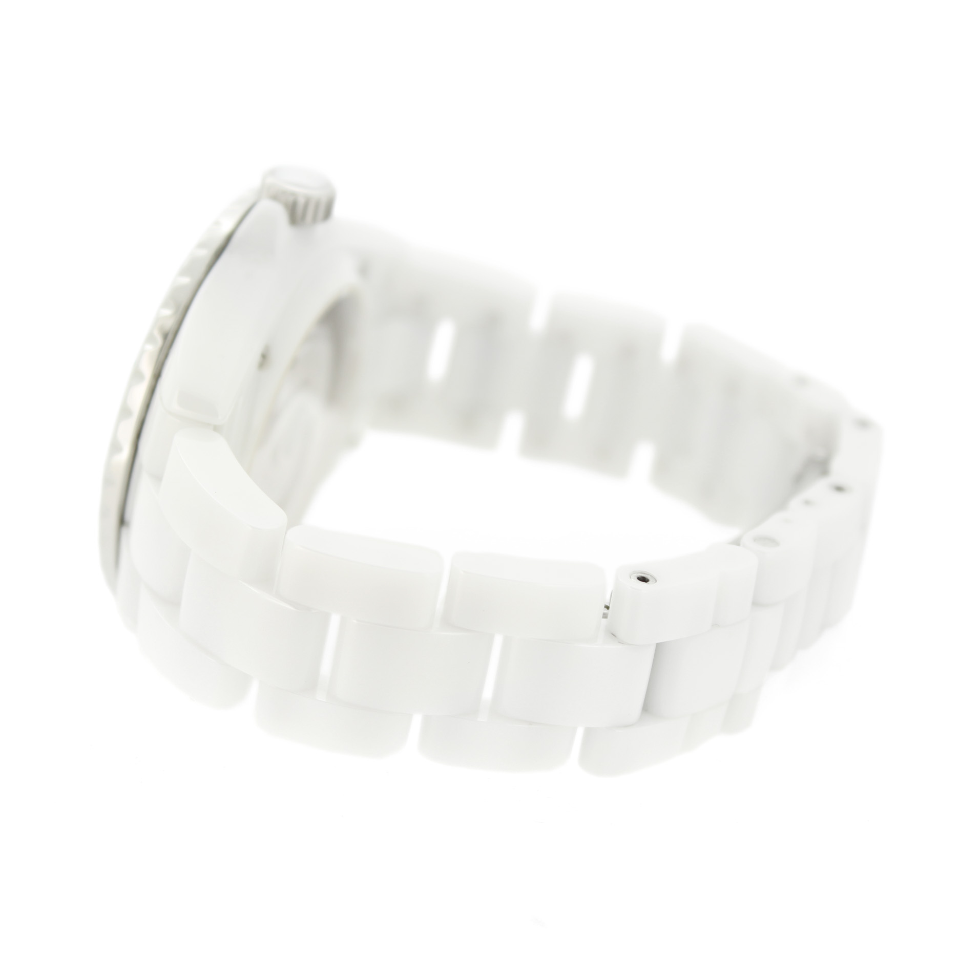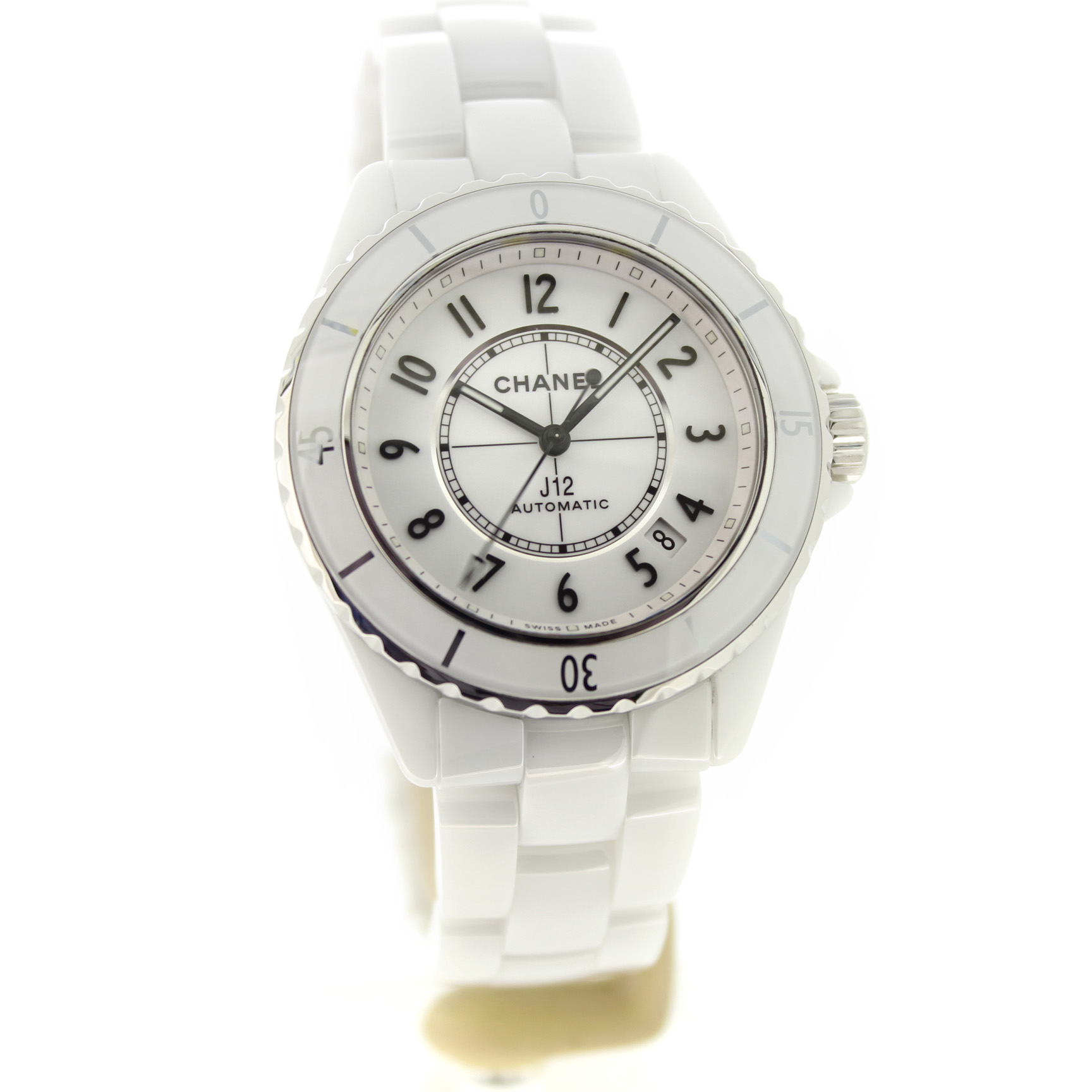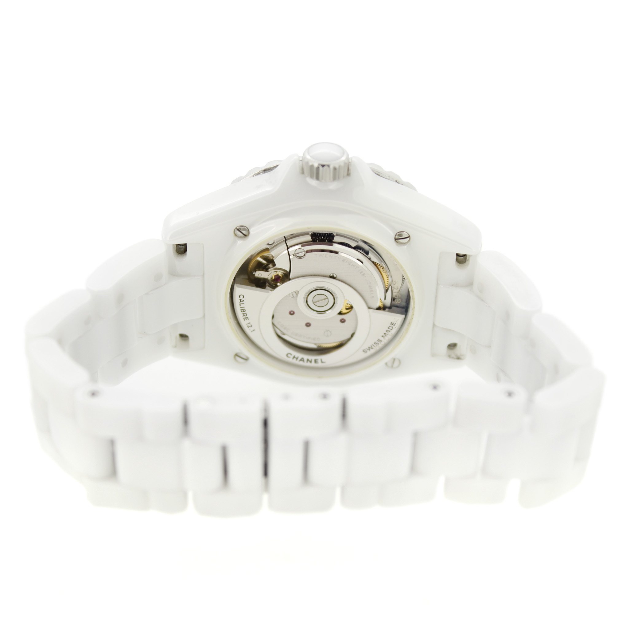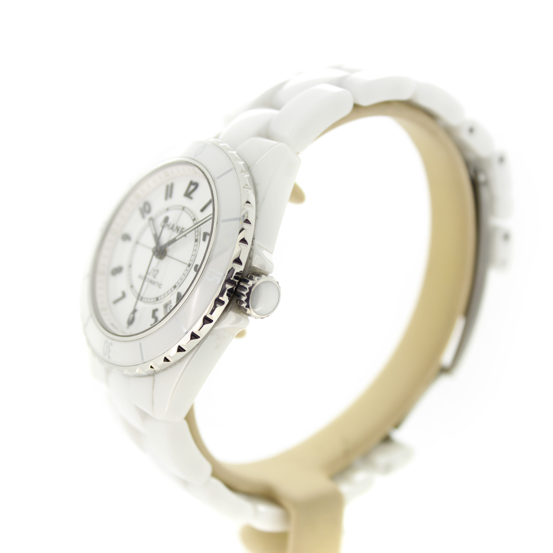 Het tweedehands Chanel Automatic J12 horloge heeft een 38mm keramiek kast en band. De witte wijzerplaat is beschermd door een saffierglas. Het horloge heeft een automatisch gangwerk, Cal 12.1.