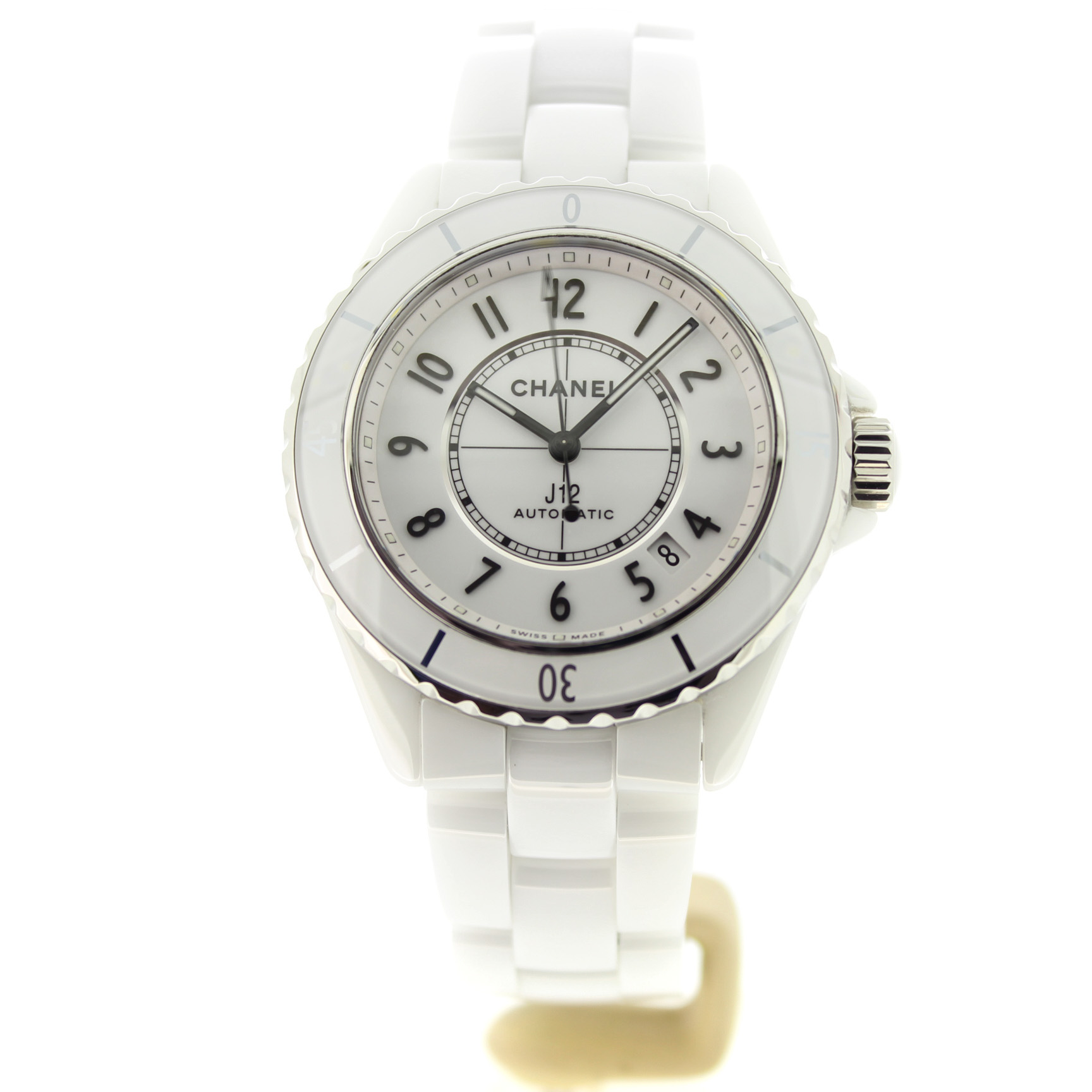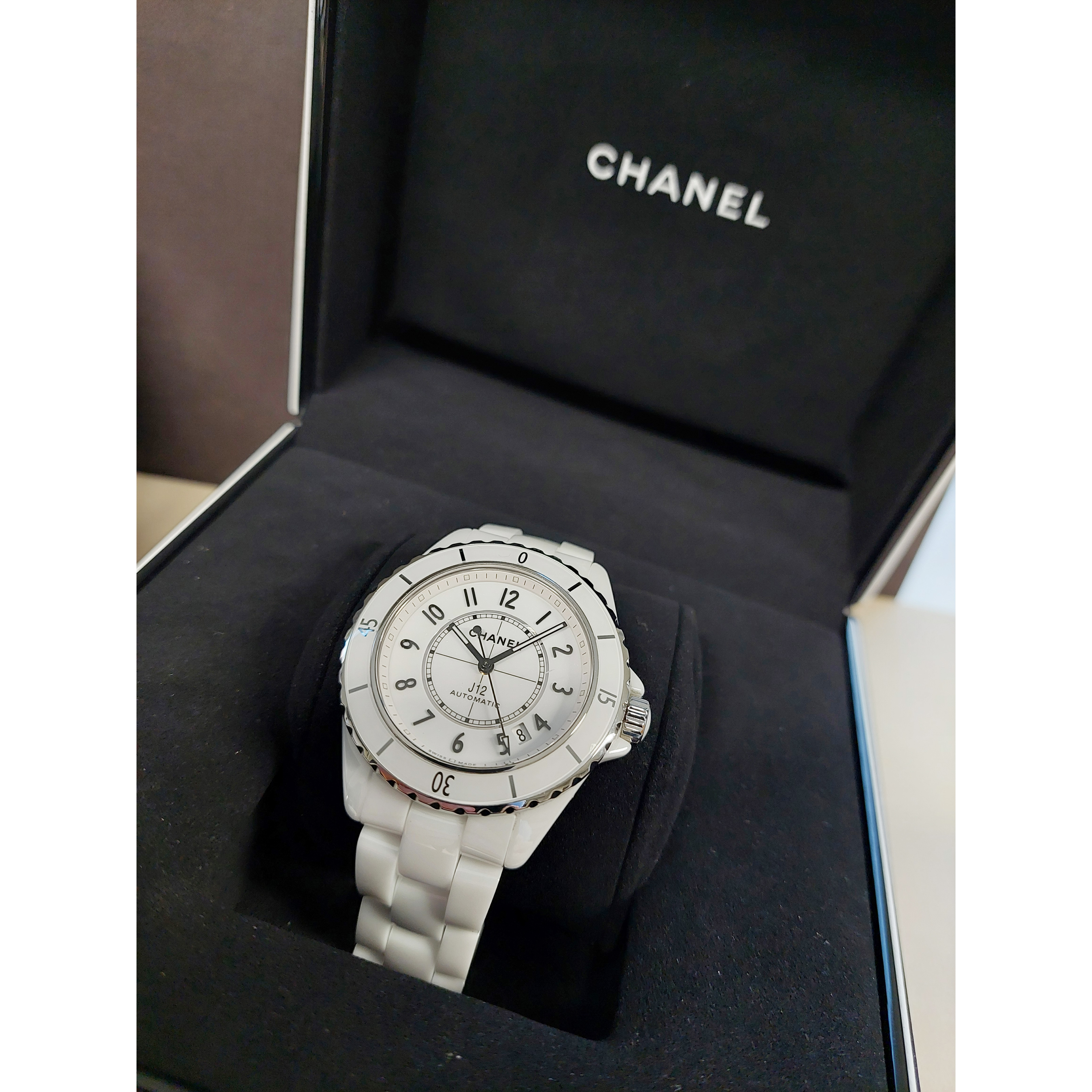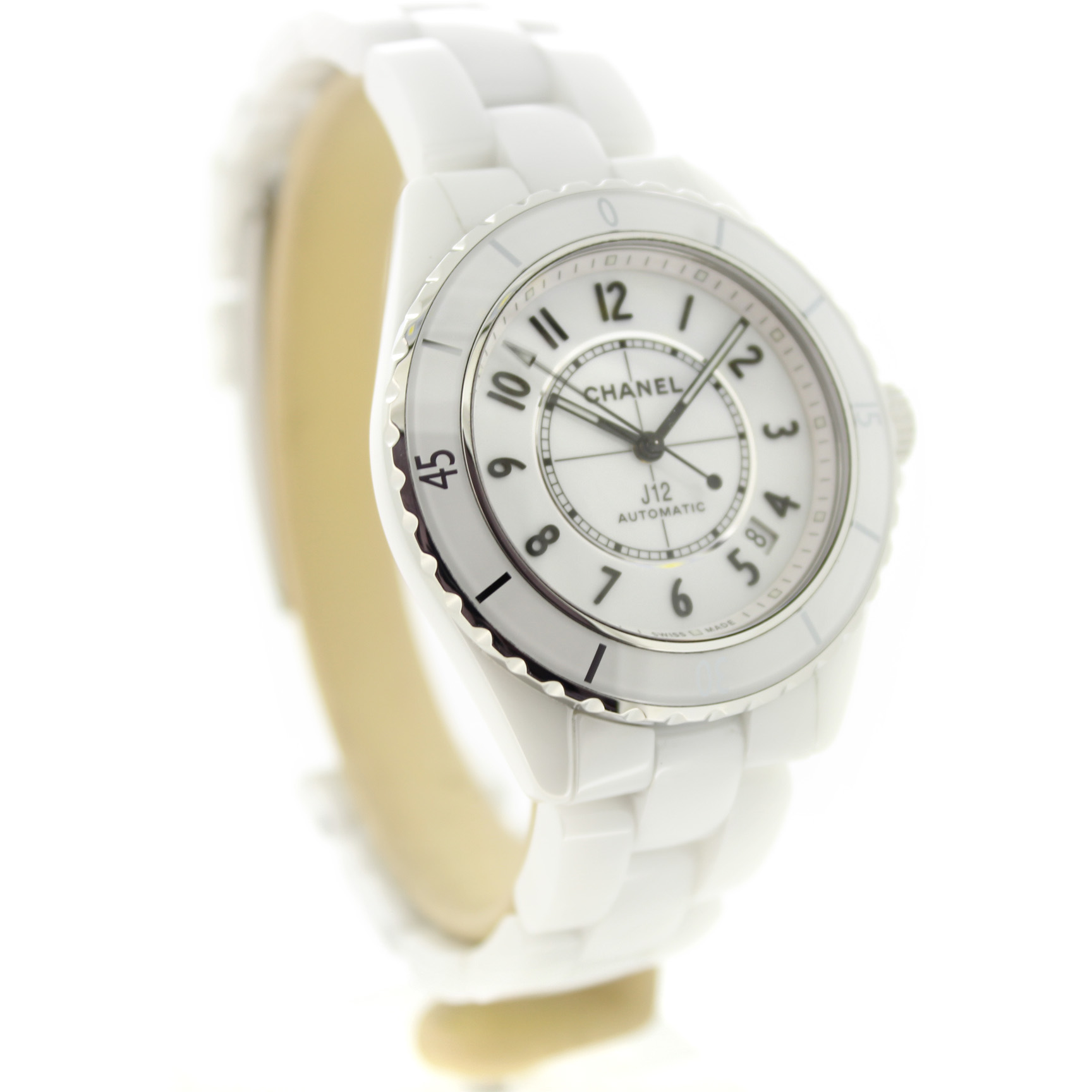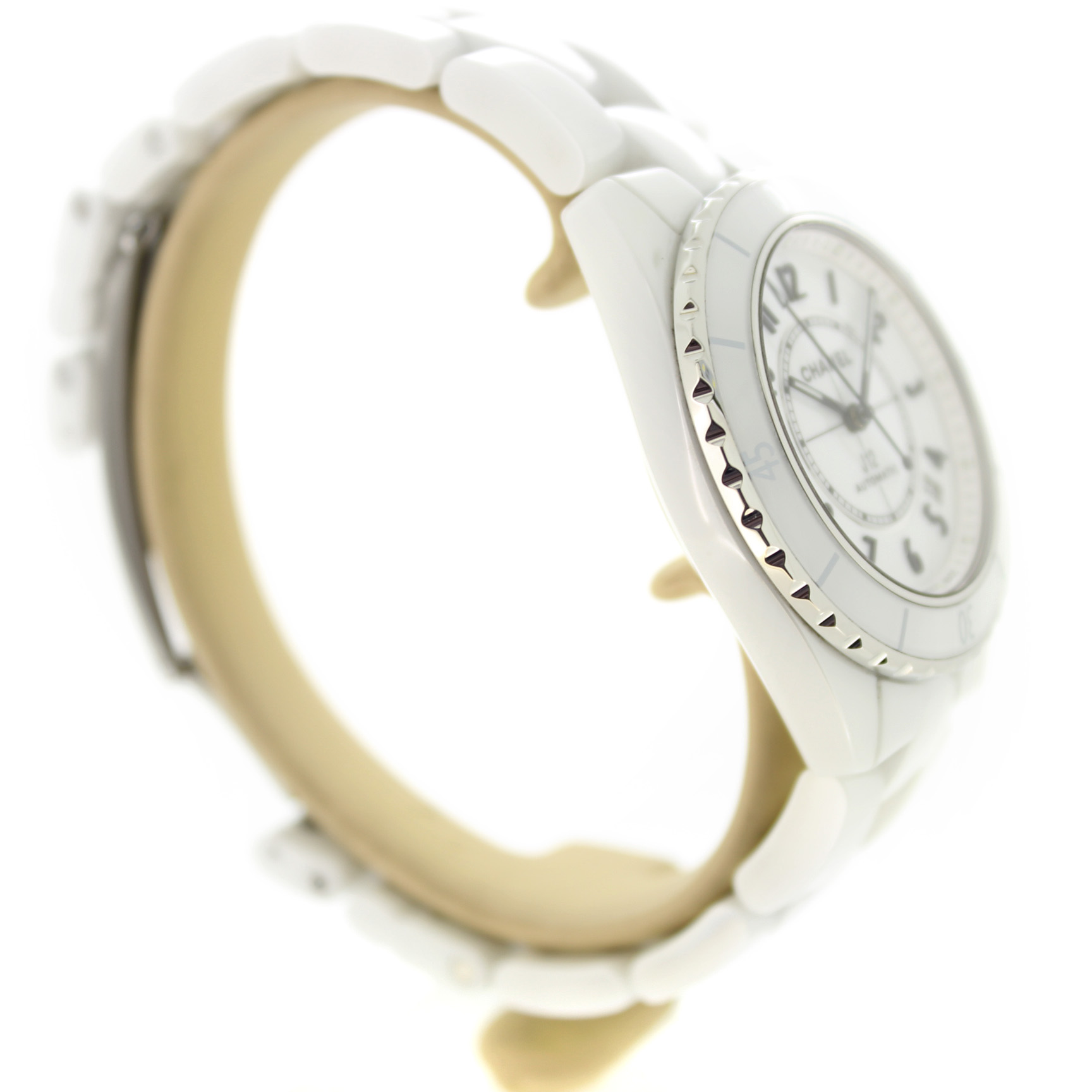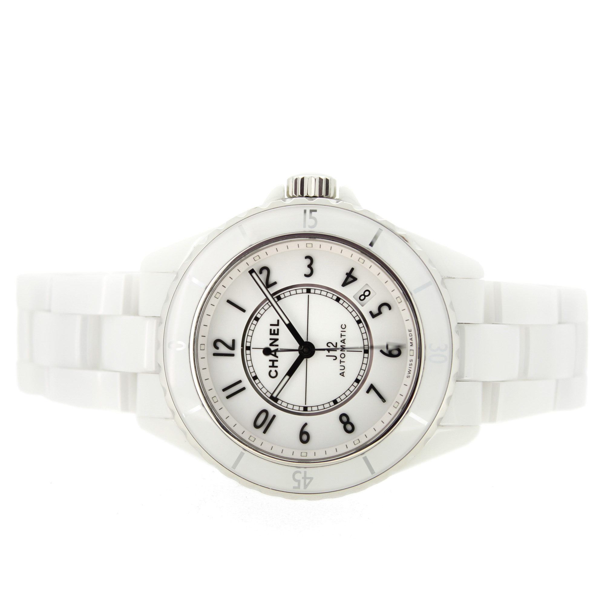 Het tweedehands Chanel Automatic J12 horloge heeft een 38mm keramiek kast en band. De witte wijzerplaat is beschermd door een saffierglas. Het horloge heeft een automatisch gangwerk, Cal 12.1.