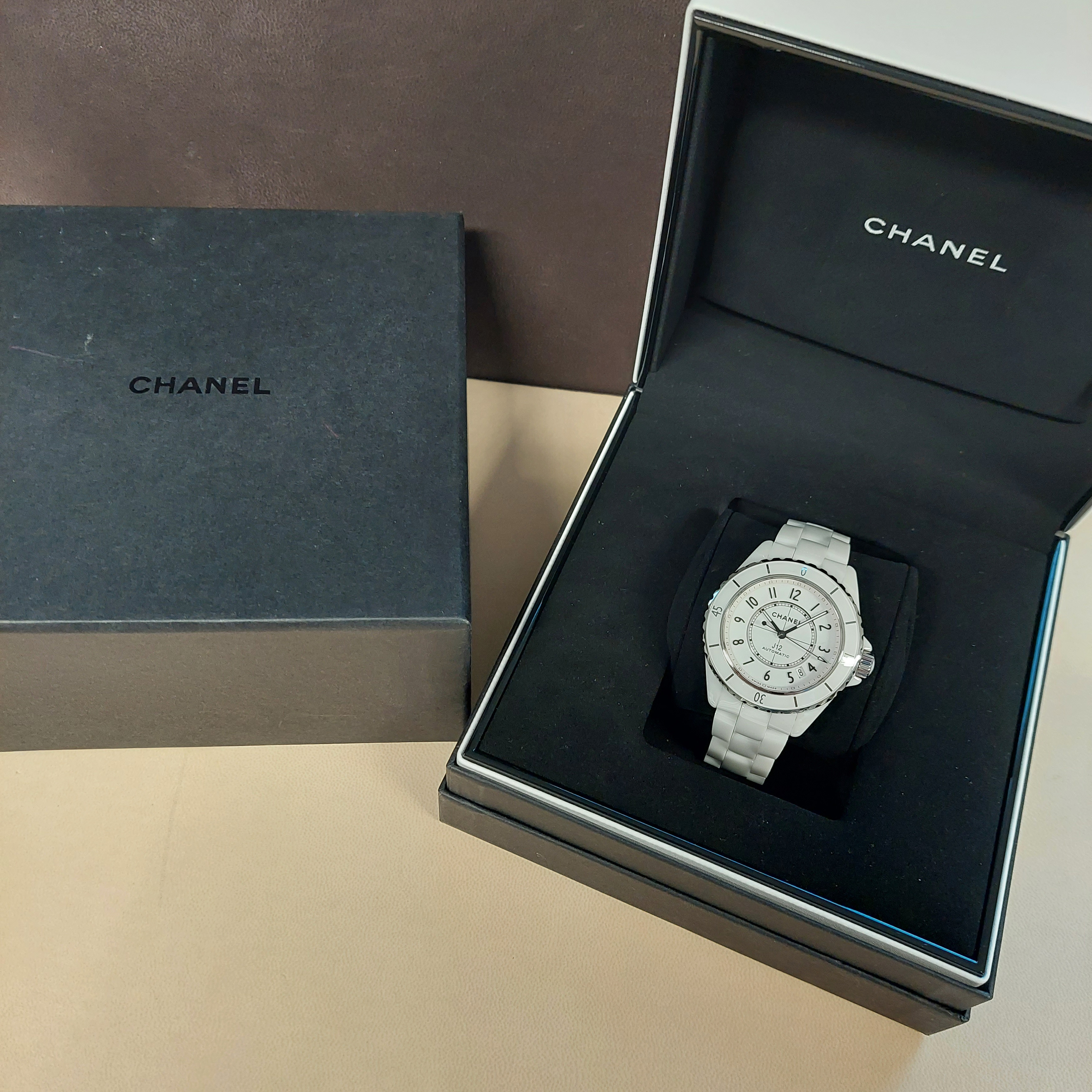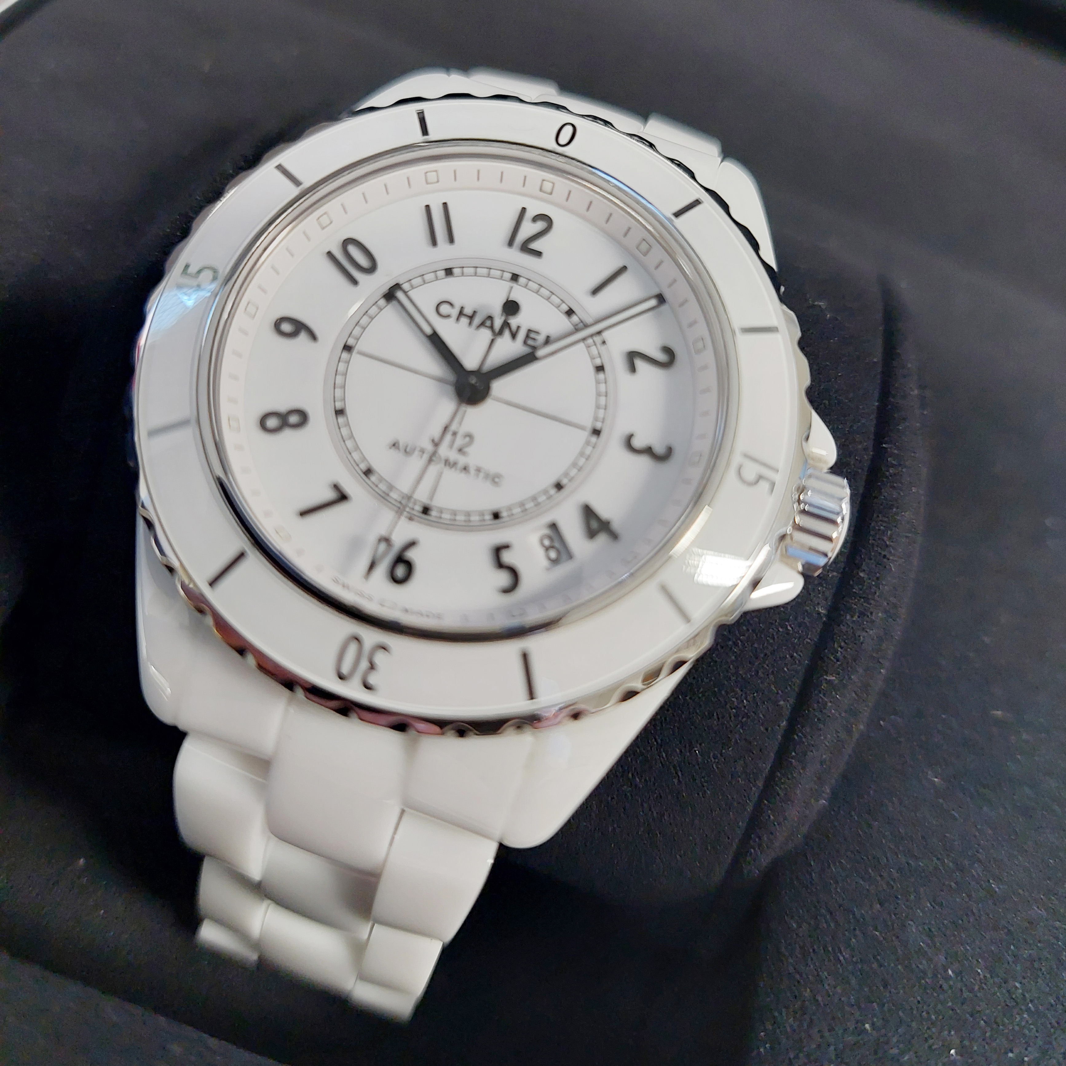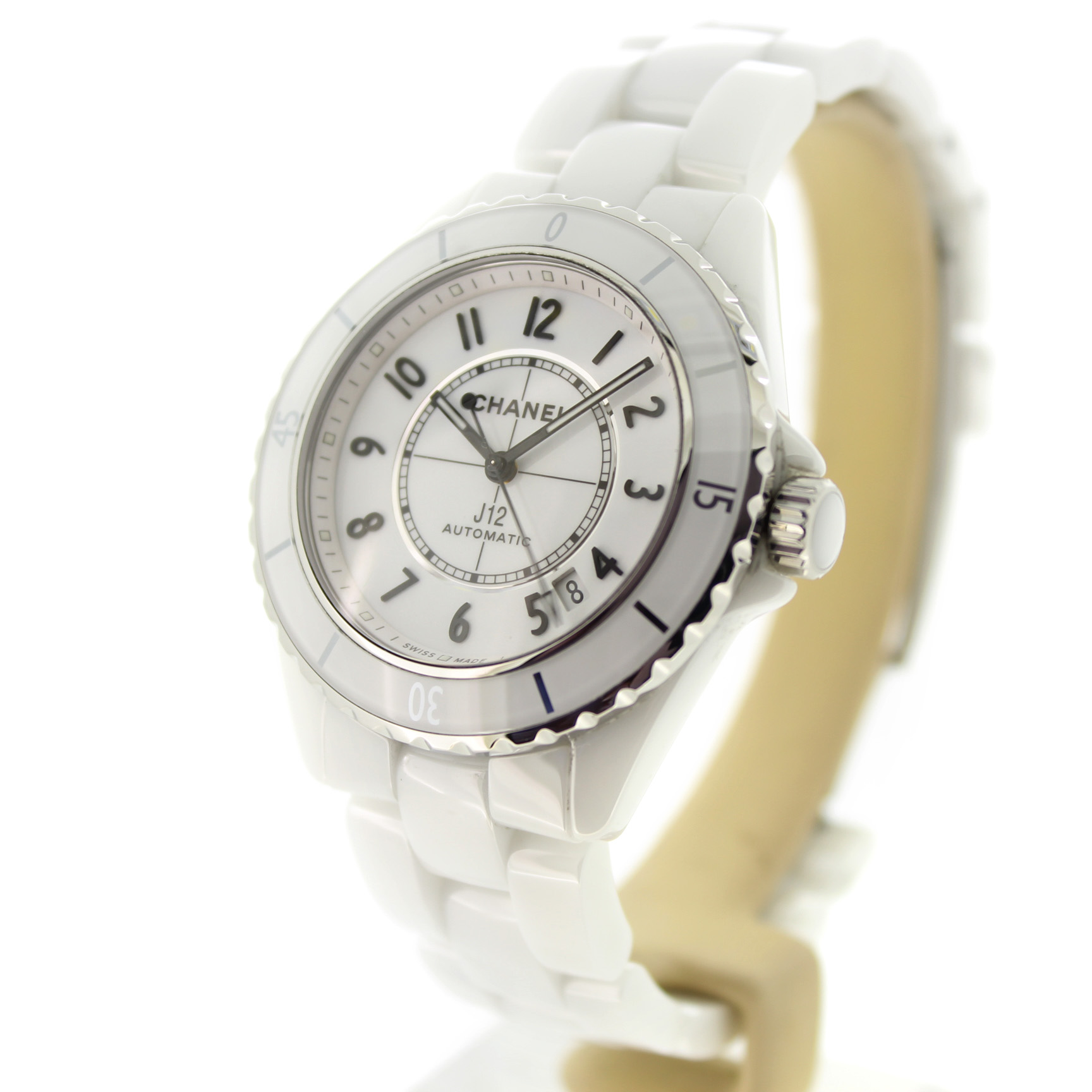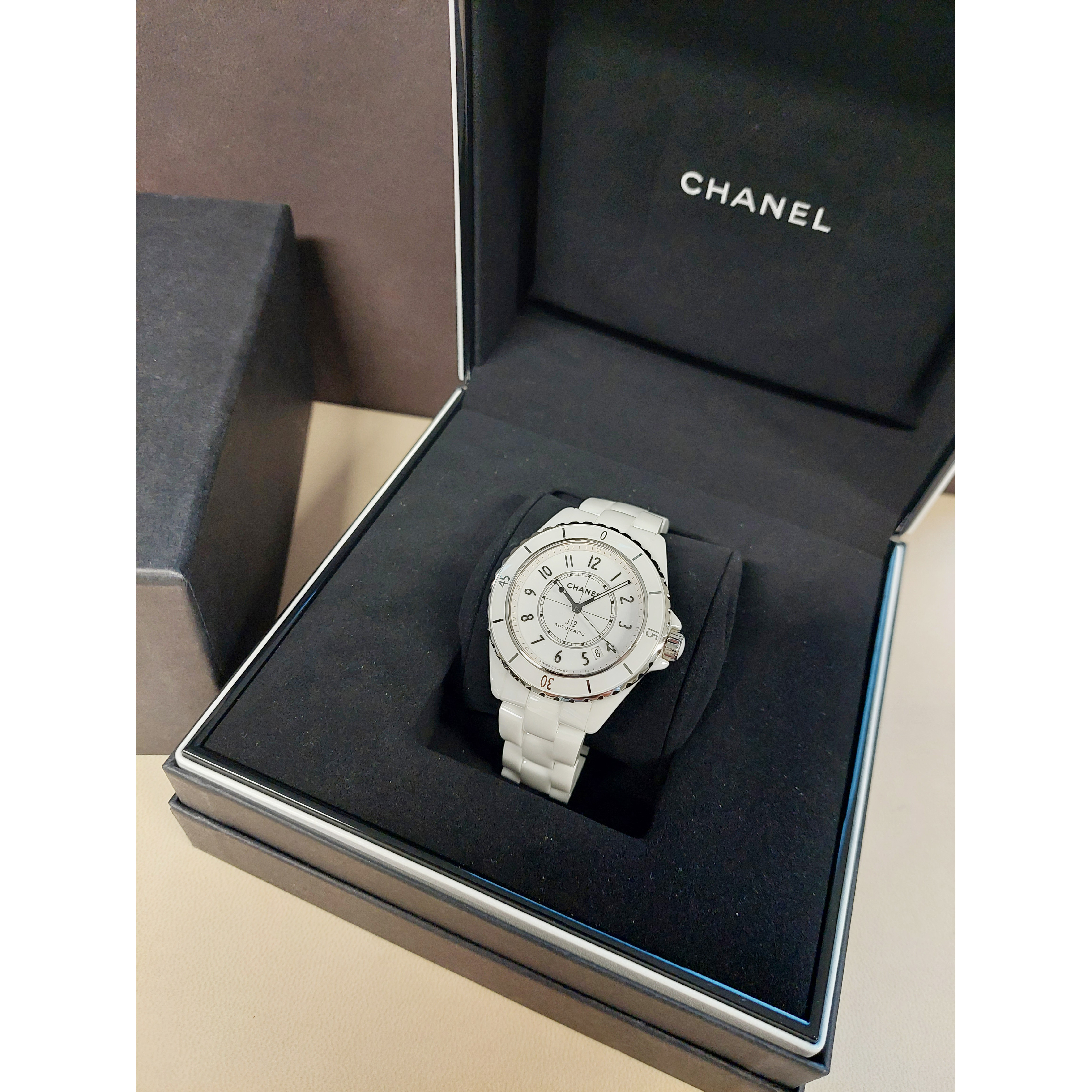 Het tweedehands Chanel Automatic J12 horloge heeft een 38mm keramiek kast en band. De witte wijzerplaat is beschermd door een saffierglas. Het horloge heeft een automatisch gangwerk, Cal 12.1.