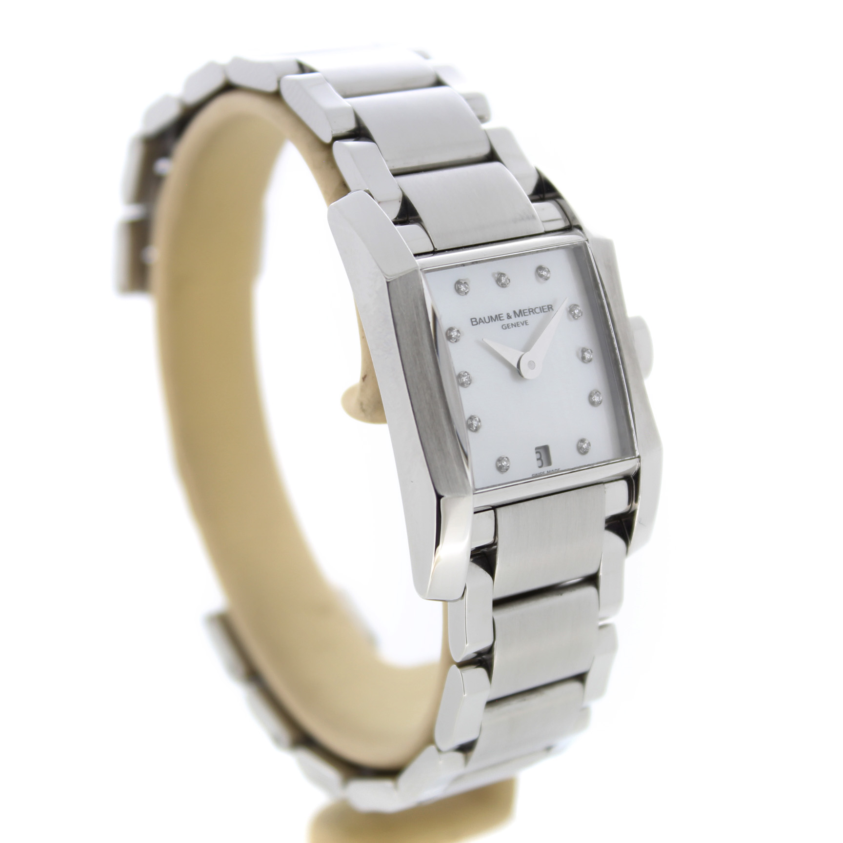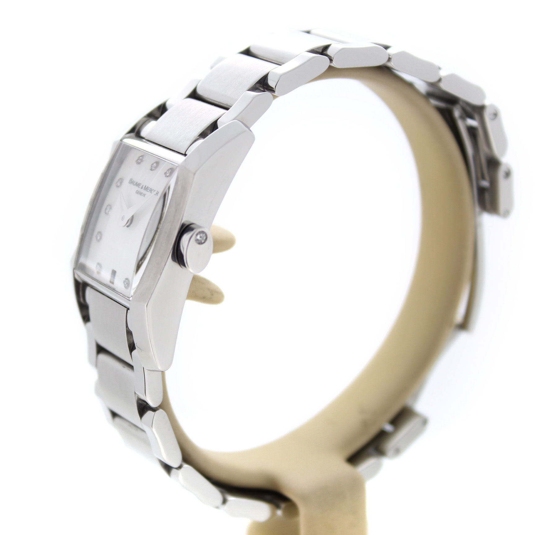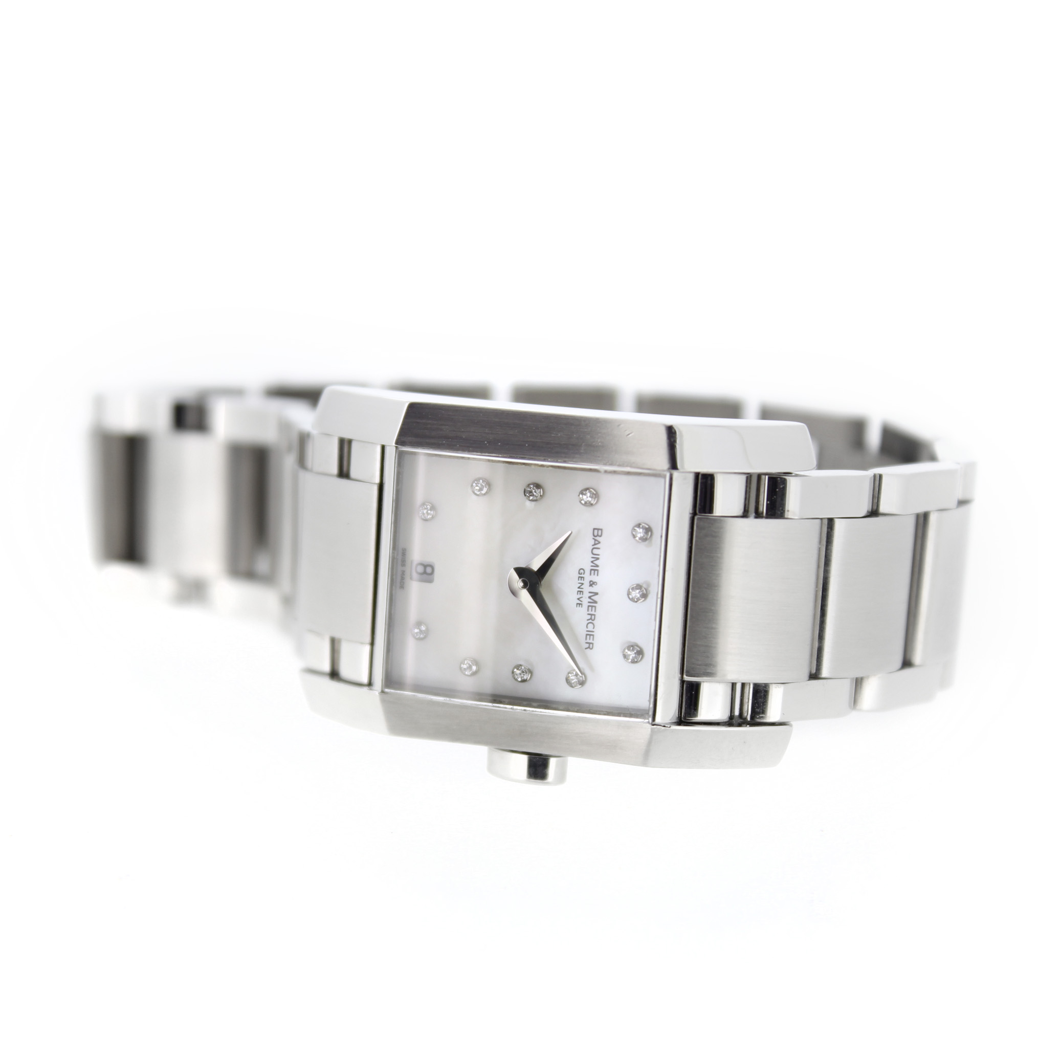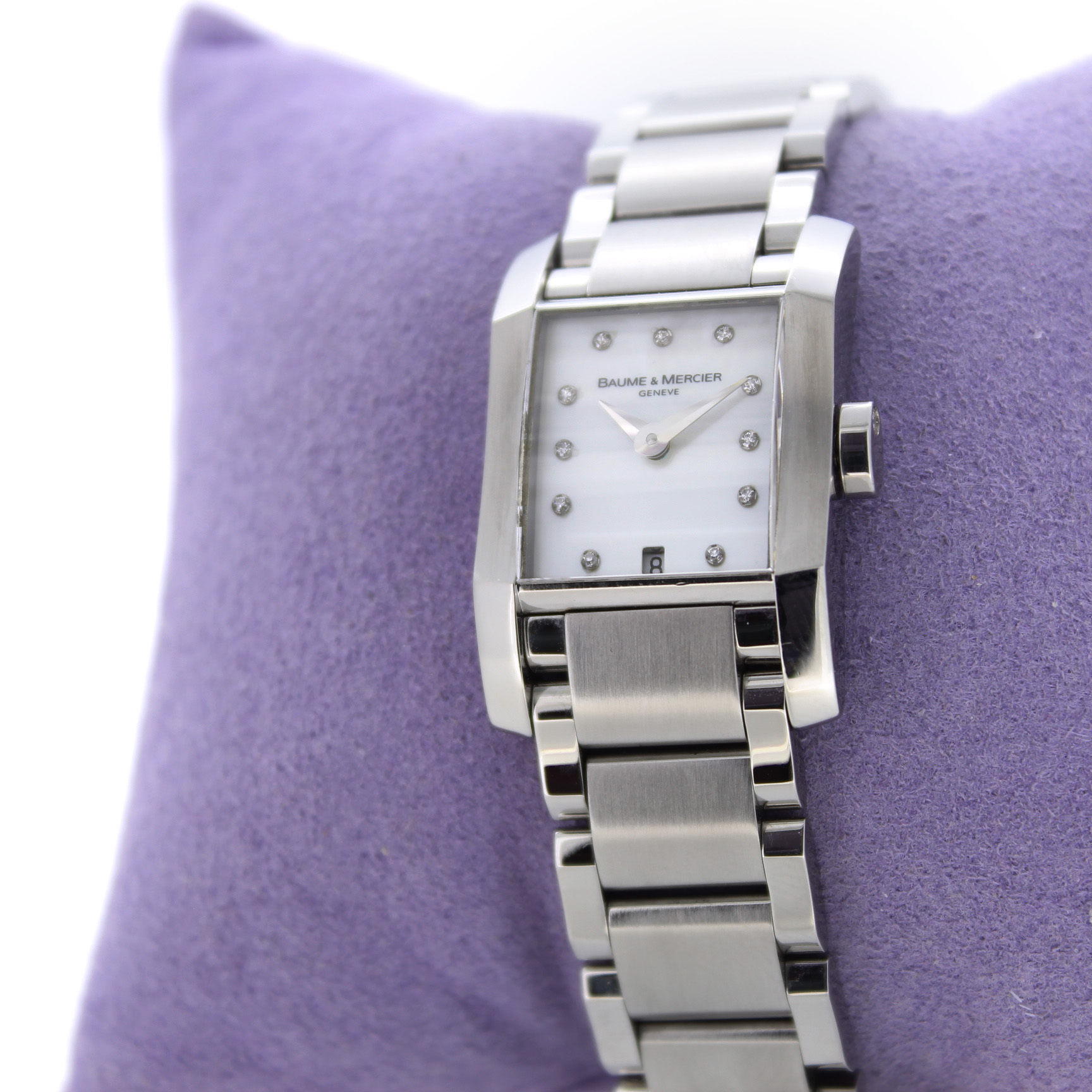 Het tweedehands Baume & Mercier Hampton M0A08573 horloge is een quartz en heeft een zilverkleurige staal kast en band. De wijzerplaat heeft een parelmoer kleur met diamanten op de indexen en wordt beschermd met een saffier glas.