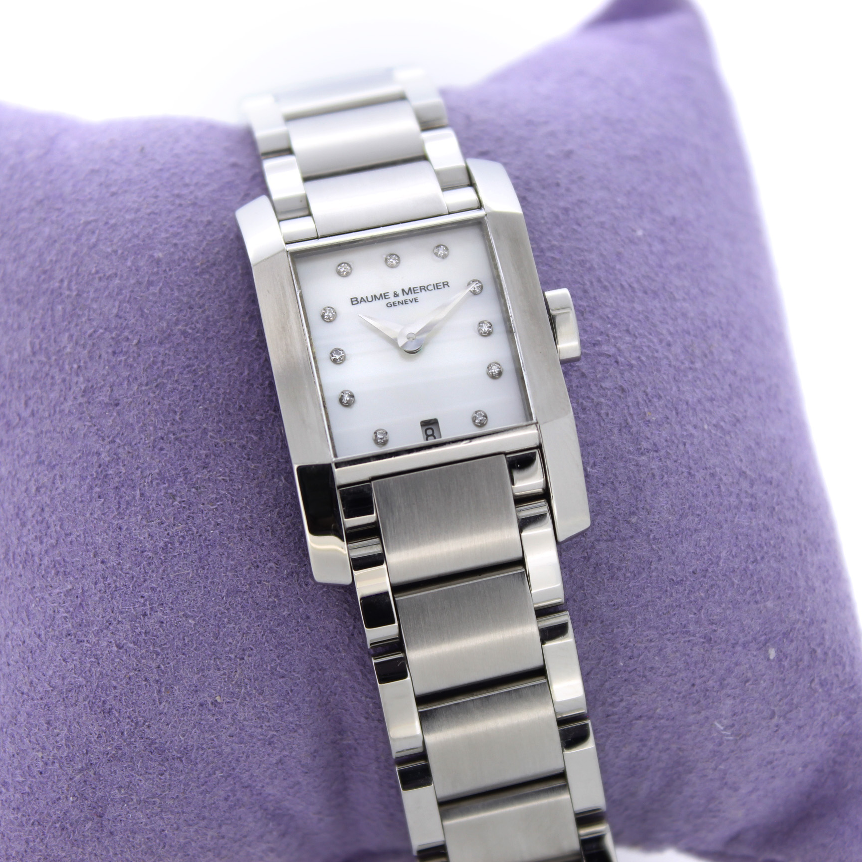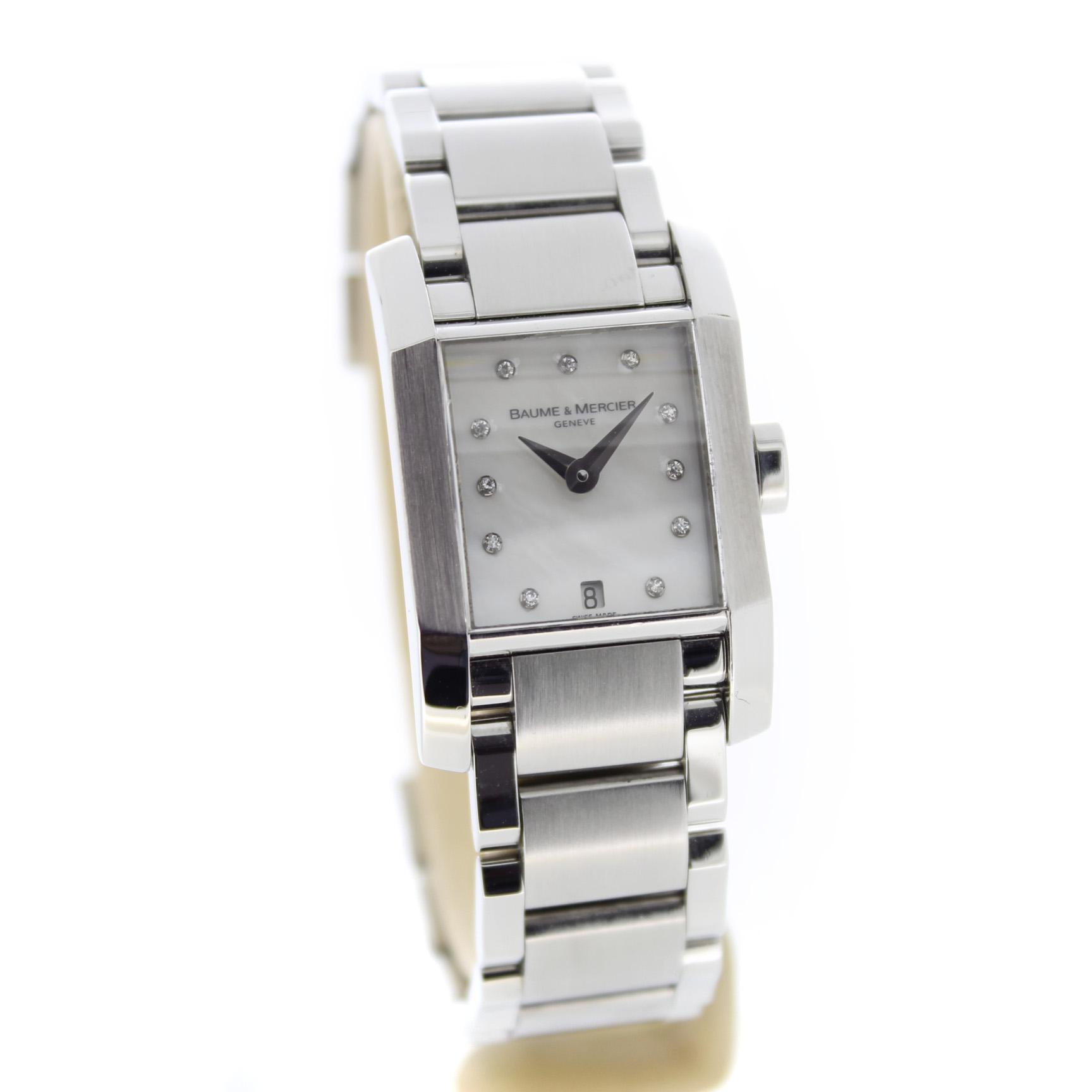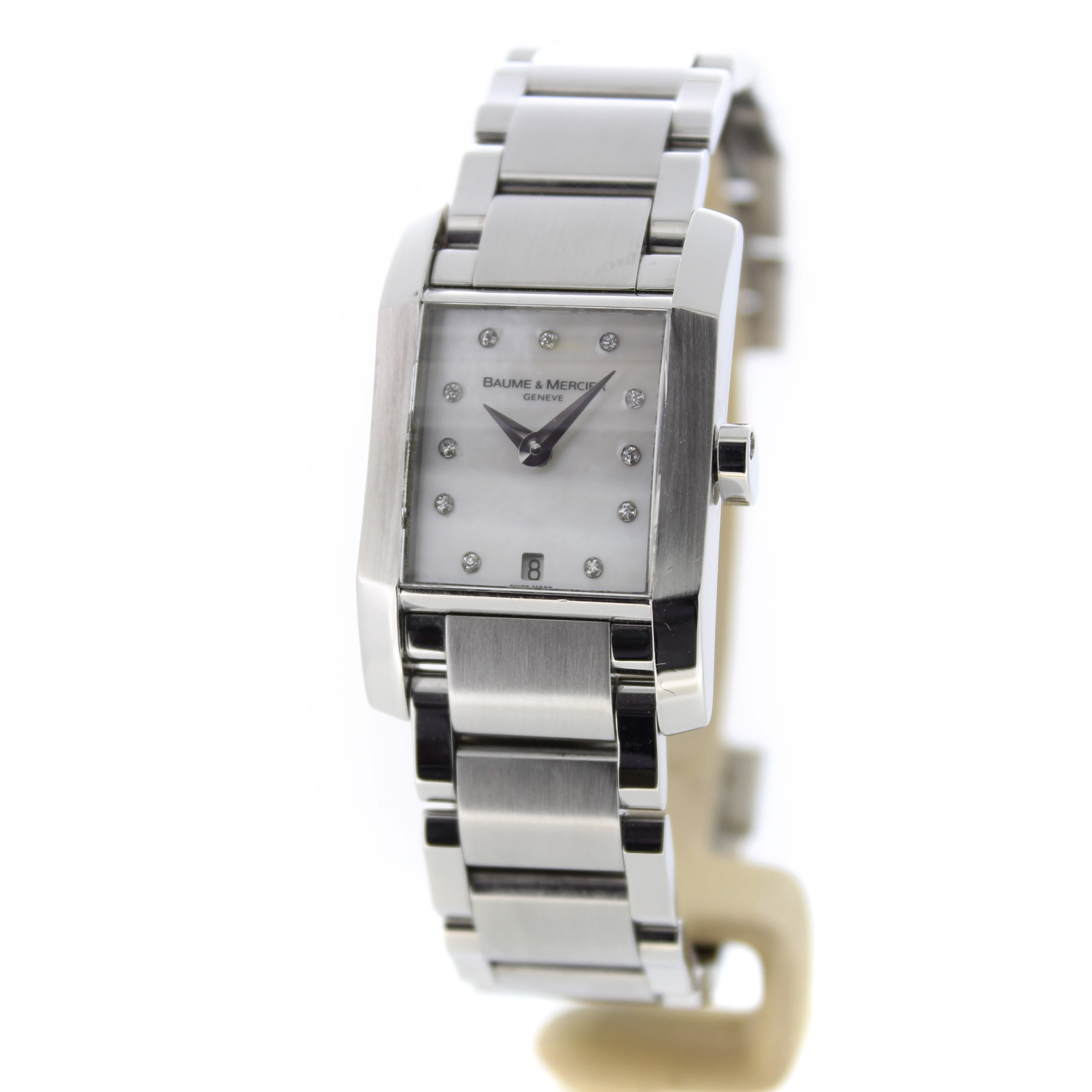Het tweedehands Baume & Mercier Hampton M0A08573 horloge is een quartz en heeft een zilverkleurige staal kast en band. De wijzerplaat heeft een parelmoer kleur met diamanten op de indexen en wordt beschermd met een saffier glas.