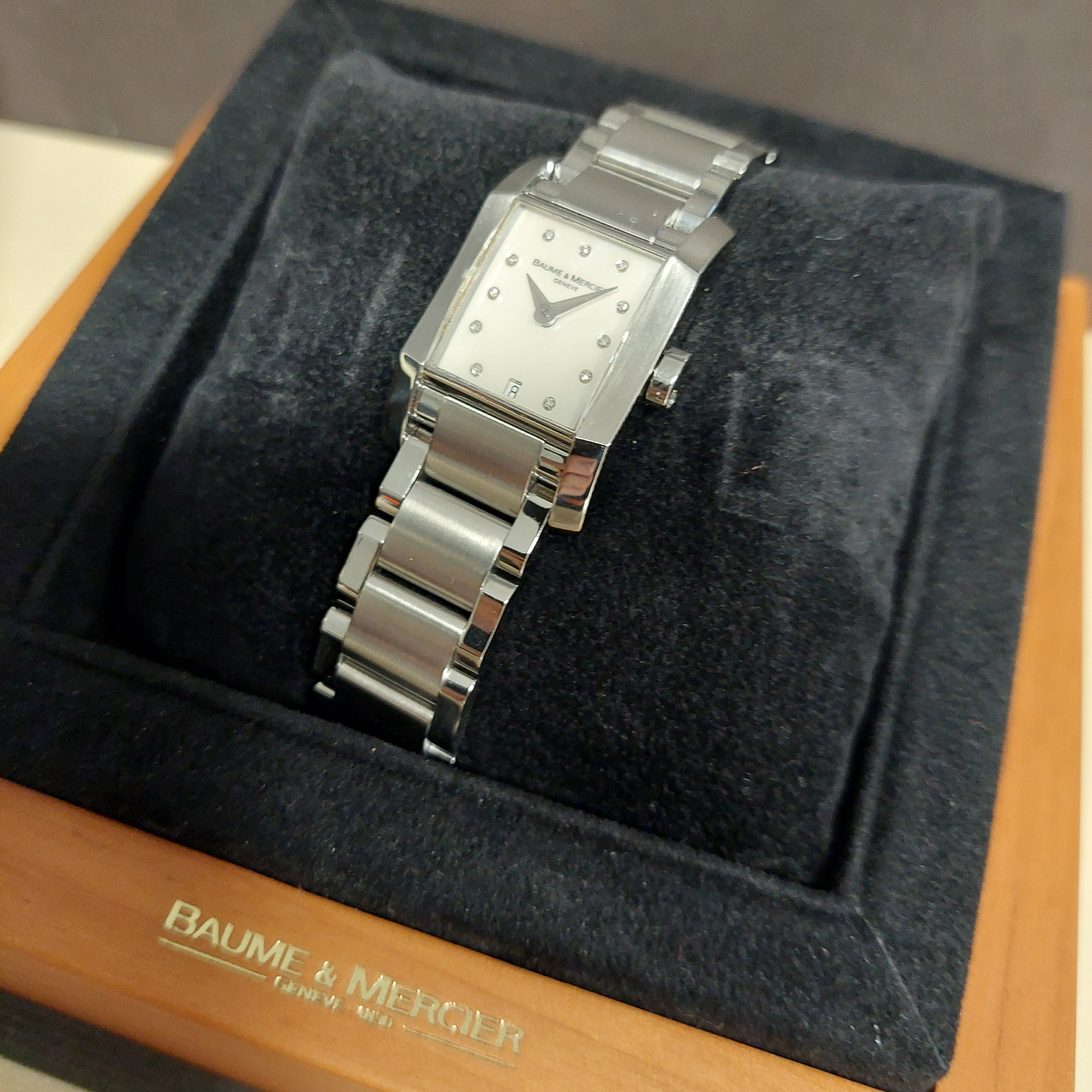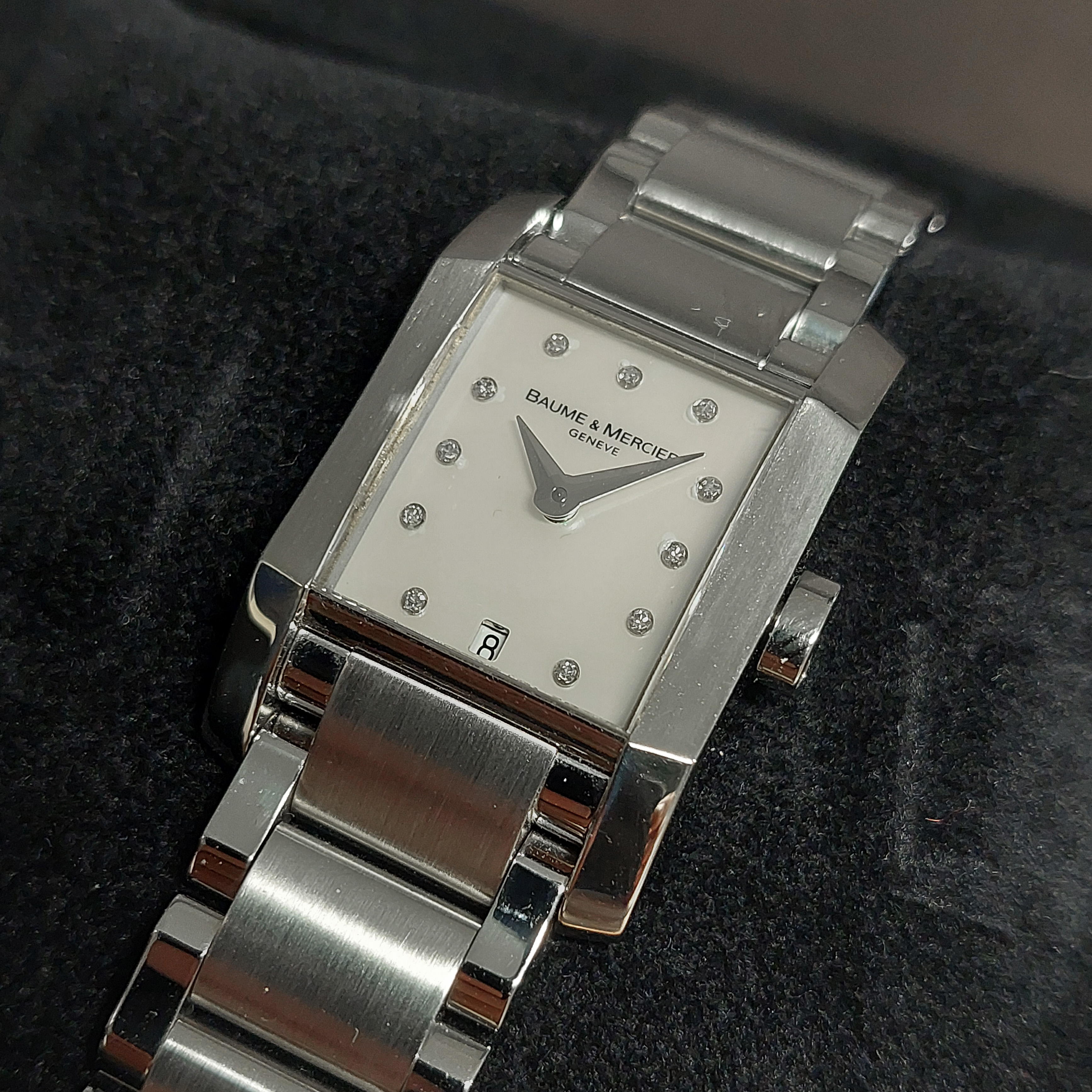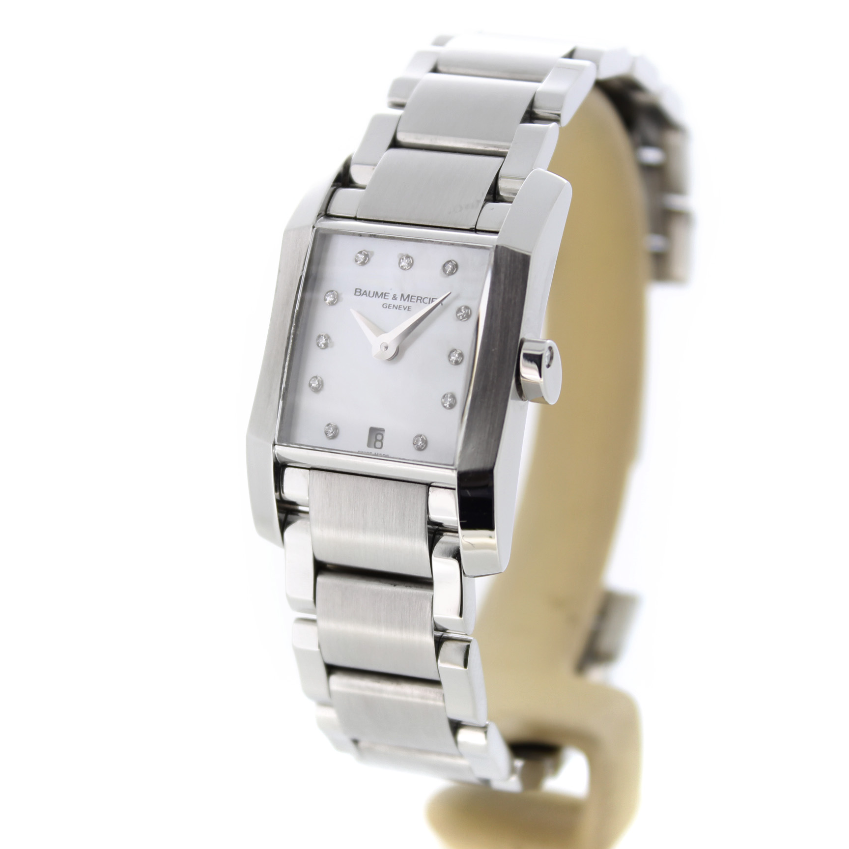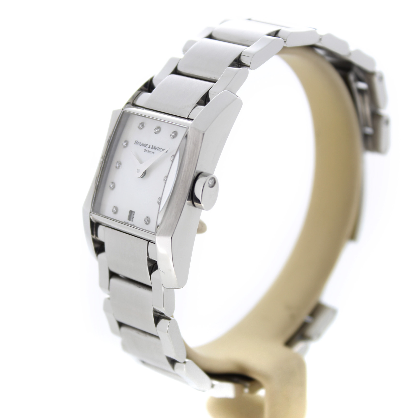 Het tweedehands Baume & Mercier Hampton M0A08573 horloge is een quartz en heeft een zilverkleurige staal kast en band. De wijzerplaat heeft een parelmoer kleur met diamanten op de indexen en wordt beschermd met een saffier glas.