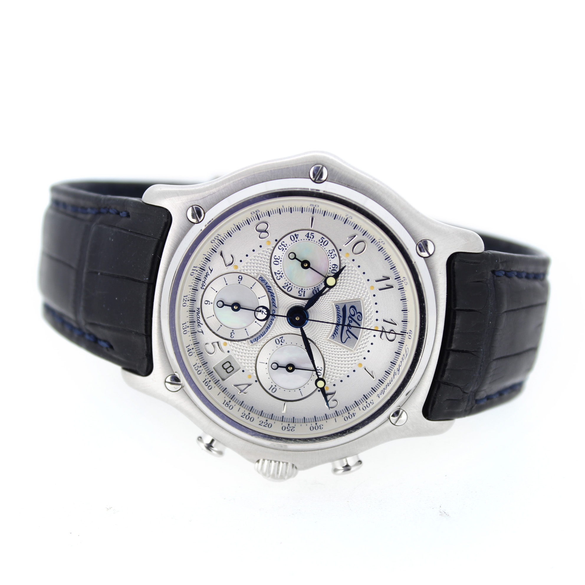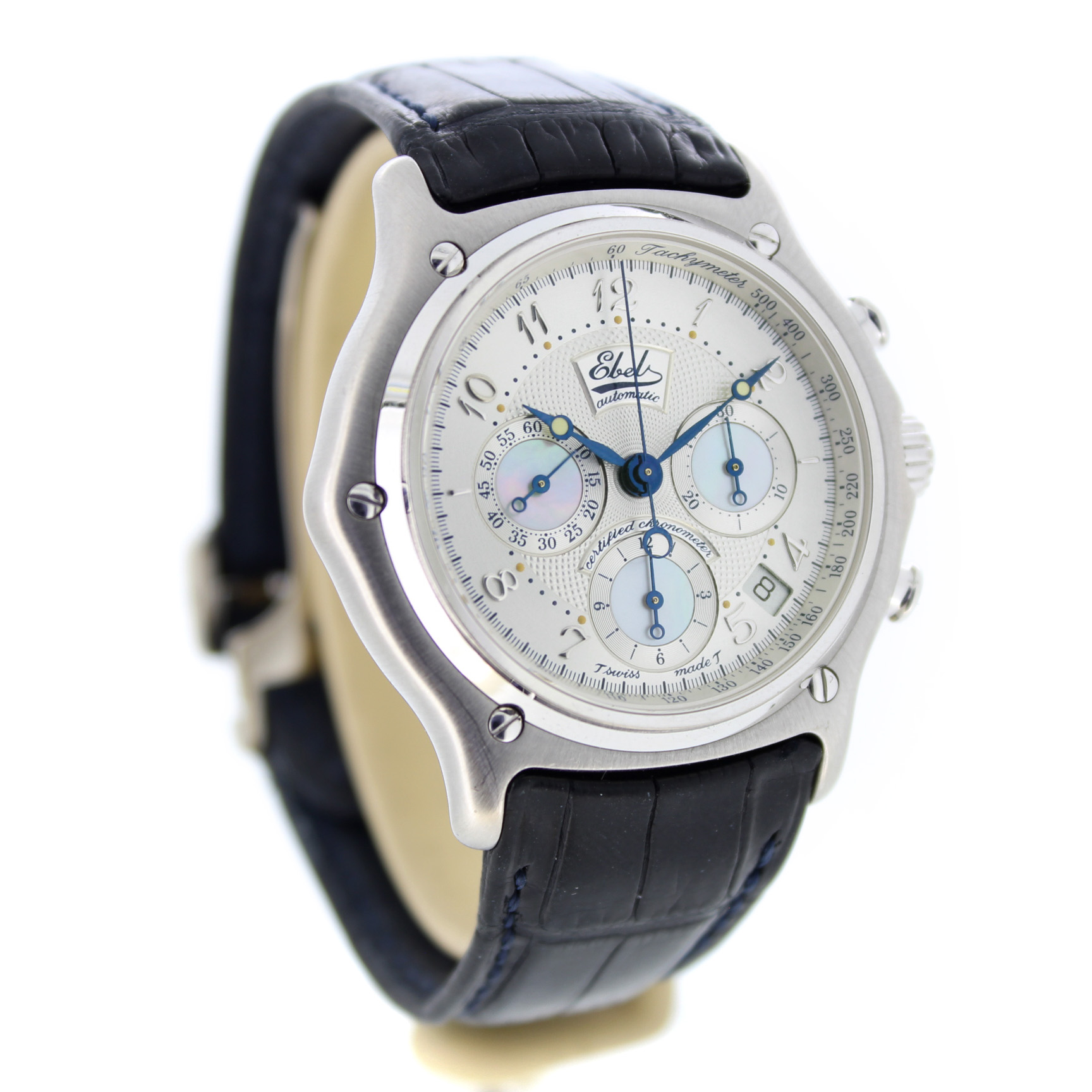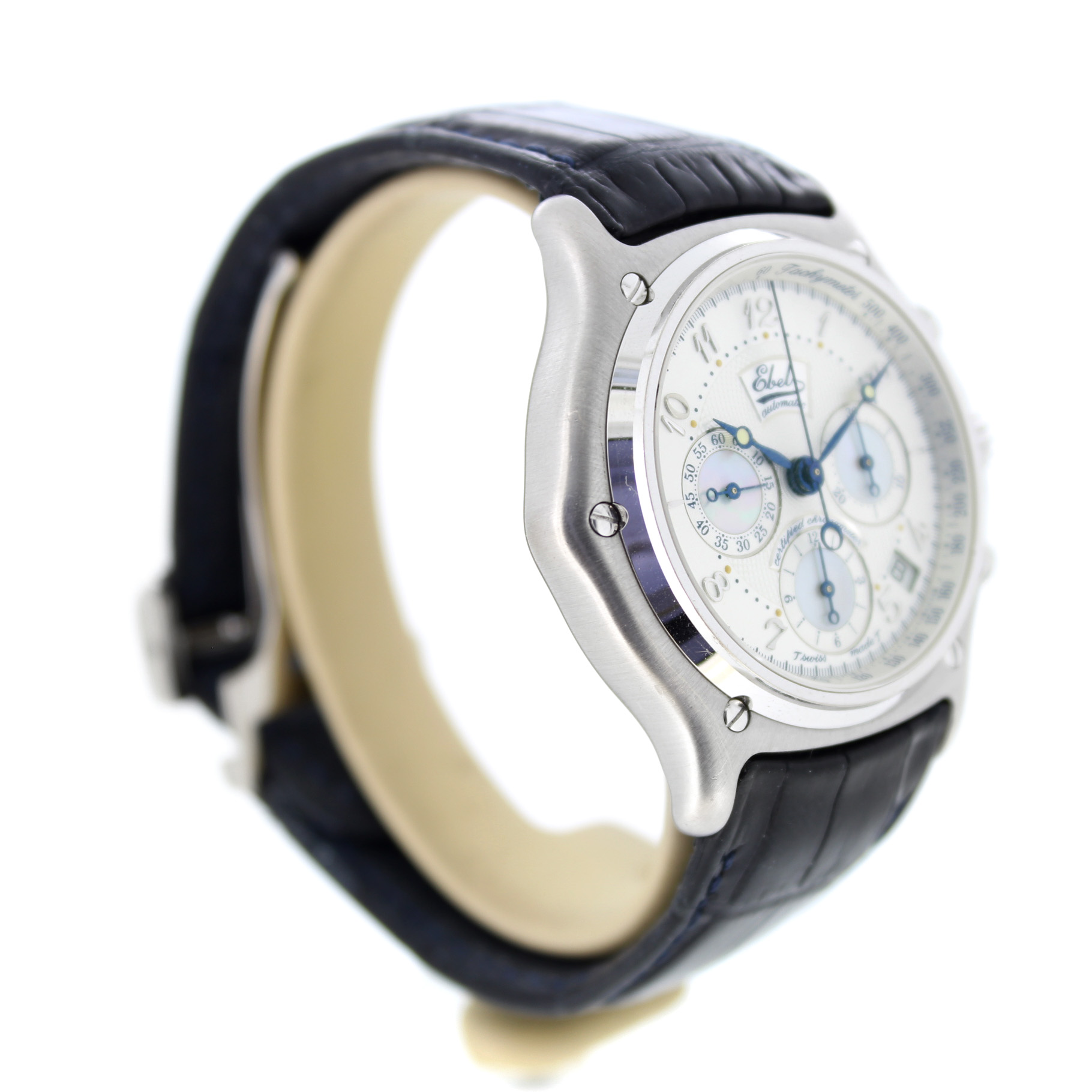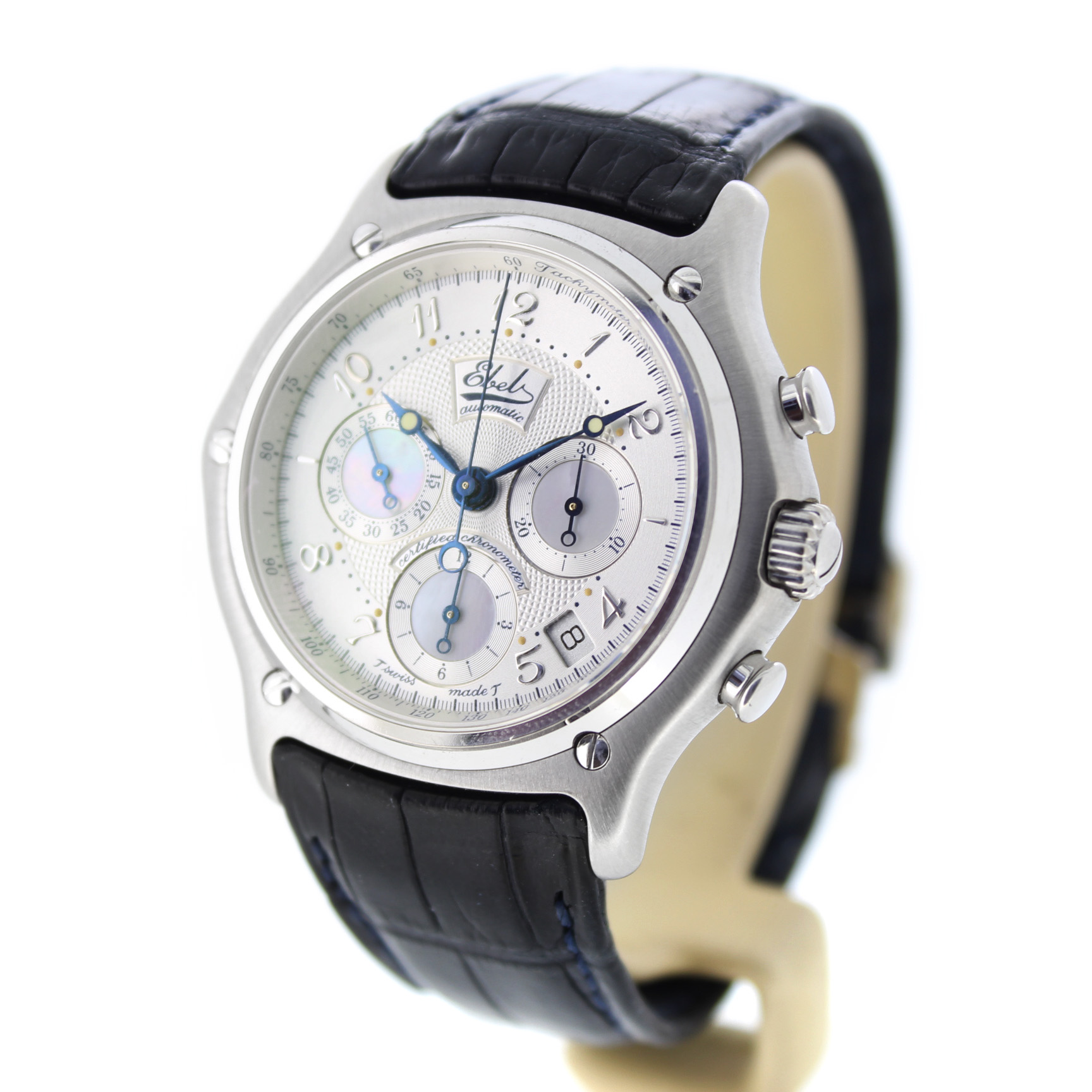 Het tweedehands Ebel Le Modulor Automatic E3137240 horloge heeft een 18 karaat witgouden kast en zwart leren band. De wijzerplaat is zilverkleurig en heeft een chronograaf en datum aanduiding tussen 4 en 5 uur.
