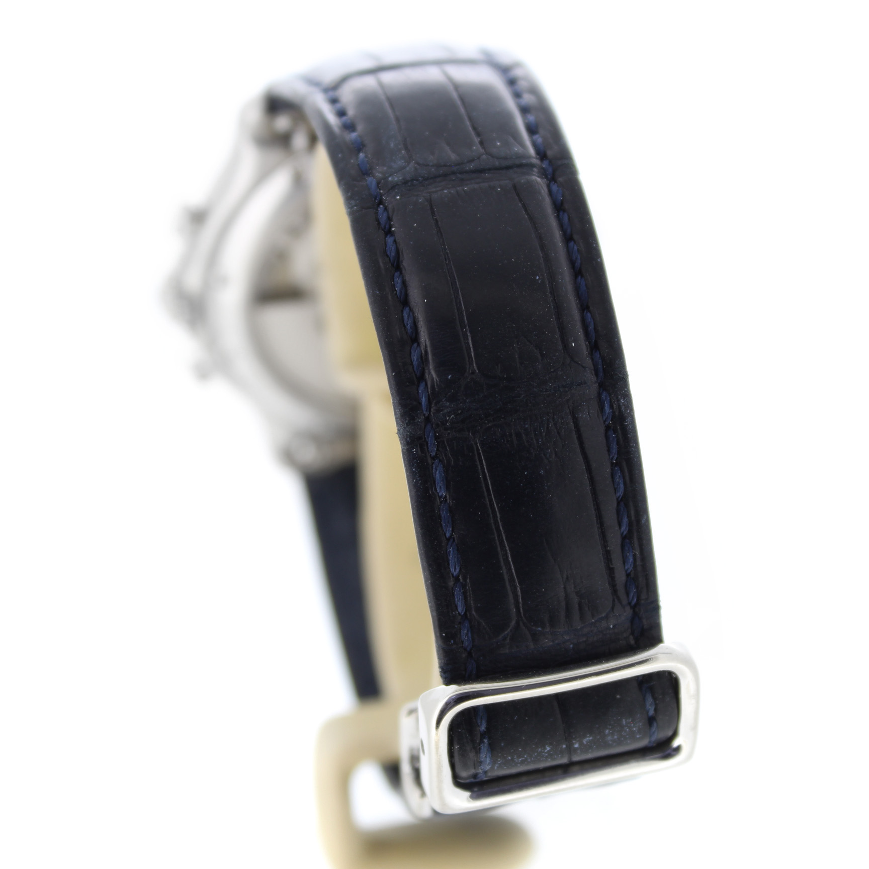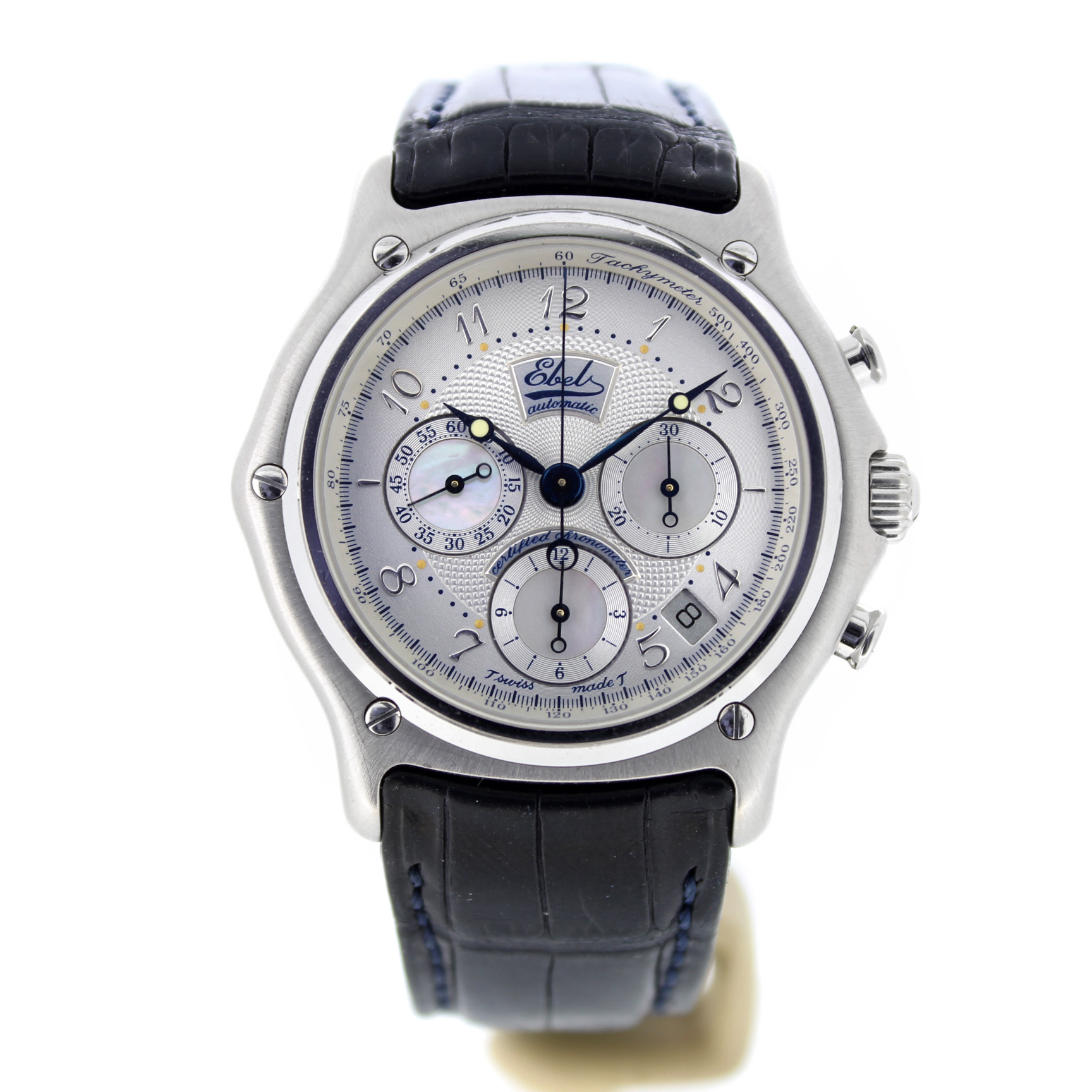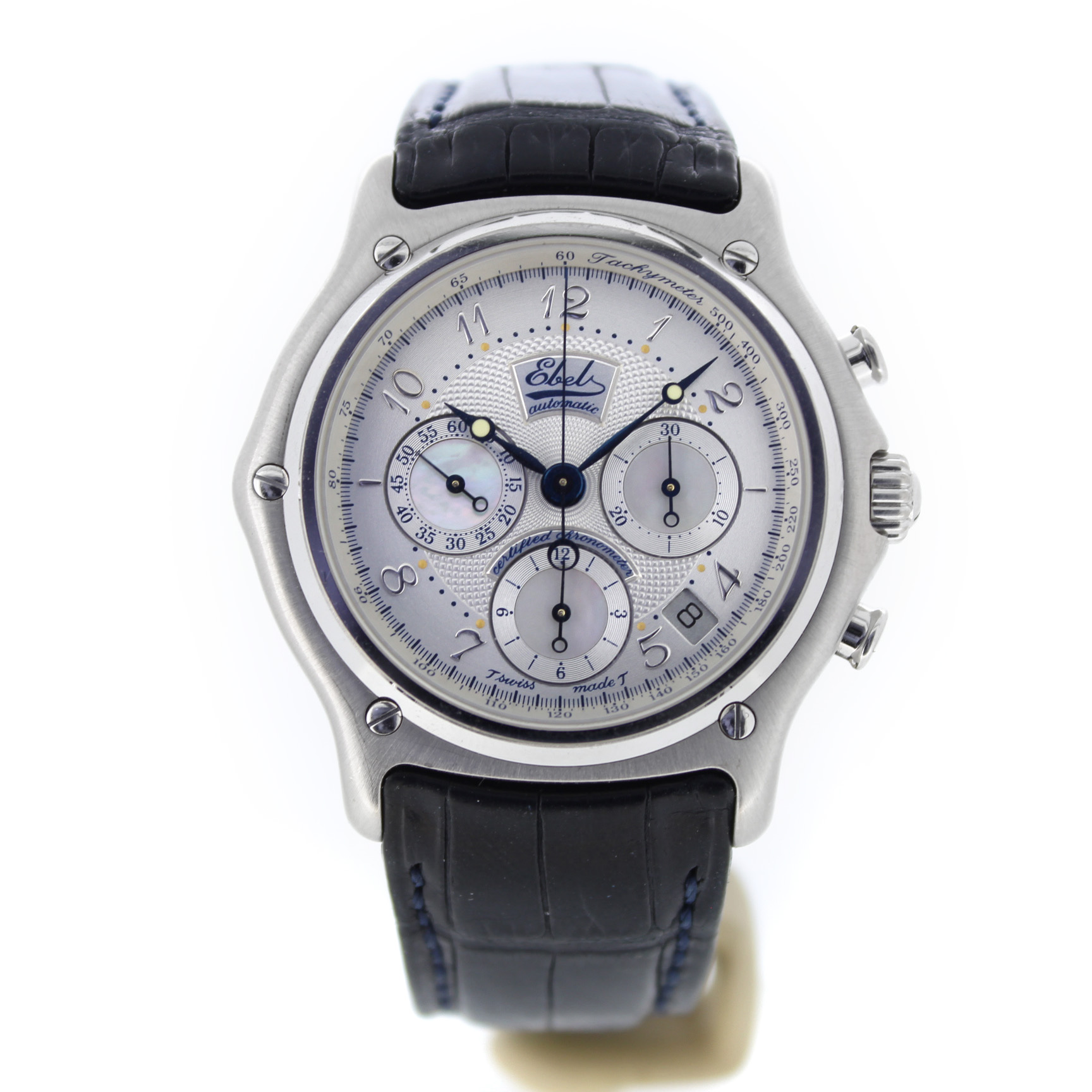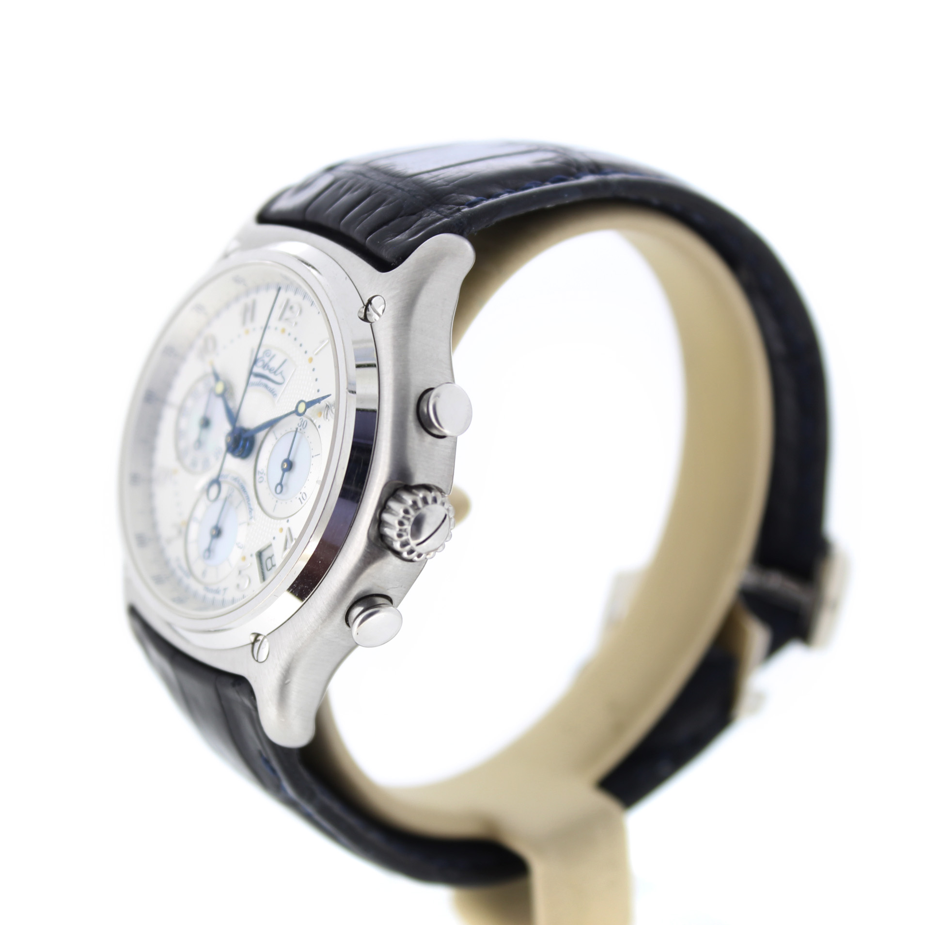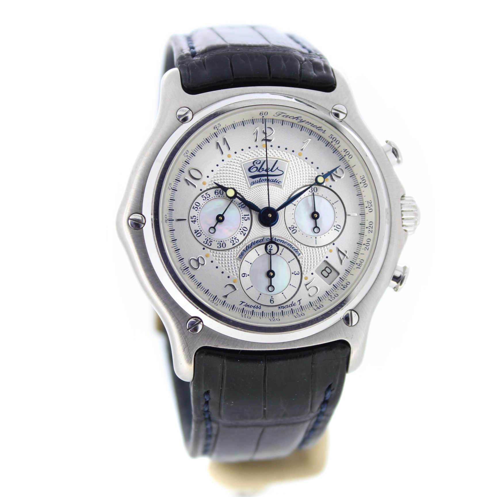 Het tweedehands Ebel Le Modulor Automatic E3137240 horloge heeft een 18 karaat witgouden kast en zwart leren band. De wijzerplaat is zilverkleurig en heeft een chronograaf en datum aanduiding tussen 4 en 5 uur.