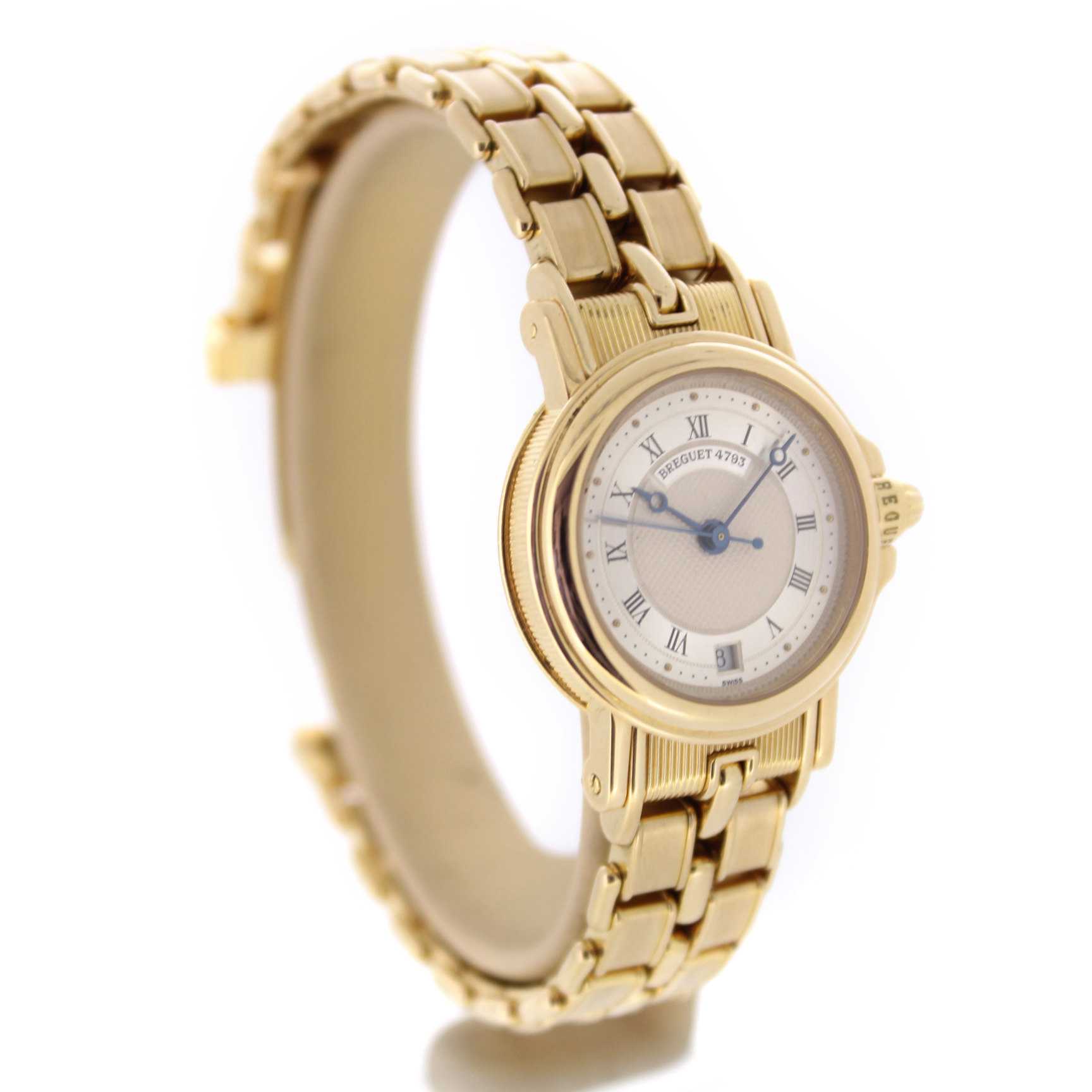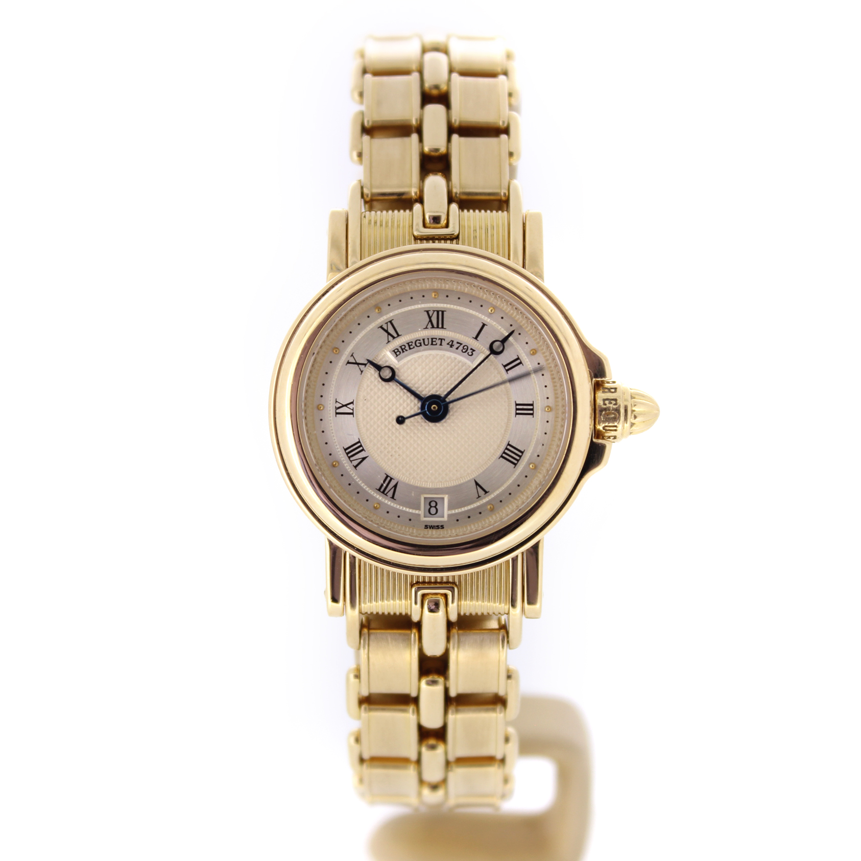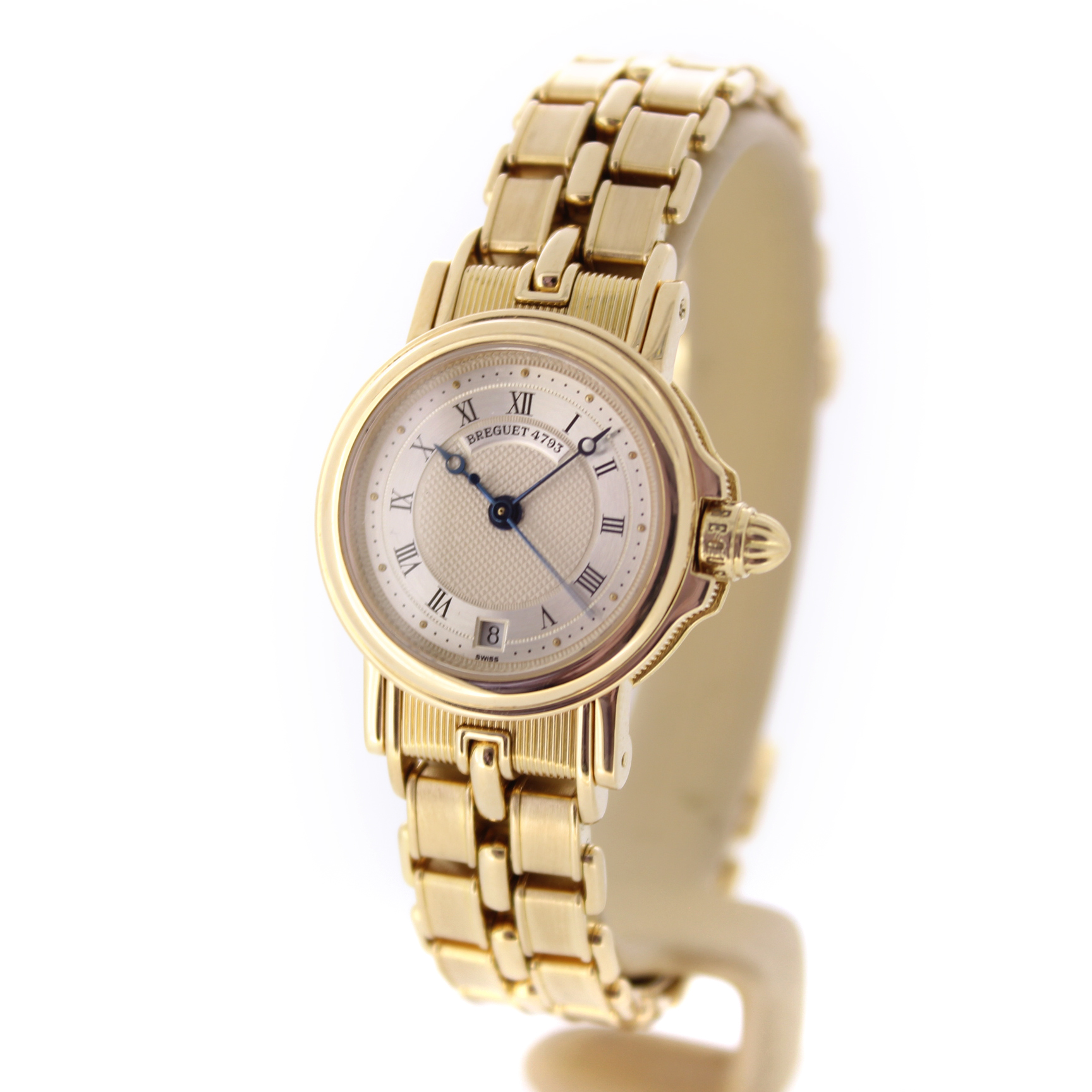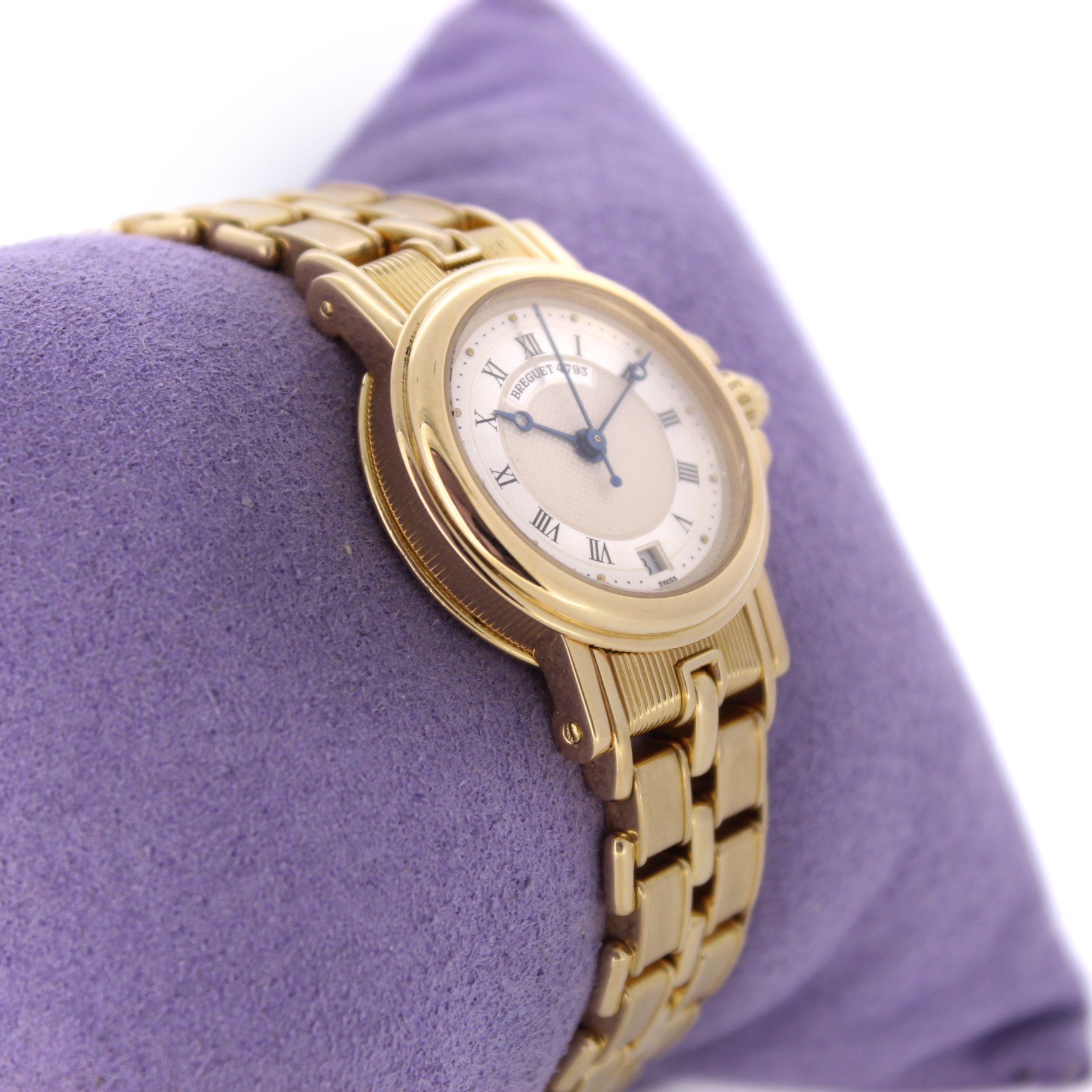 Het pre-owned Breguet Marine Ladies 8400BA/12/A40 horloge, is vervaardigd uit een 26mm 18 karaat geelgouden kast en band. Het horloge beschikt over een zilverkleurige wijzerplaat met een datum aanduiding.