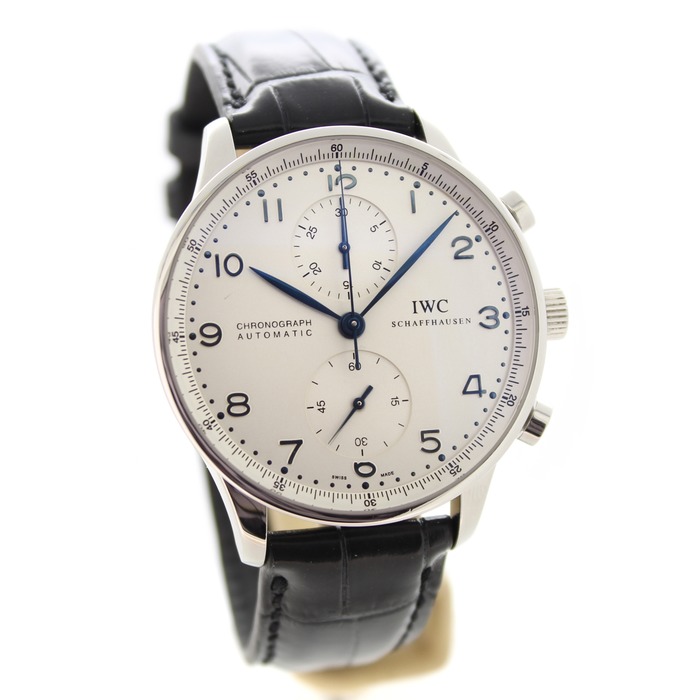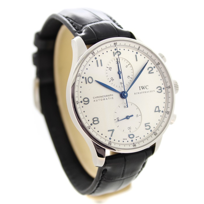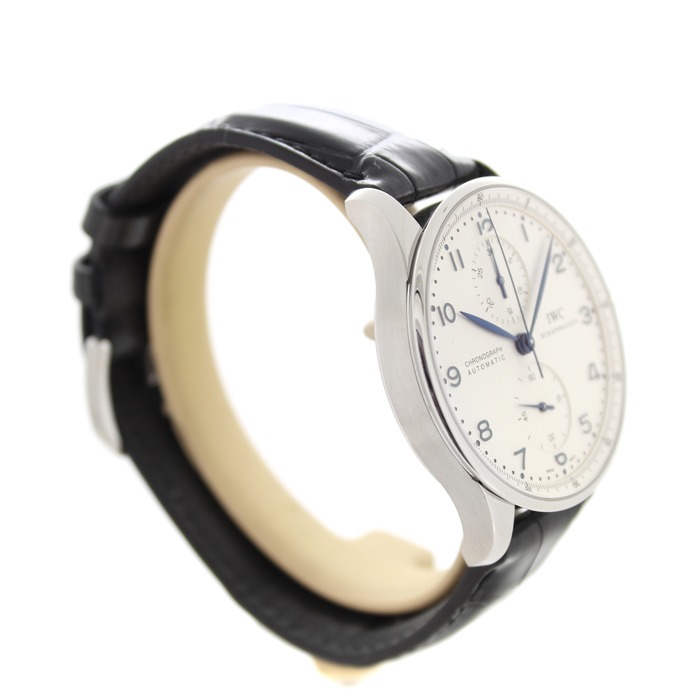 Het tweedehands IWC Portuguese IW371417 horloge heeft een 41 mm staal kast en zwart leren band. De witte wijzerplaat is beschermd door een saffierglas.