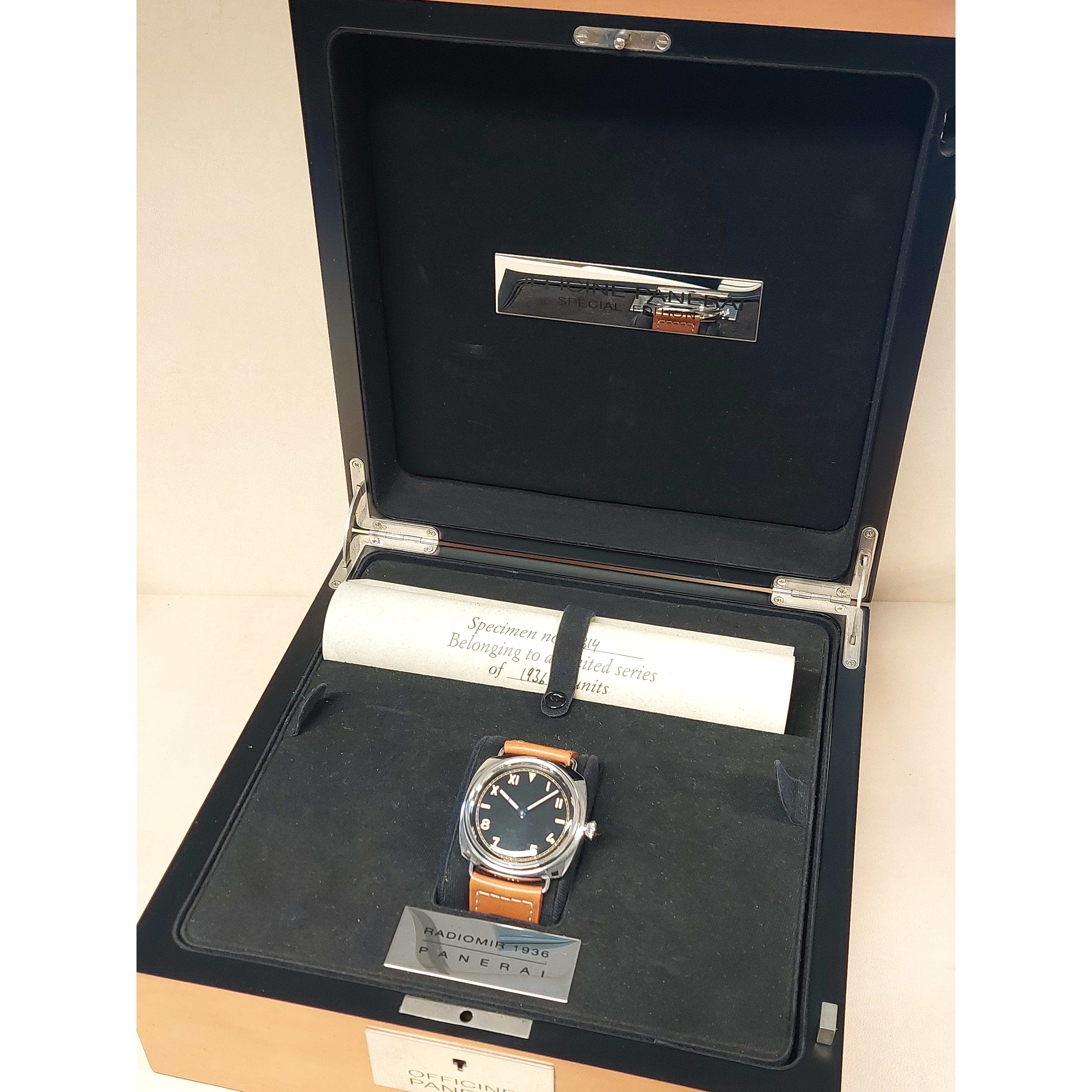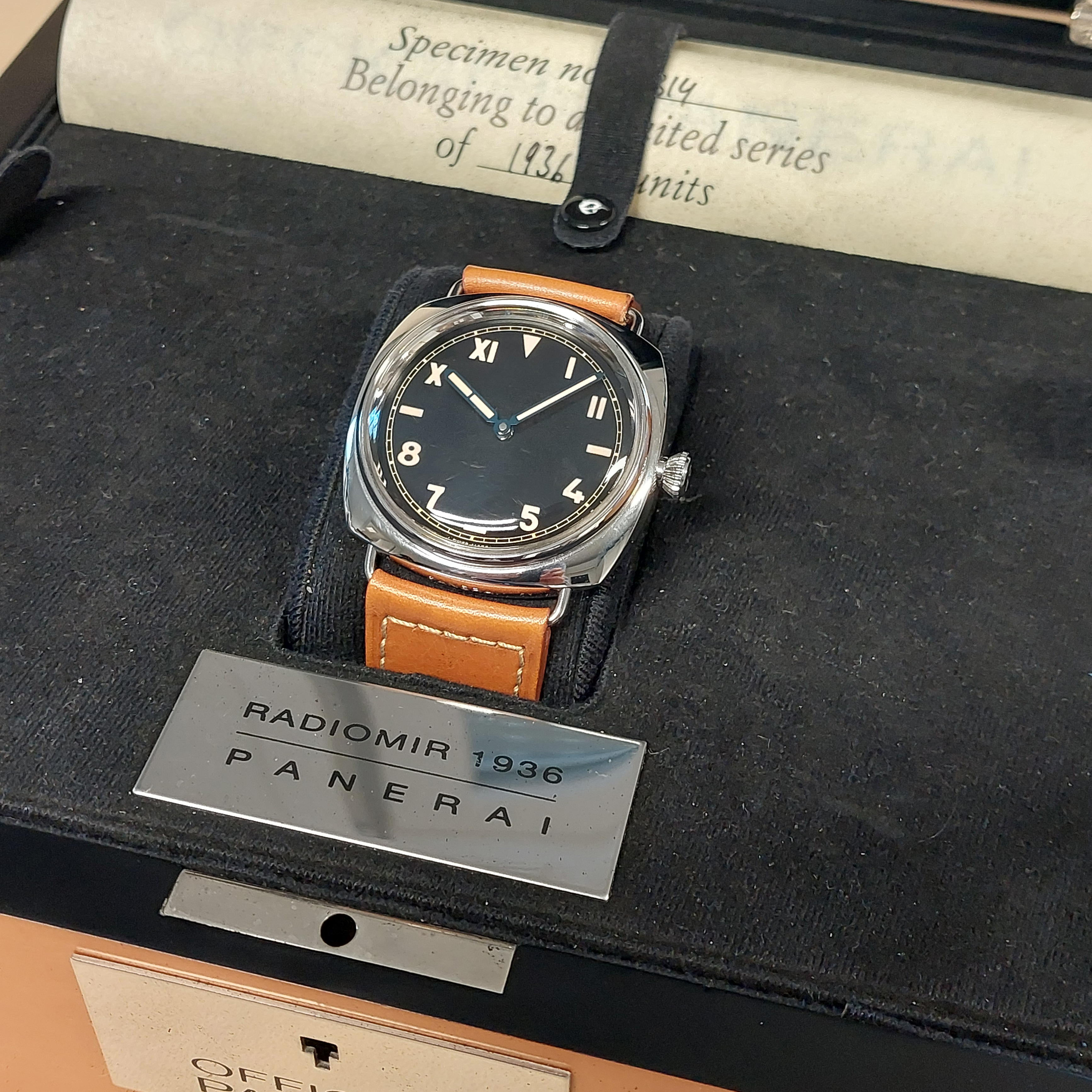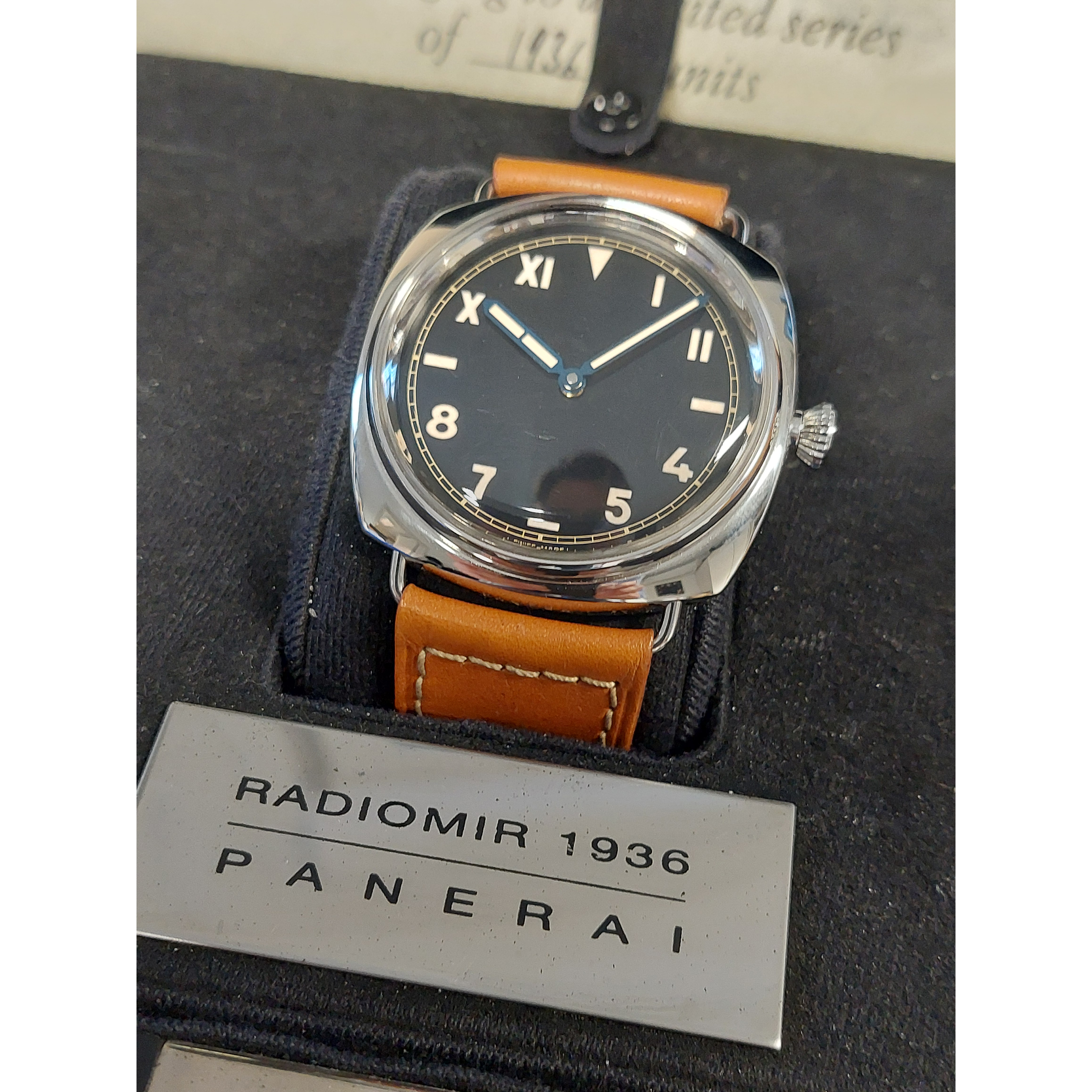 De pre-owned Panerai Radiomir 1936 Limited PAM 00249 horloge heeft een 47mm staal kast en bruin leren band en een zwarte wijzerplaat.